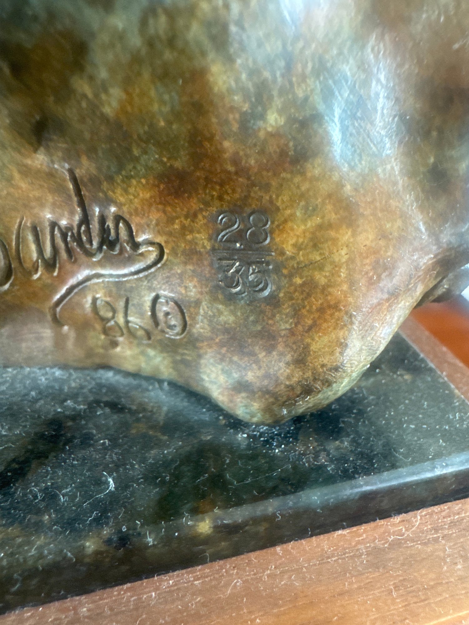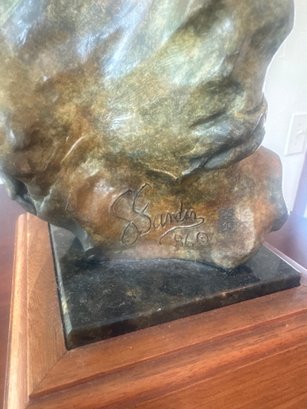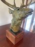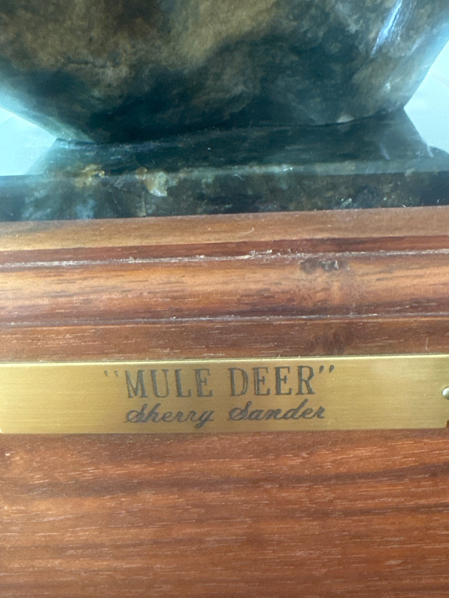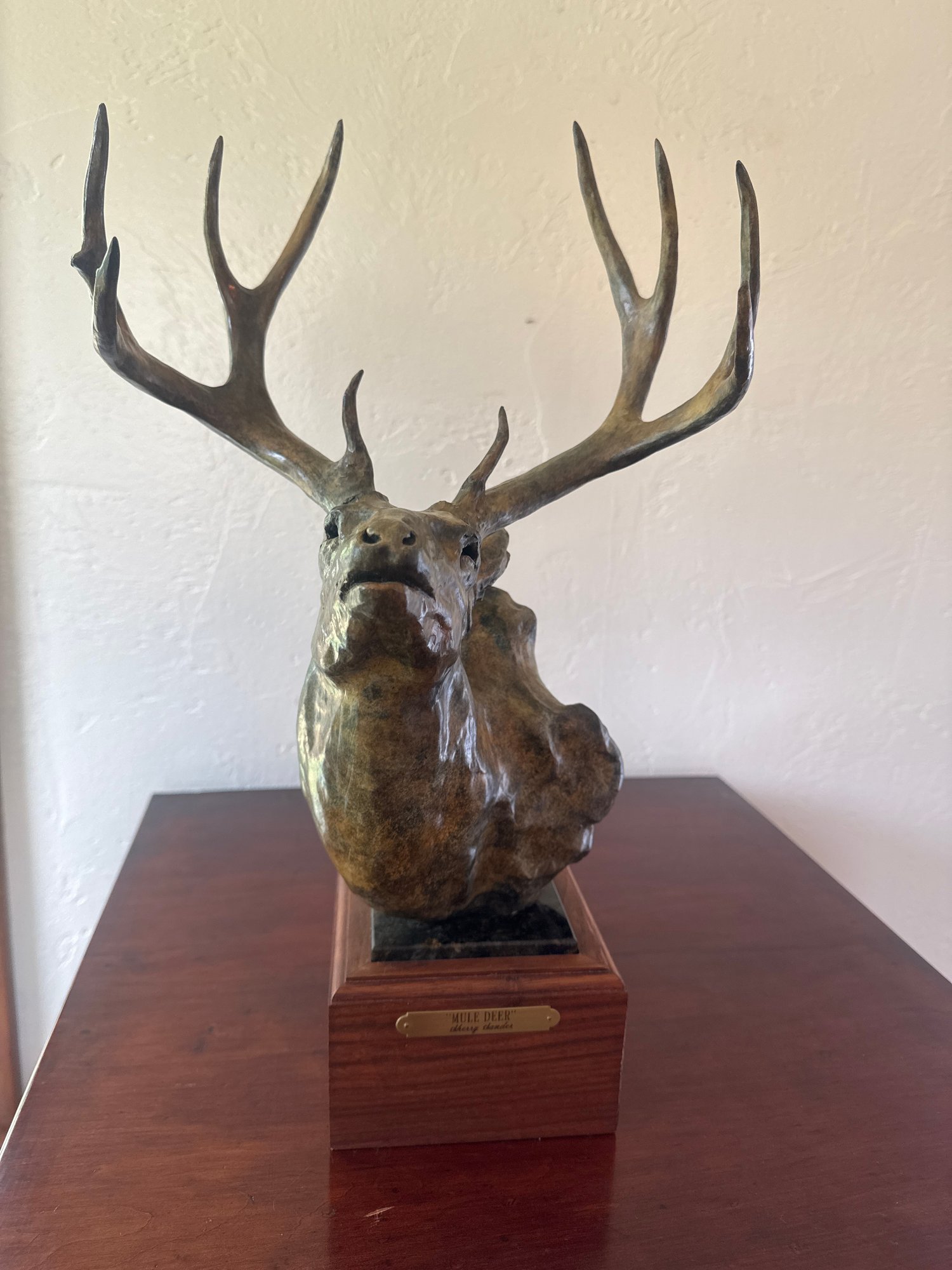 This item is a bronze sculpture of an elk bust created by artist Sherry Salari Sander, specifically identified as a cast from an edition of 35. 28/35. The sculpture is mounted on a wooden base. Local pickup or courier shipping available – please see shipping terms for details.