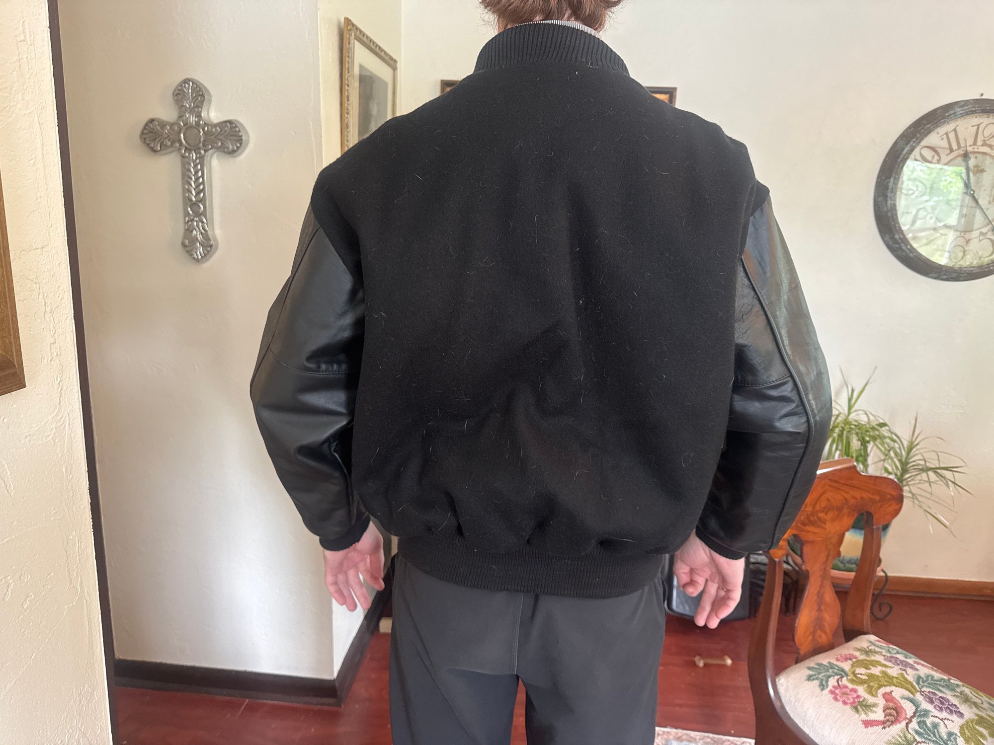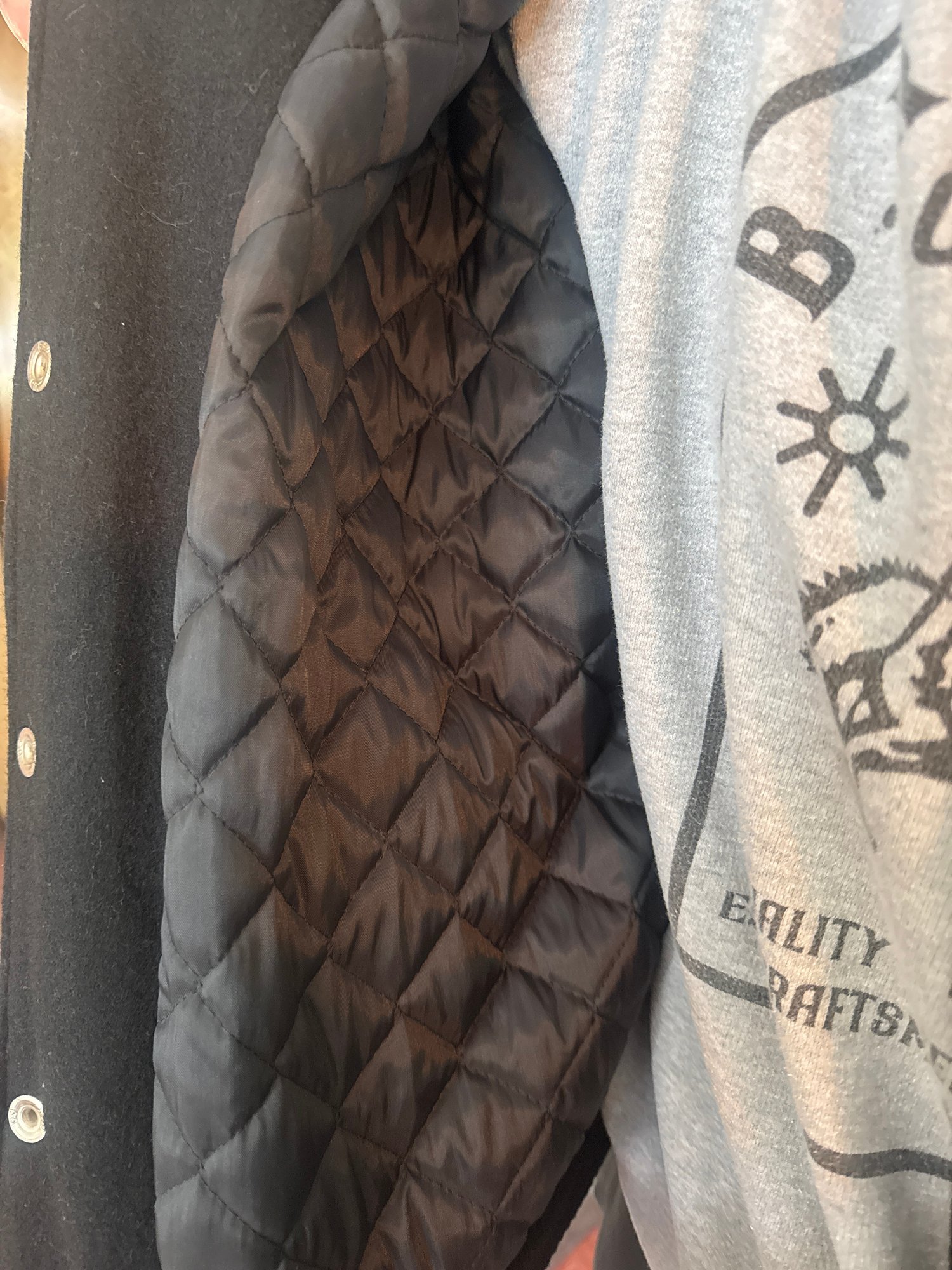 Leather and wool bomber jacket. Quilted lining. Excellent condition. Size large. Local pickup or courier shipping available – please see shipping terms for details.