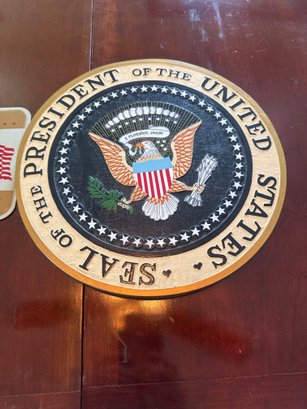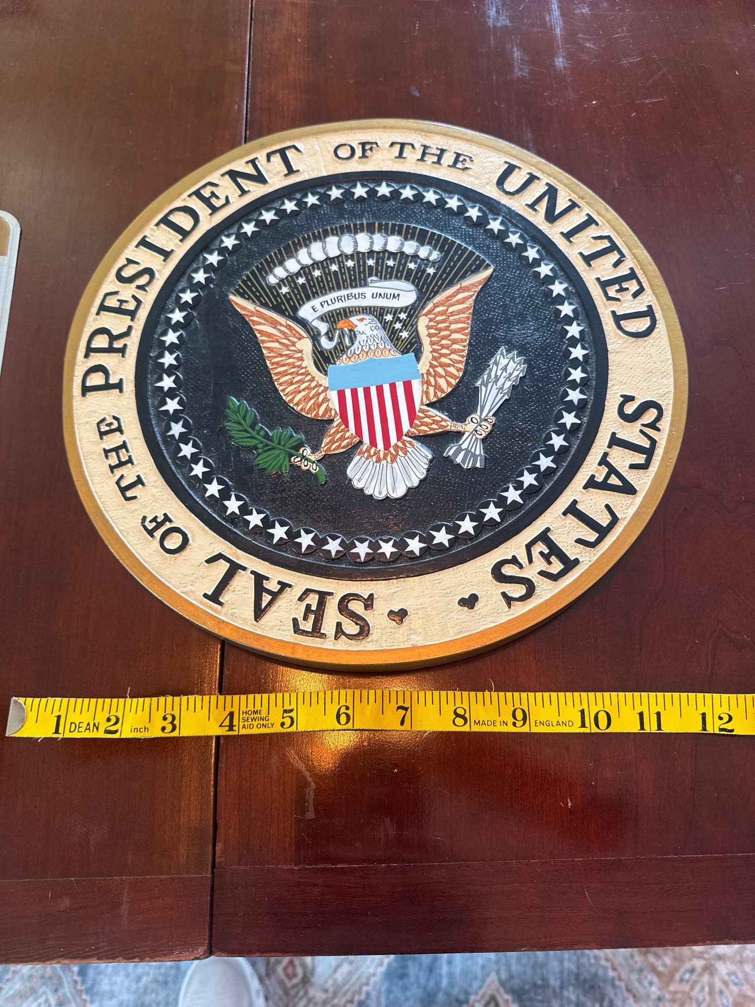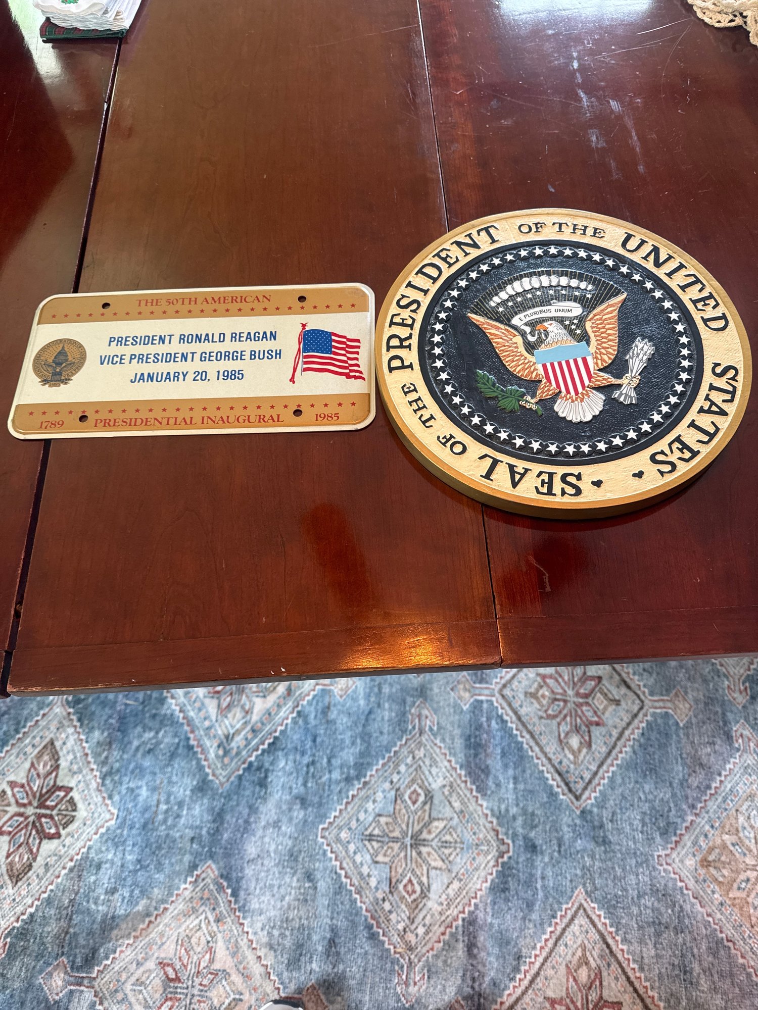 Our client’s brother was a White House intern during the Reagan administration. Wood presidential seal and vanity plate. Excellent condition. Local pickup or courier shipping available – please see shipping terms for details.