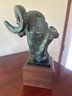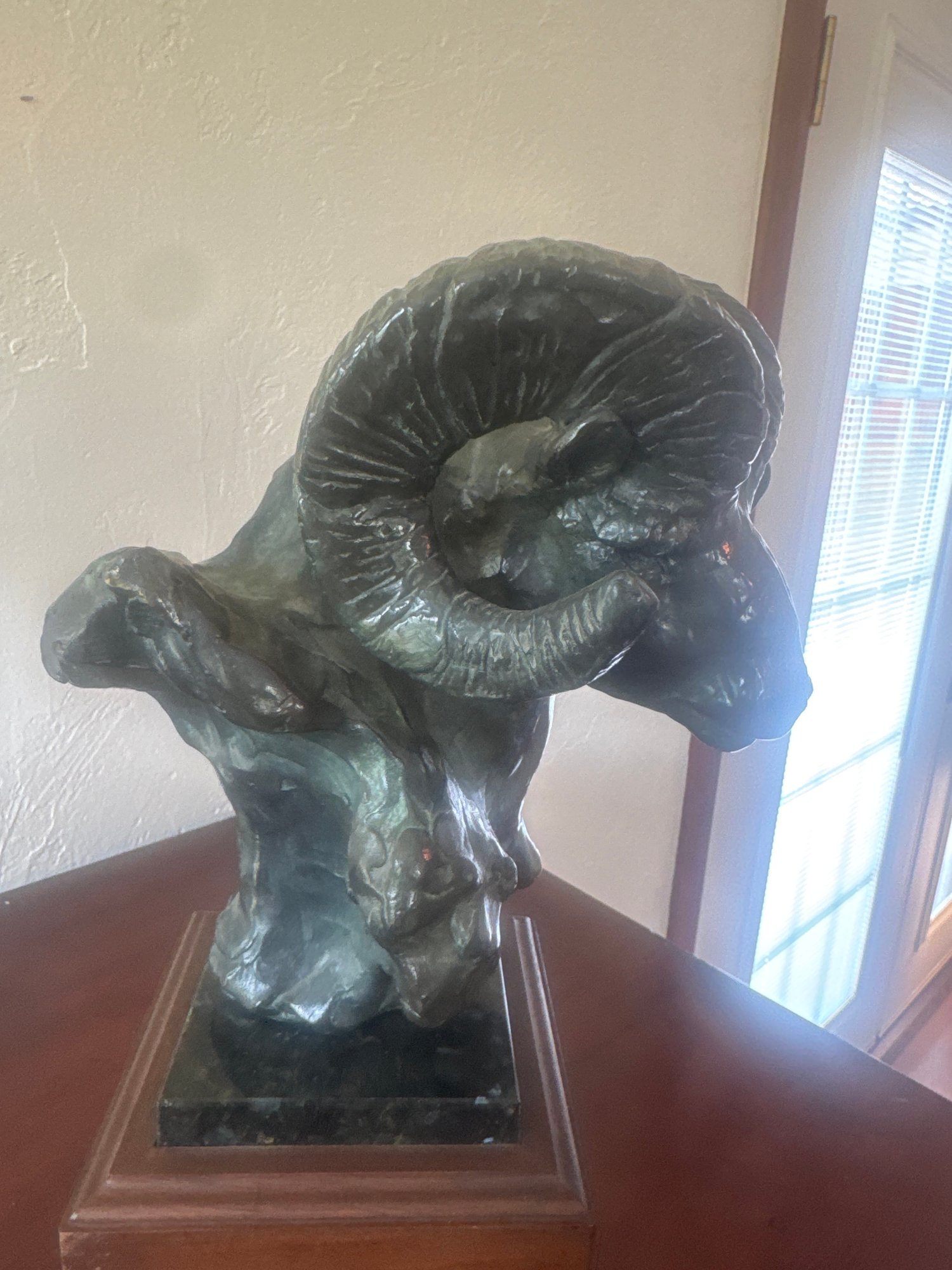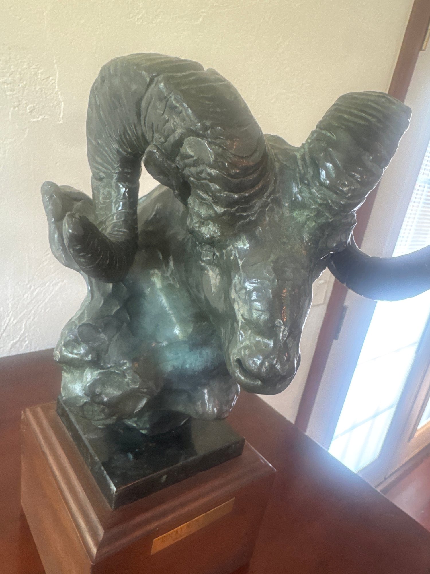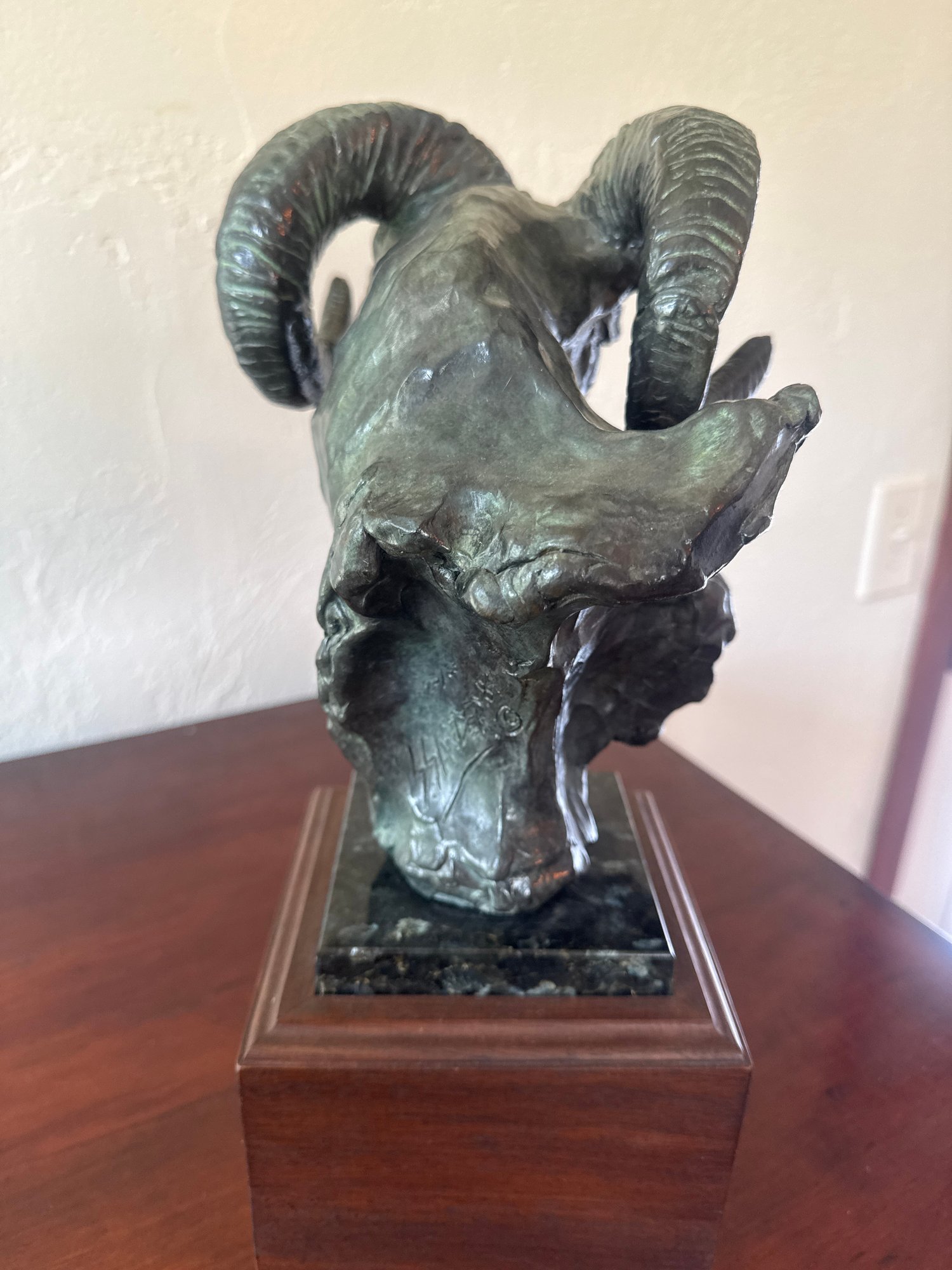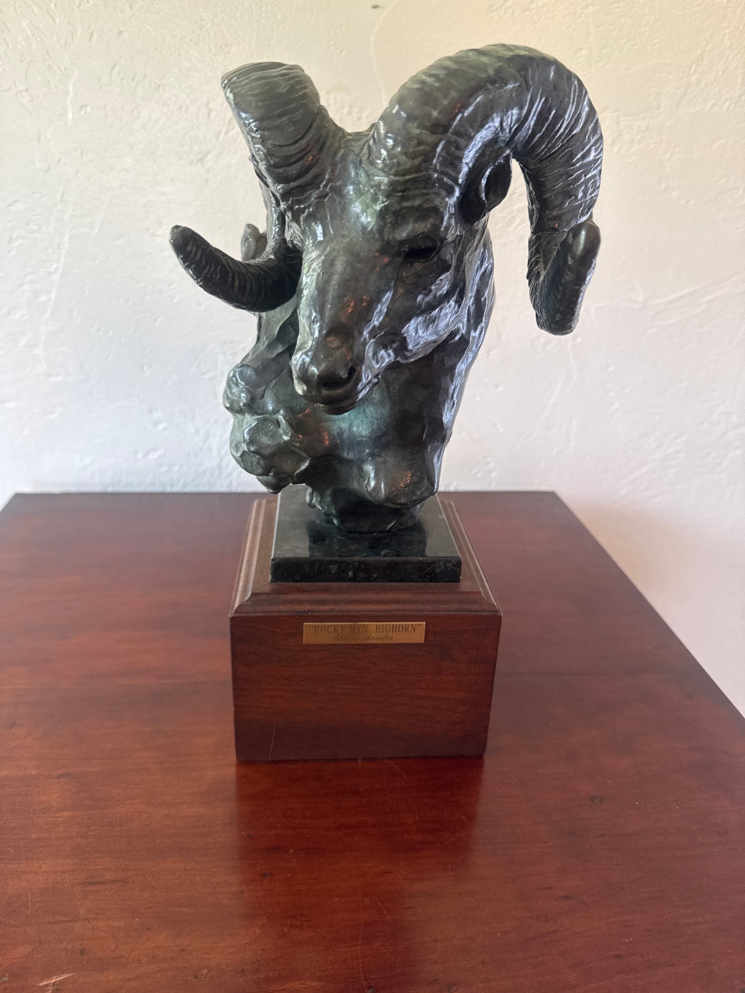 This item is a bronze sculpture of a bighorn created by artist Sherry Salari Sander, specifically identified as a cast from an edition of 35. 25/35. The sculpture is mounted on a wooden base. Local pickup or courier shipping available – please see shipping terms for details.