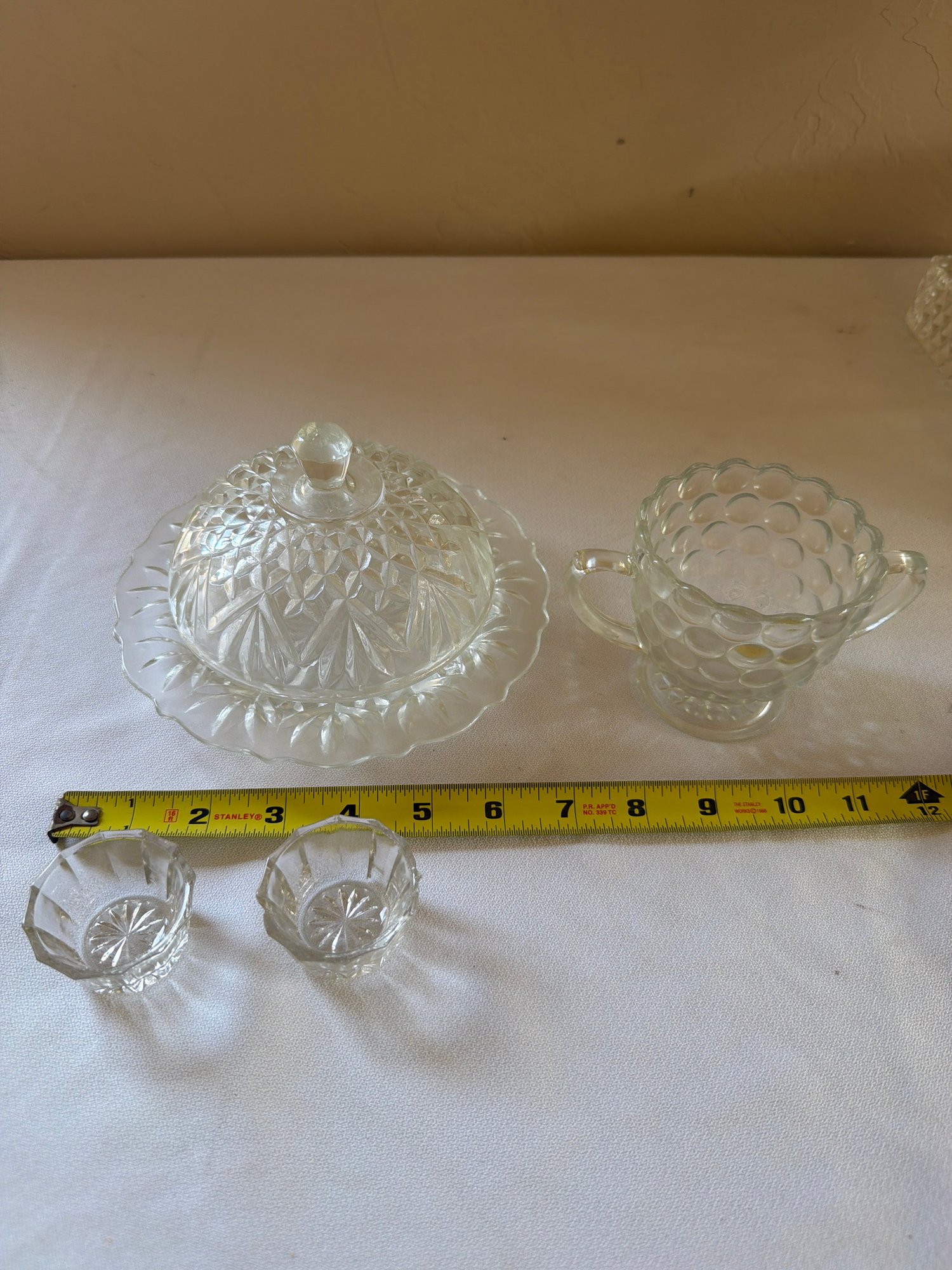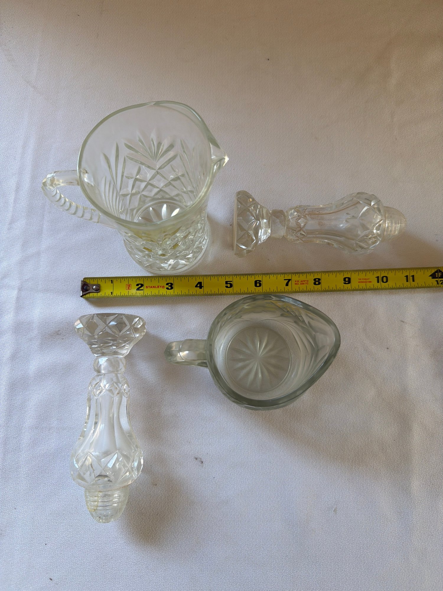 A beautiful assortment of crystal including pitchers, ornate candy bowl, cake platter, small candy bowl, and salt n pepper shakers. Good condition see photos! Local pickup or courier shipping available – please see shipping terms for details.
