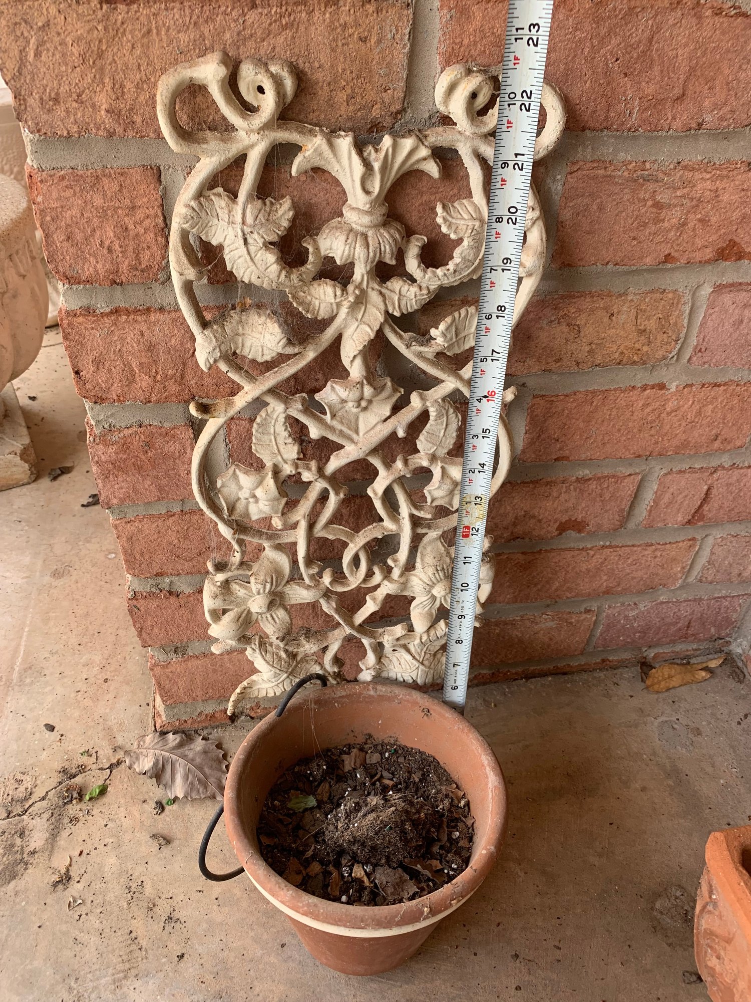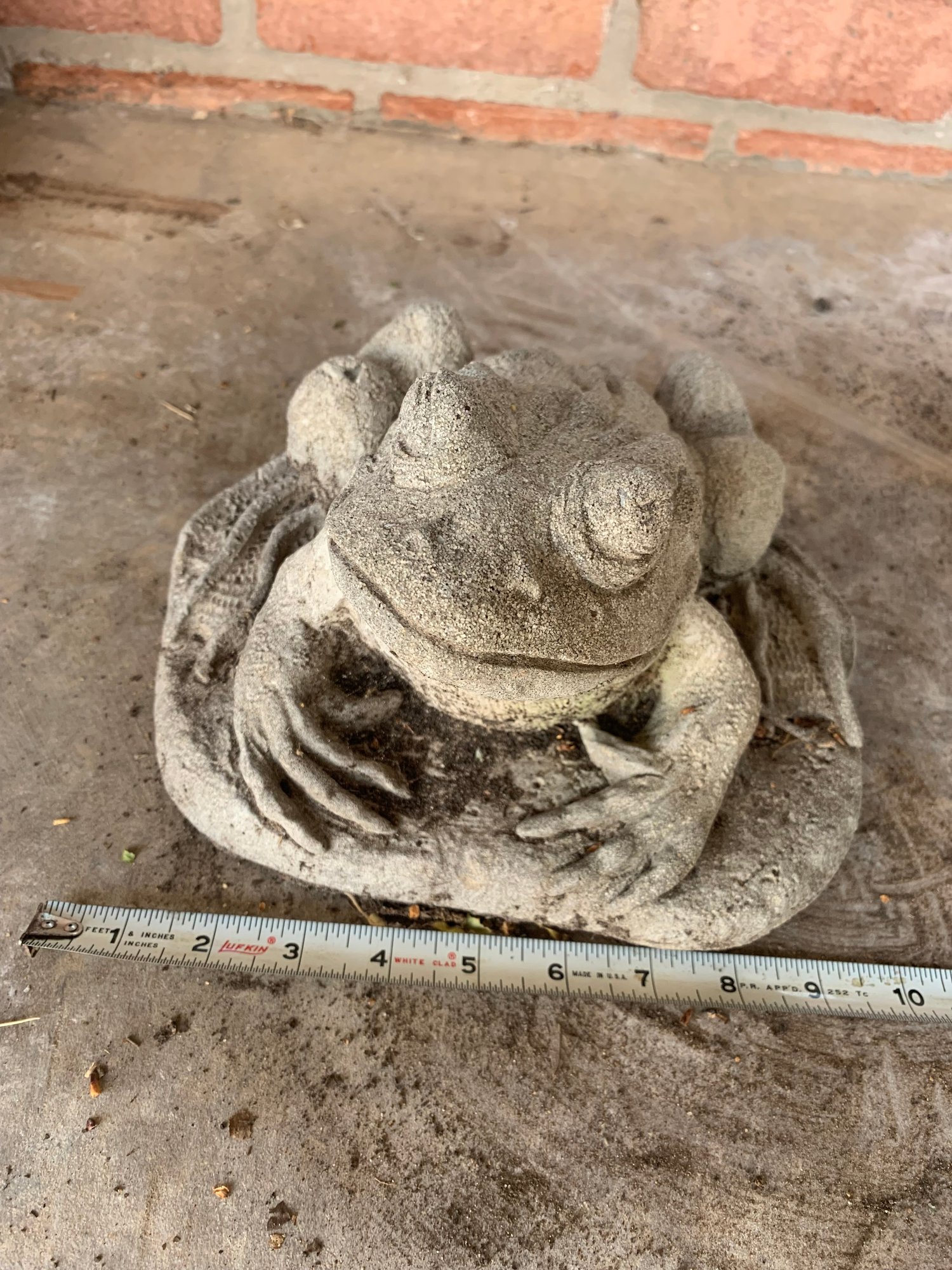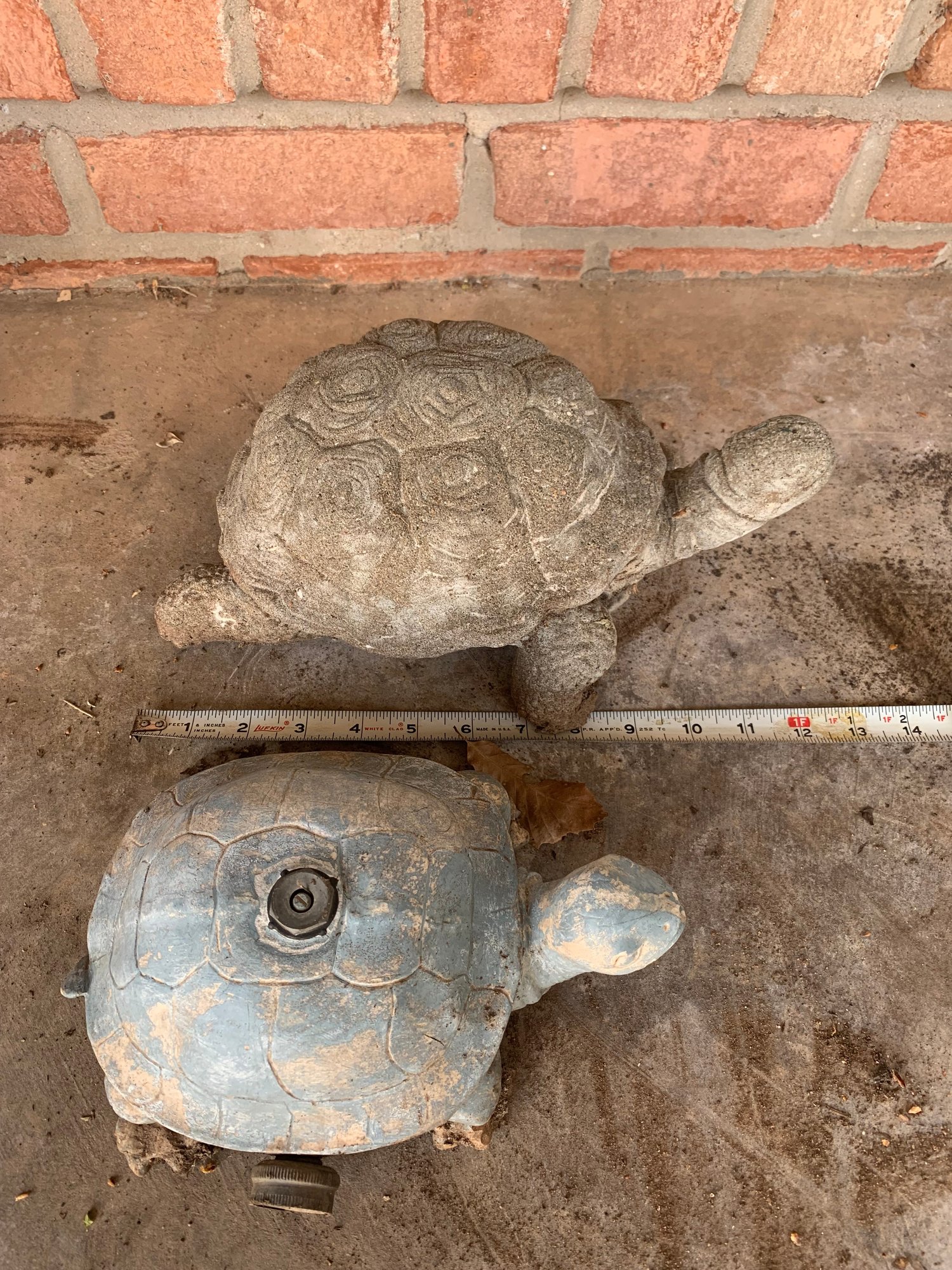 An assortment of small lawn decor - turtle and frog statues, turtle sprinkler, hanging pot, and rectangular pot. Sizes shown in photos. Local Pickup Only.