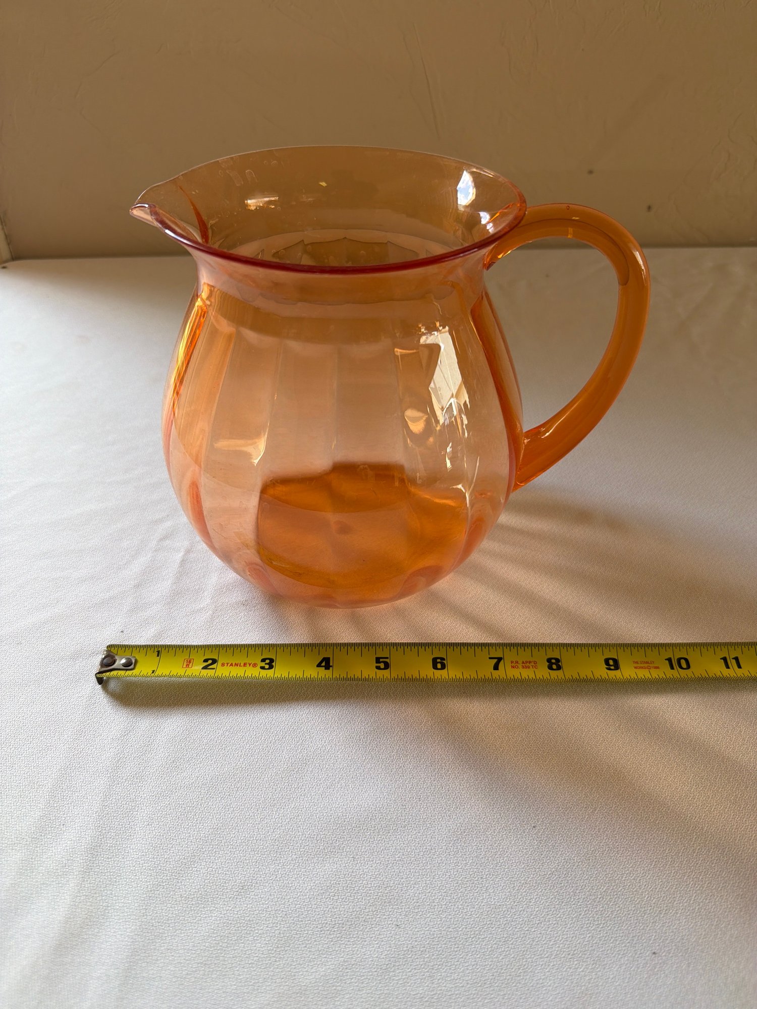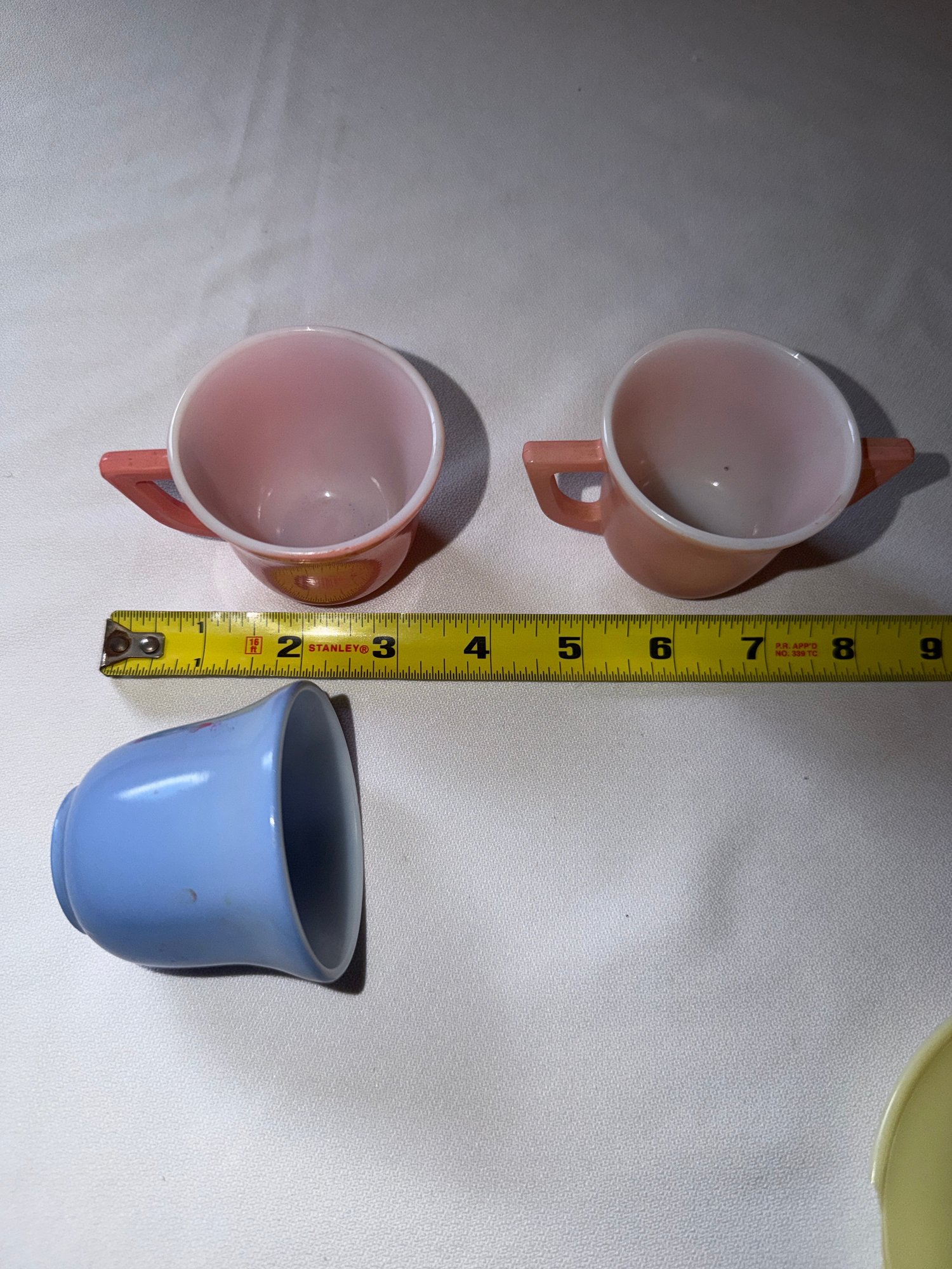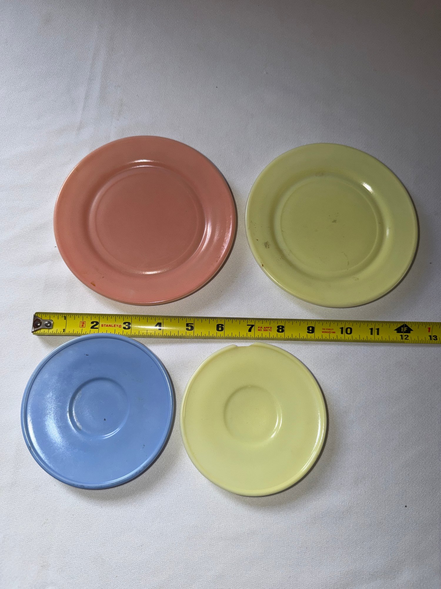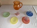 A wonderful and bright spring colored tea set! The blue and salmon have three pieces, the green and yellow have two, the pitcher is plastic. Good condition, see photos! Local pickup or courier shipping available – please see shipping terms for details.