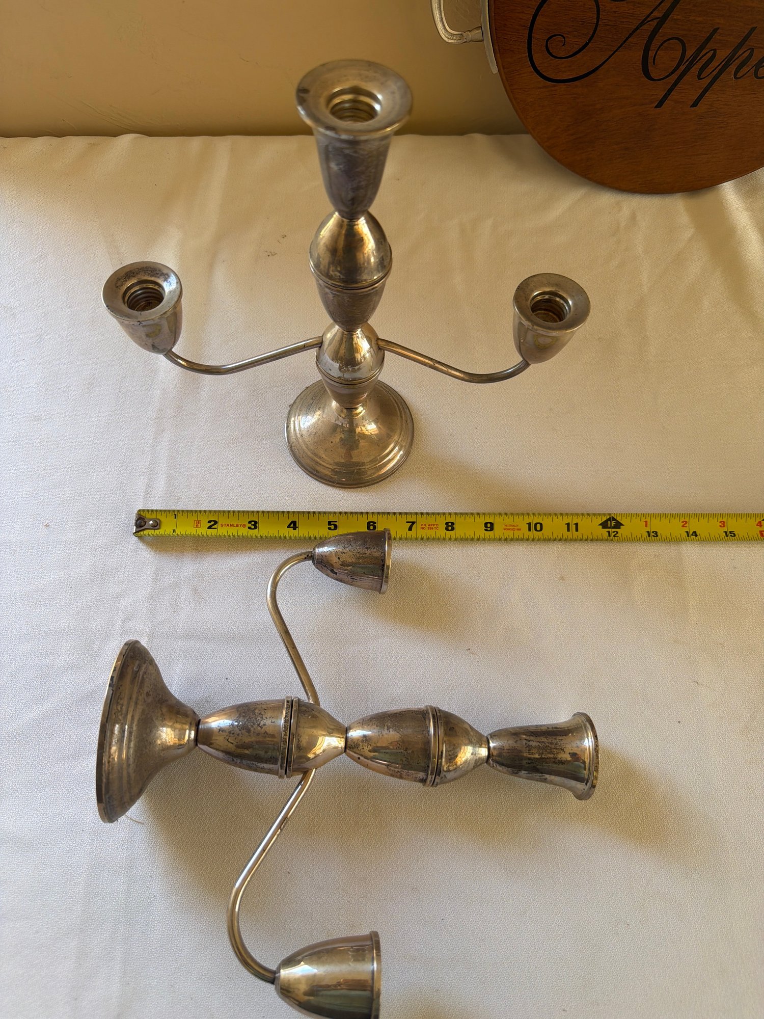 Two sturdy Sterling Silver candle holders and one wooden tray for any spread or charcuterie’s! Good condition see photos! Local pickup or courier shipping available – please see shipping terms for details.