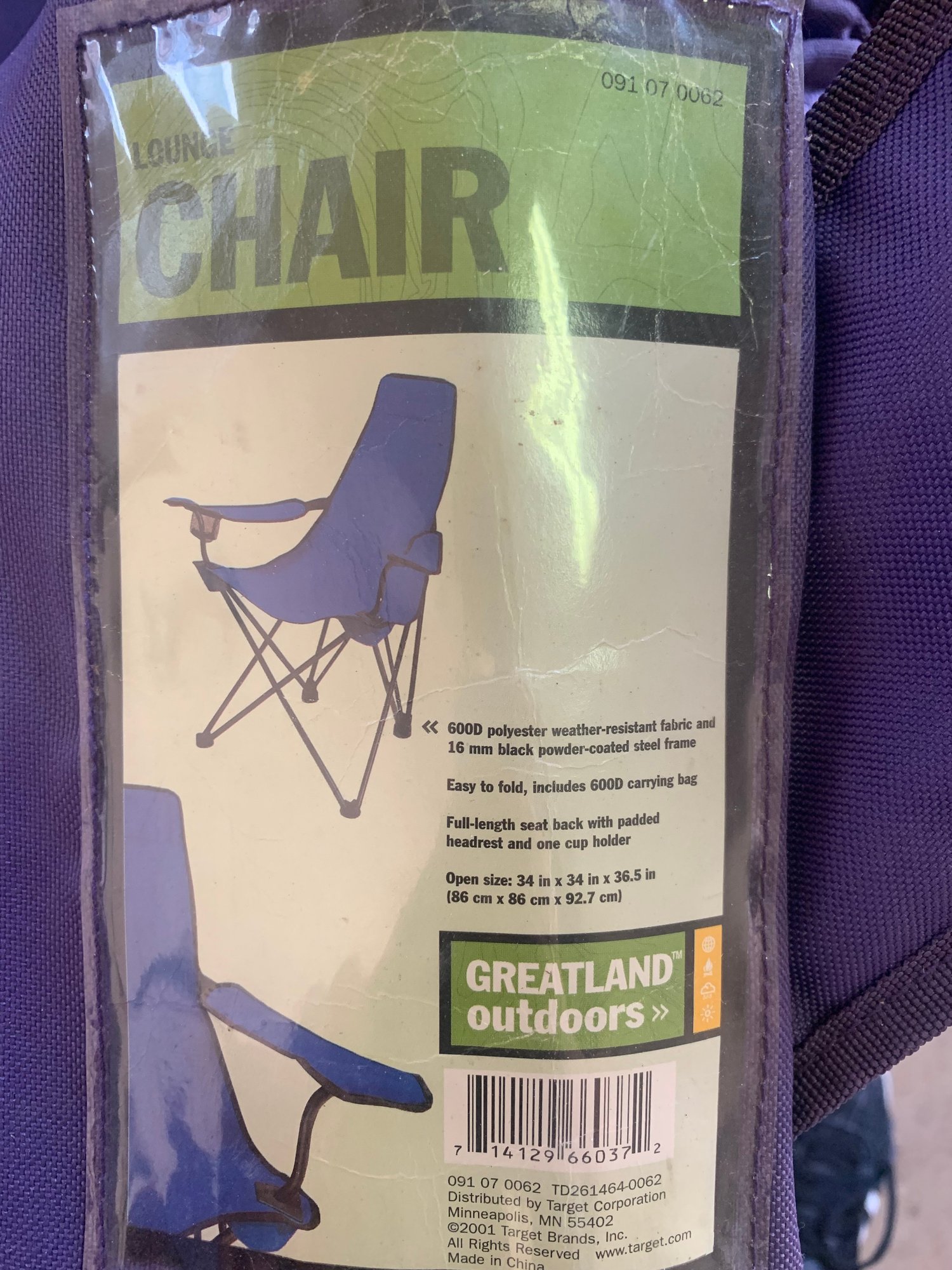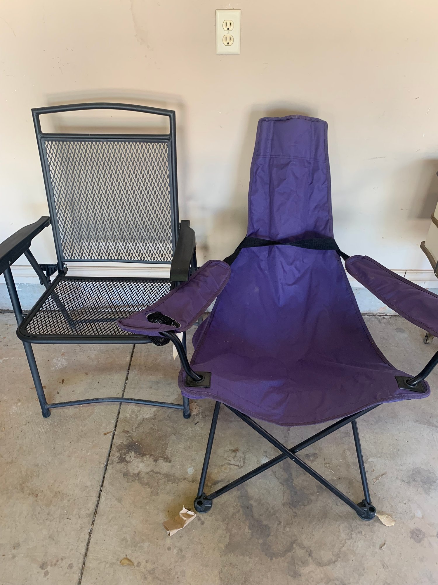 A purple lawn chair and foldable metal chair. Local Pickup Only.