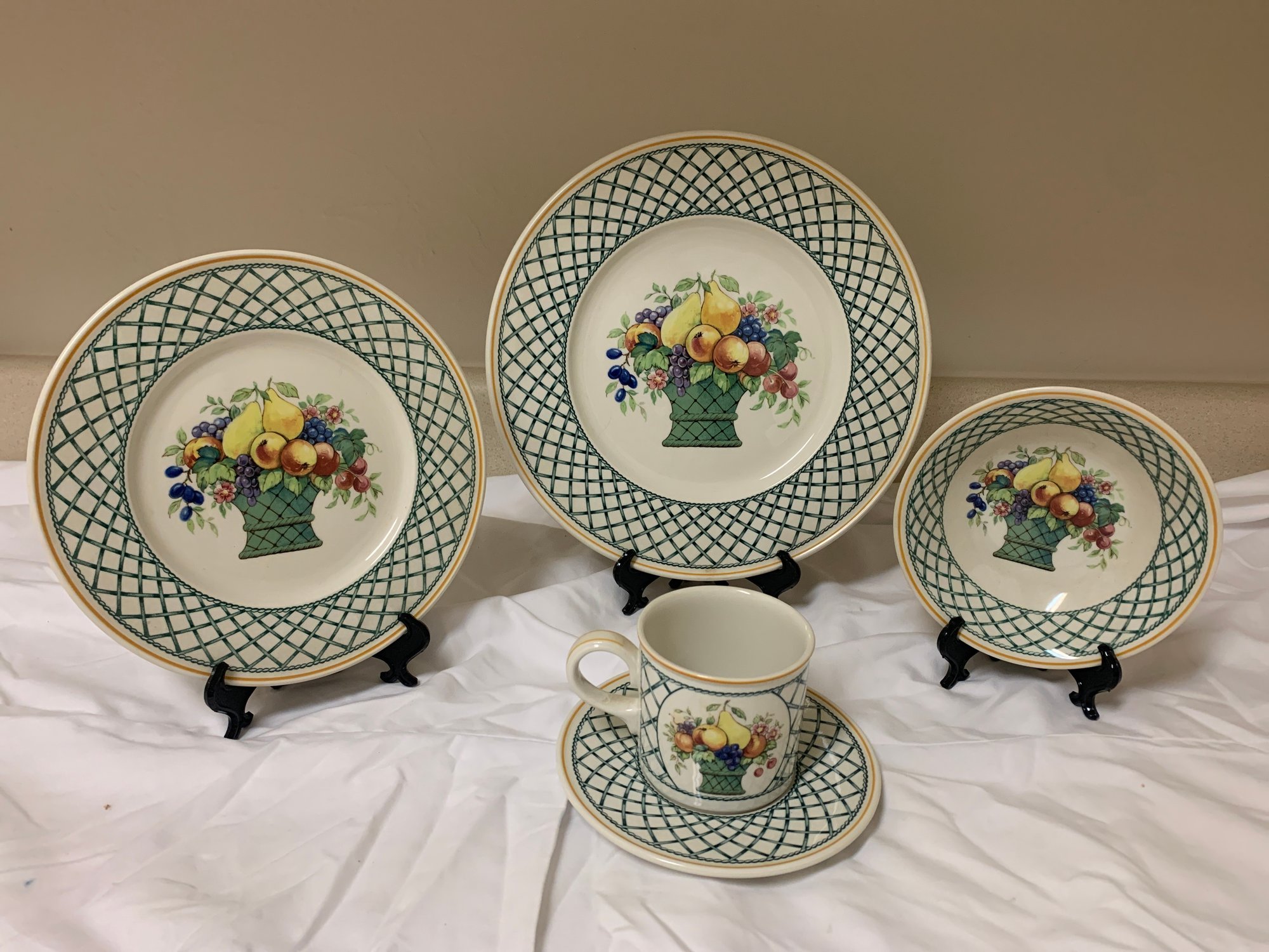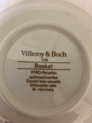 A Villeroy & Boch Basket Set - large plate, medium plate, small bowl, cup and saucer plate. Sizes shown in photos. Local pickup or courier shipping available – please see shipping terms for details.