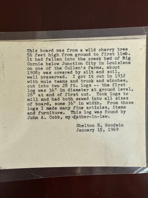 “This board was from a wild cherry tree 56 feet high from the ground to first limb. It had fallen into the creek bed of big cornice below junction city in Louisiana on one of the Cullen farms, about 1908; was covered by silt and soil, well preserved.” See photos for detail. Measurements when table is down in details. Local Pickup Only.