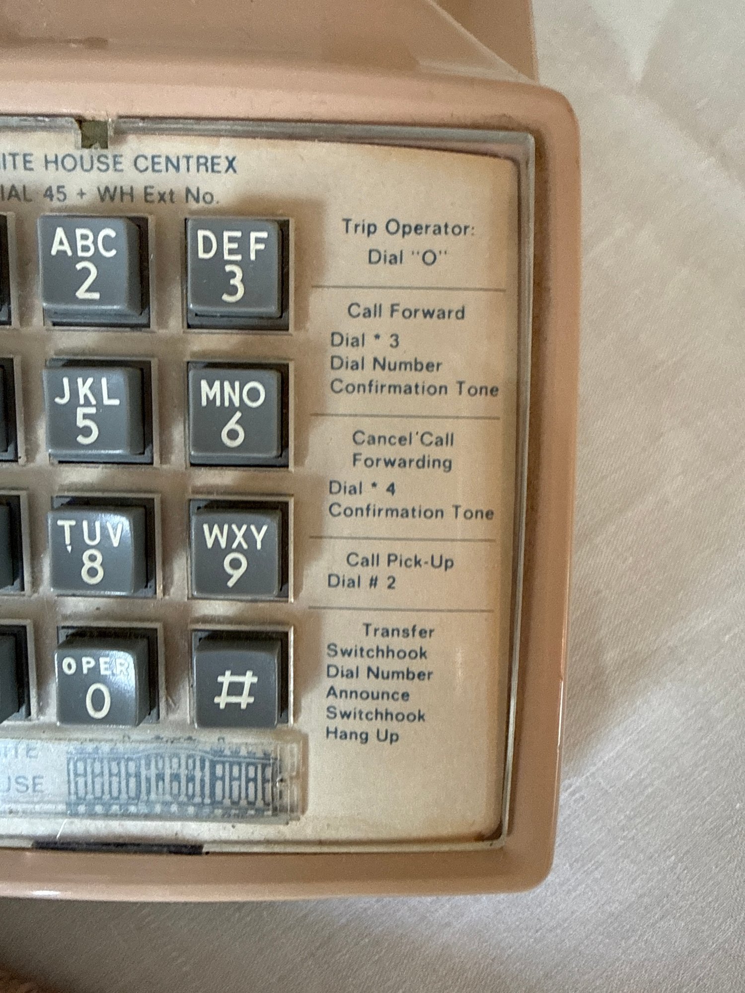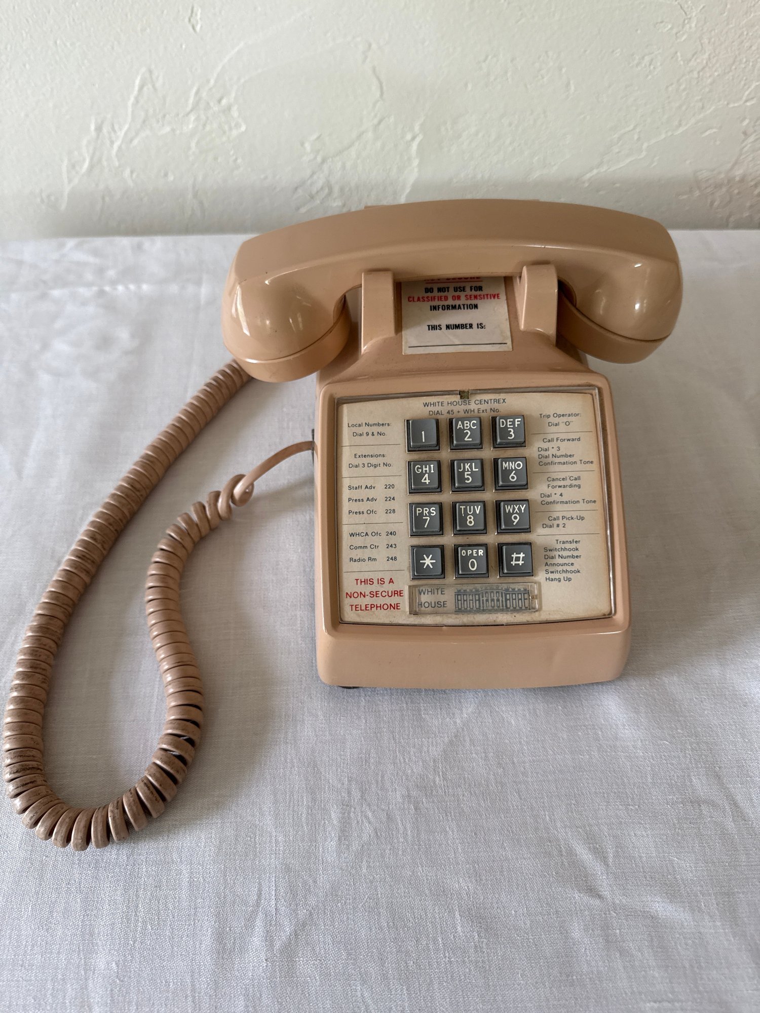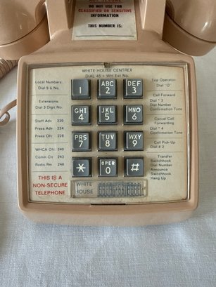 This lot contains a vintage landline telephone from the White House. States, “NOT SECURE Do Not Use For Classified Or Sensitive Information” see photos for detail. Local pickup or courier shipping available – please see shipping terms for details.