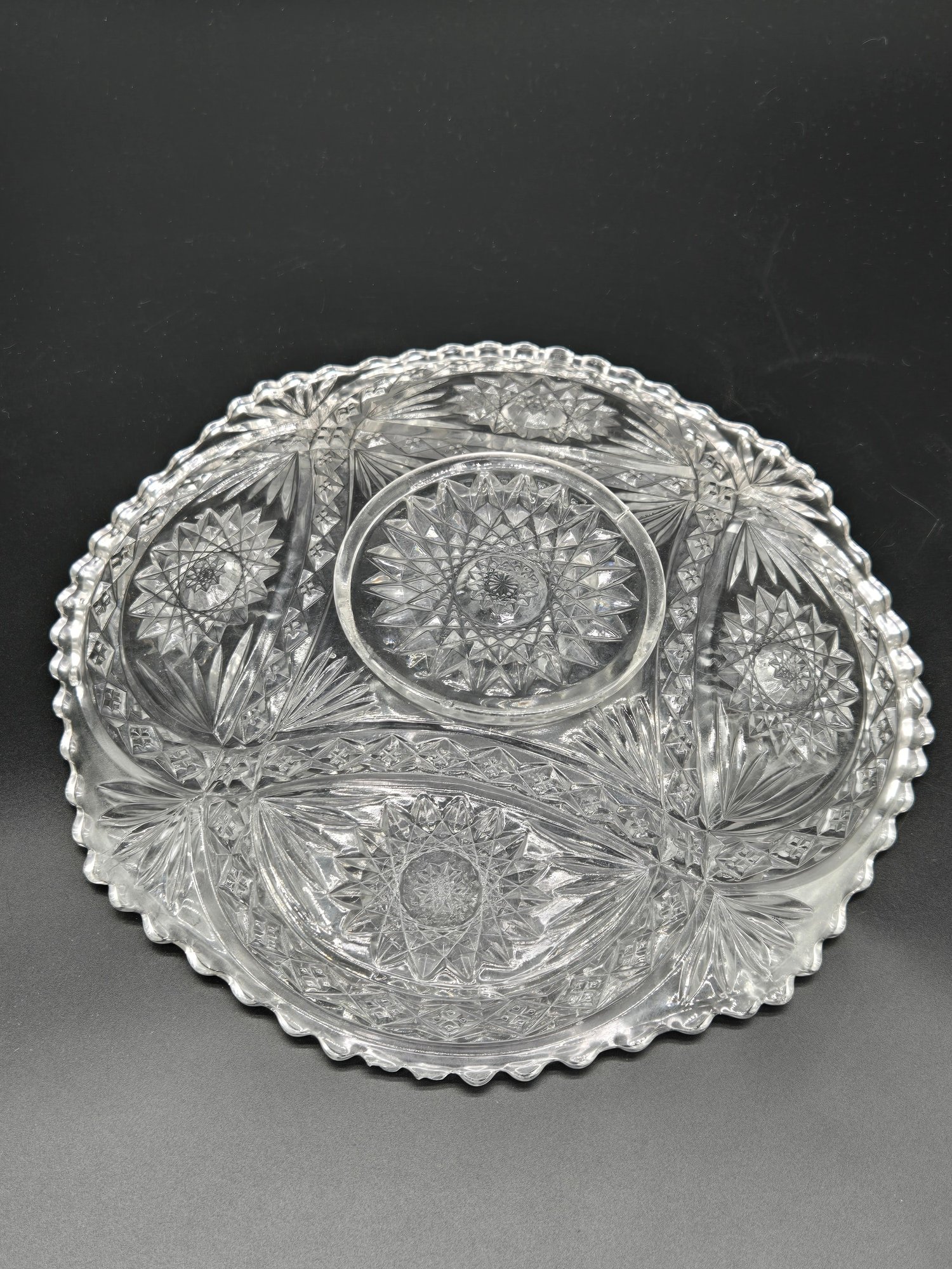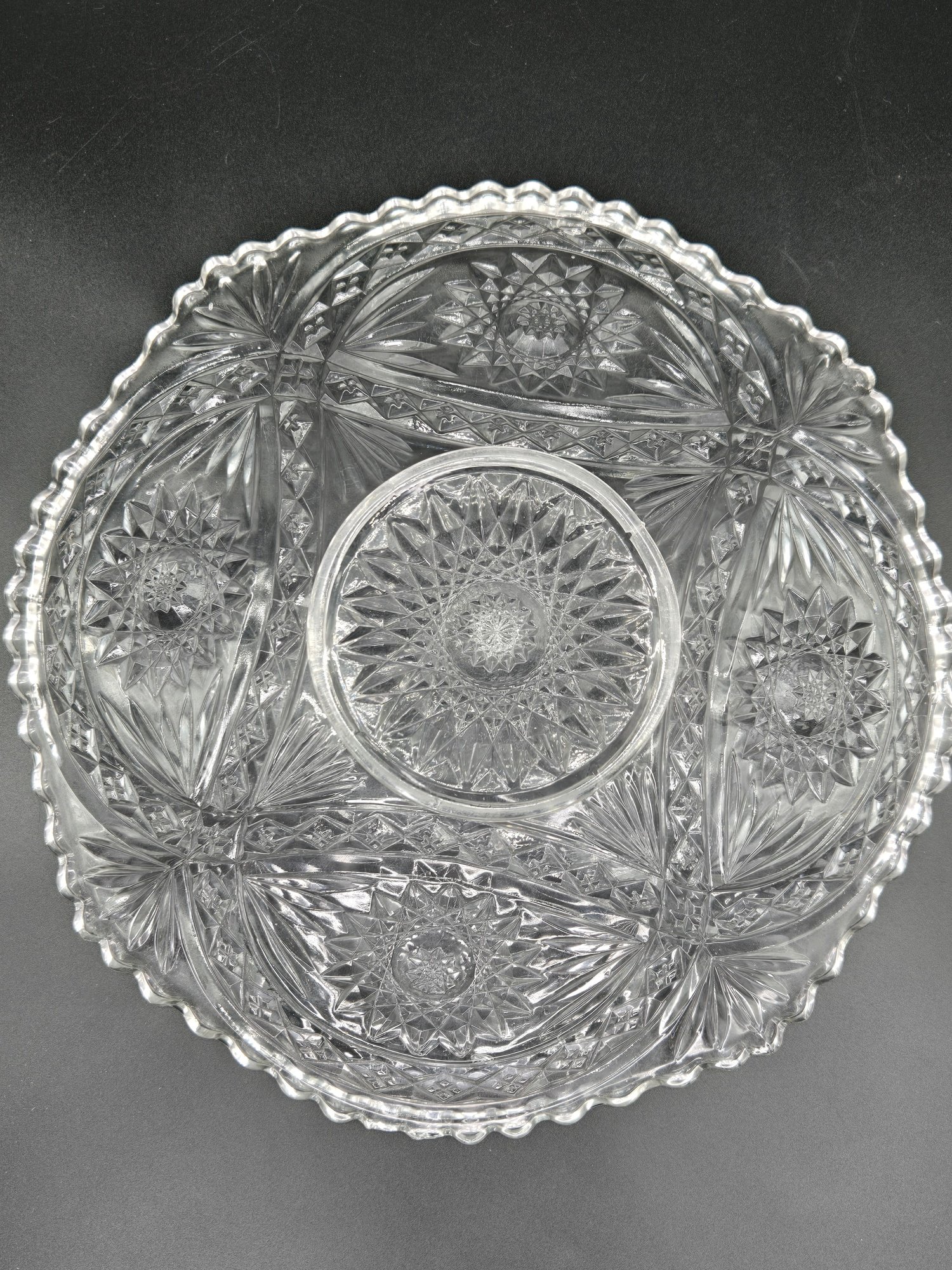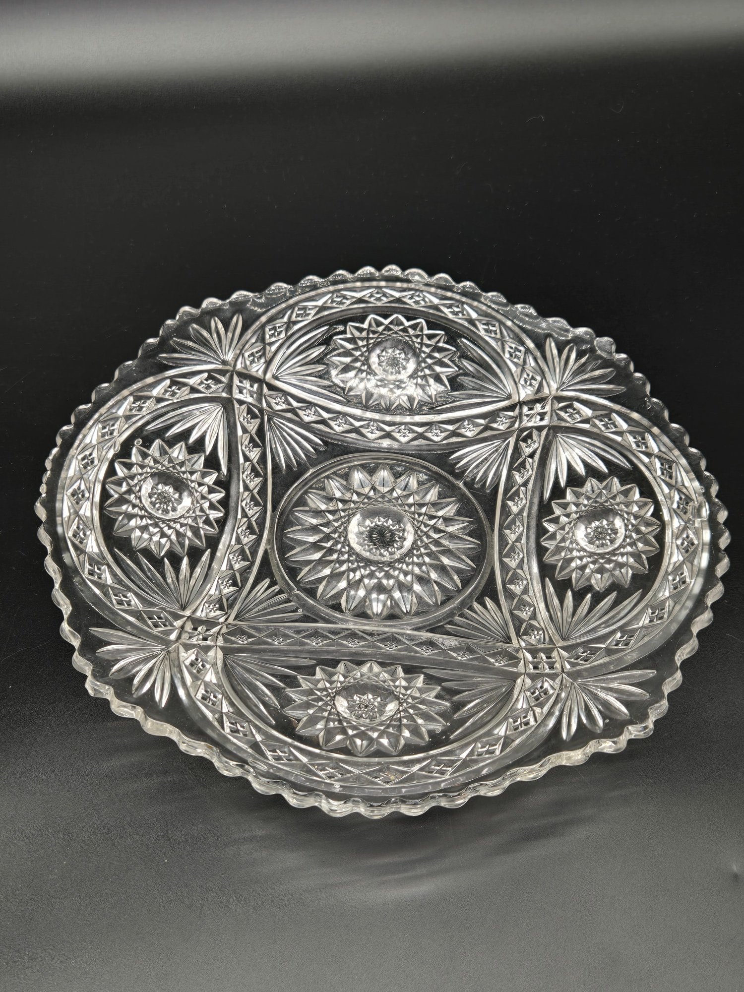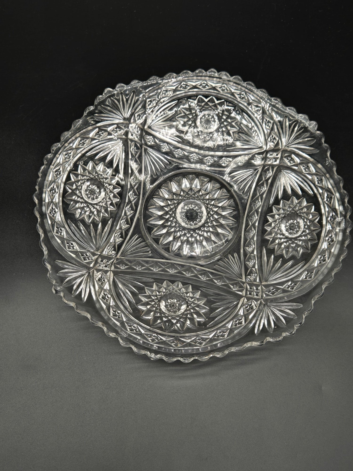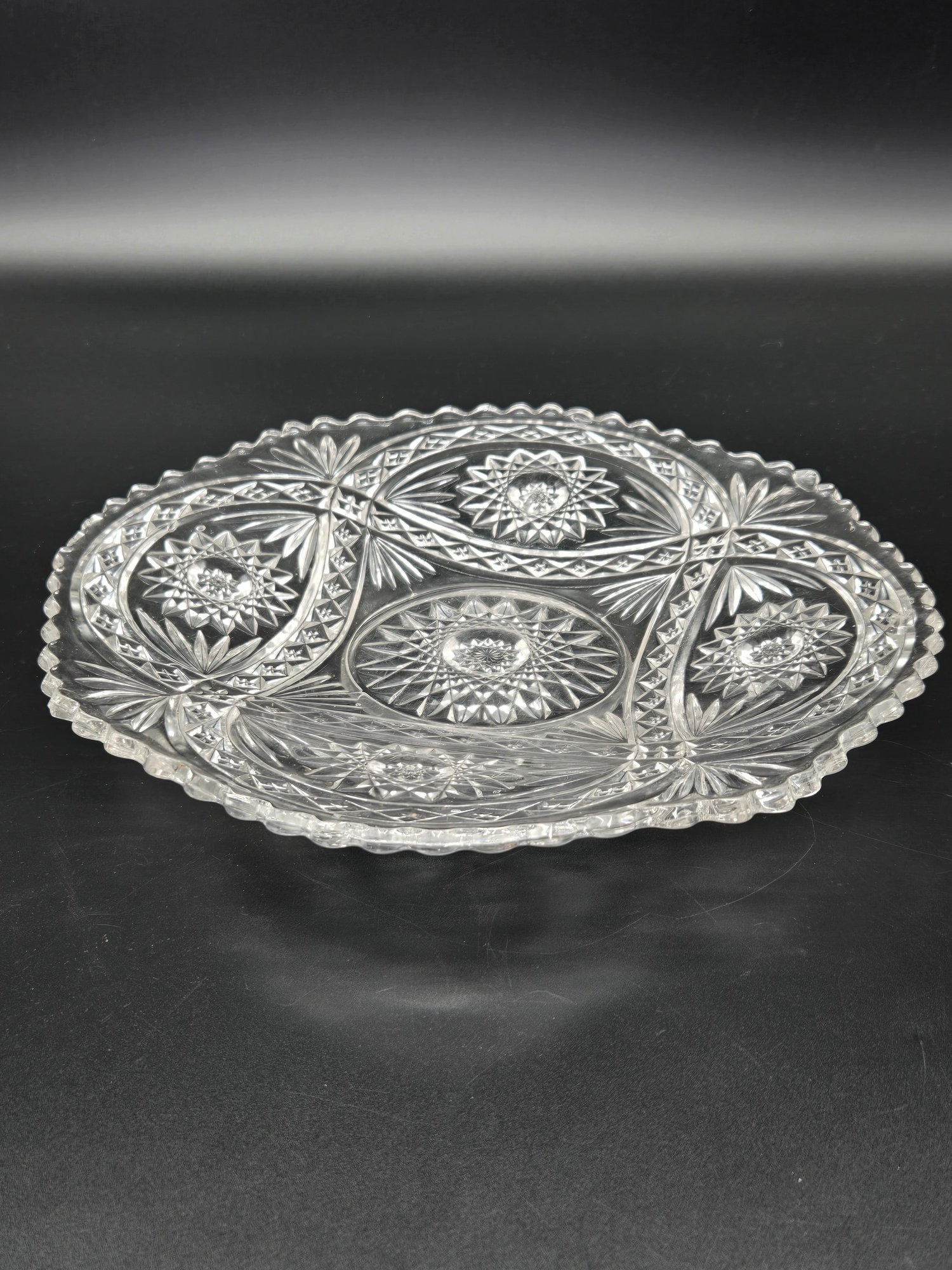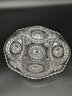 antique EAPG (Early American Pressed Glass) footed sandwich plate in the "Hobstar" pattern, likely manufactured by Imperial Glass Ohio.