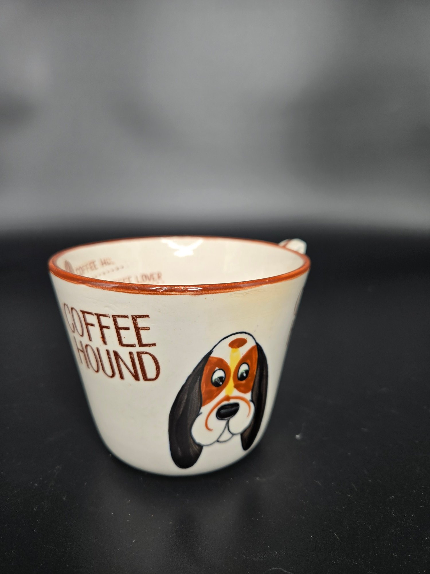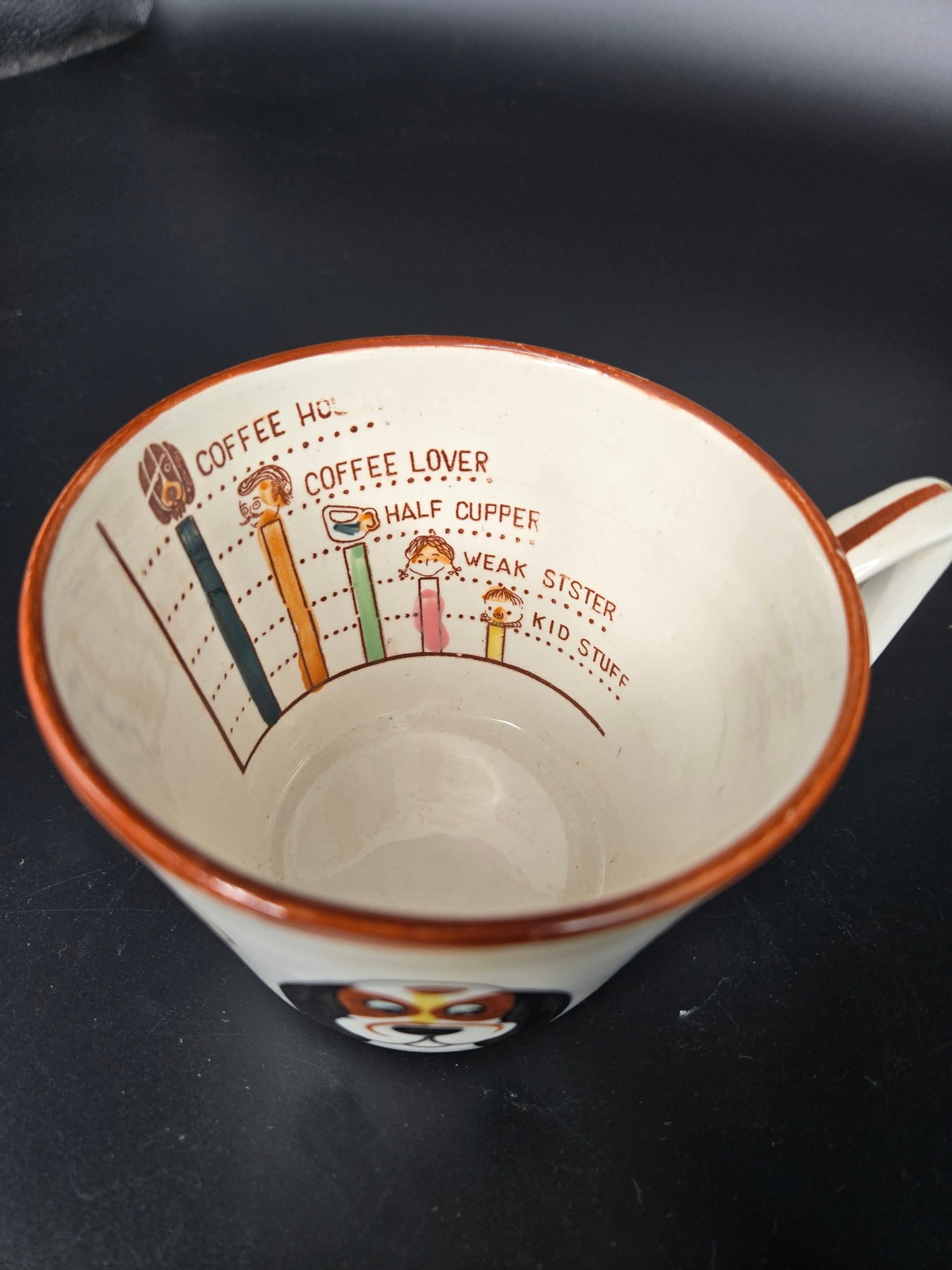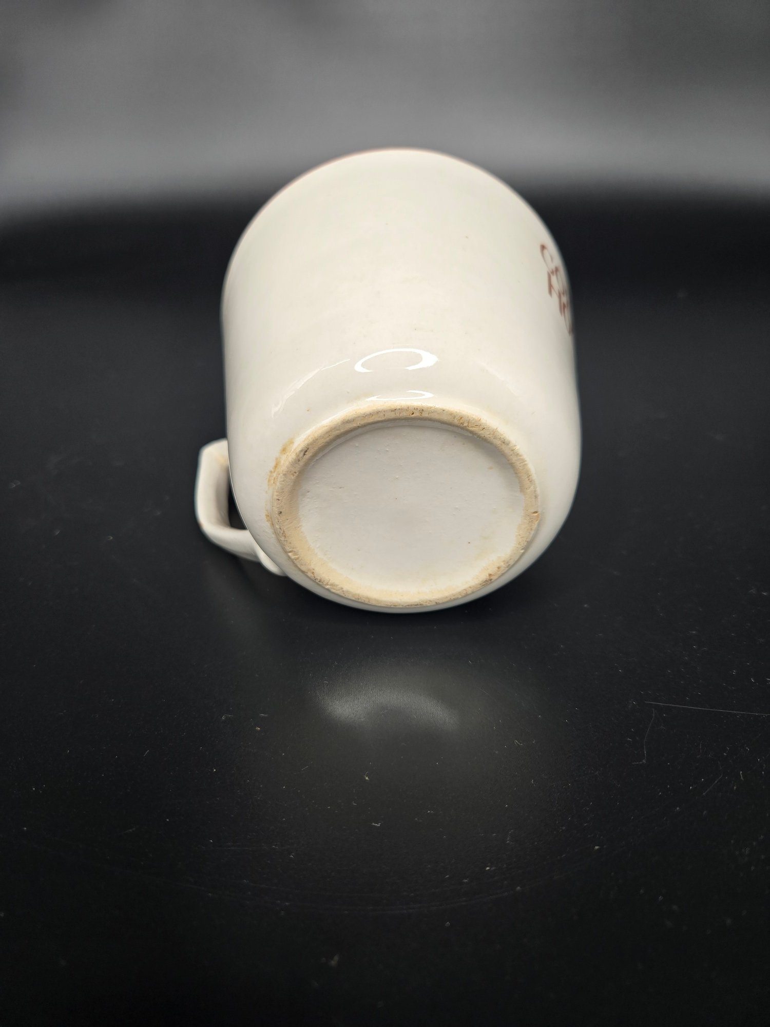 3.75" tall x 4.5" wide at opening; 5.5" wide with handle. Has a small chip on the handle.