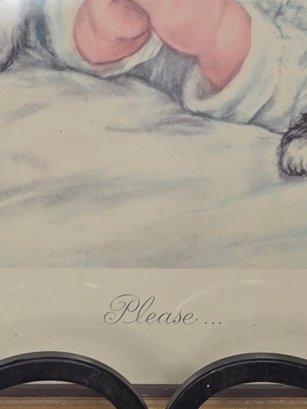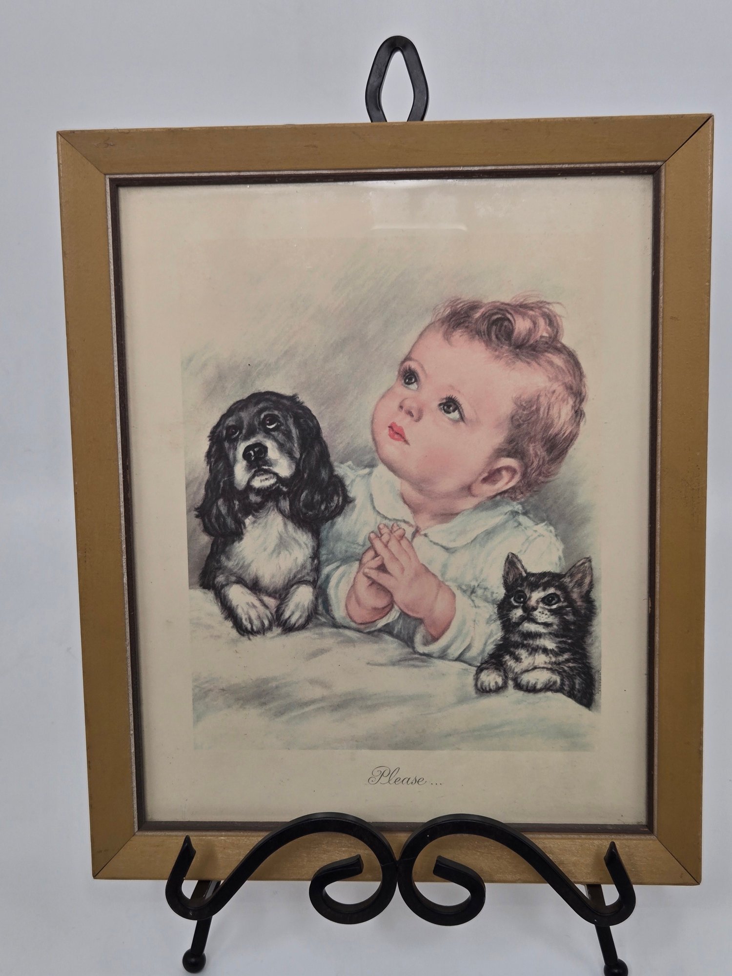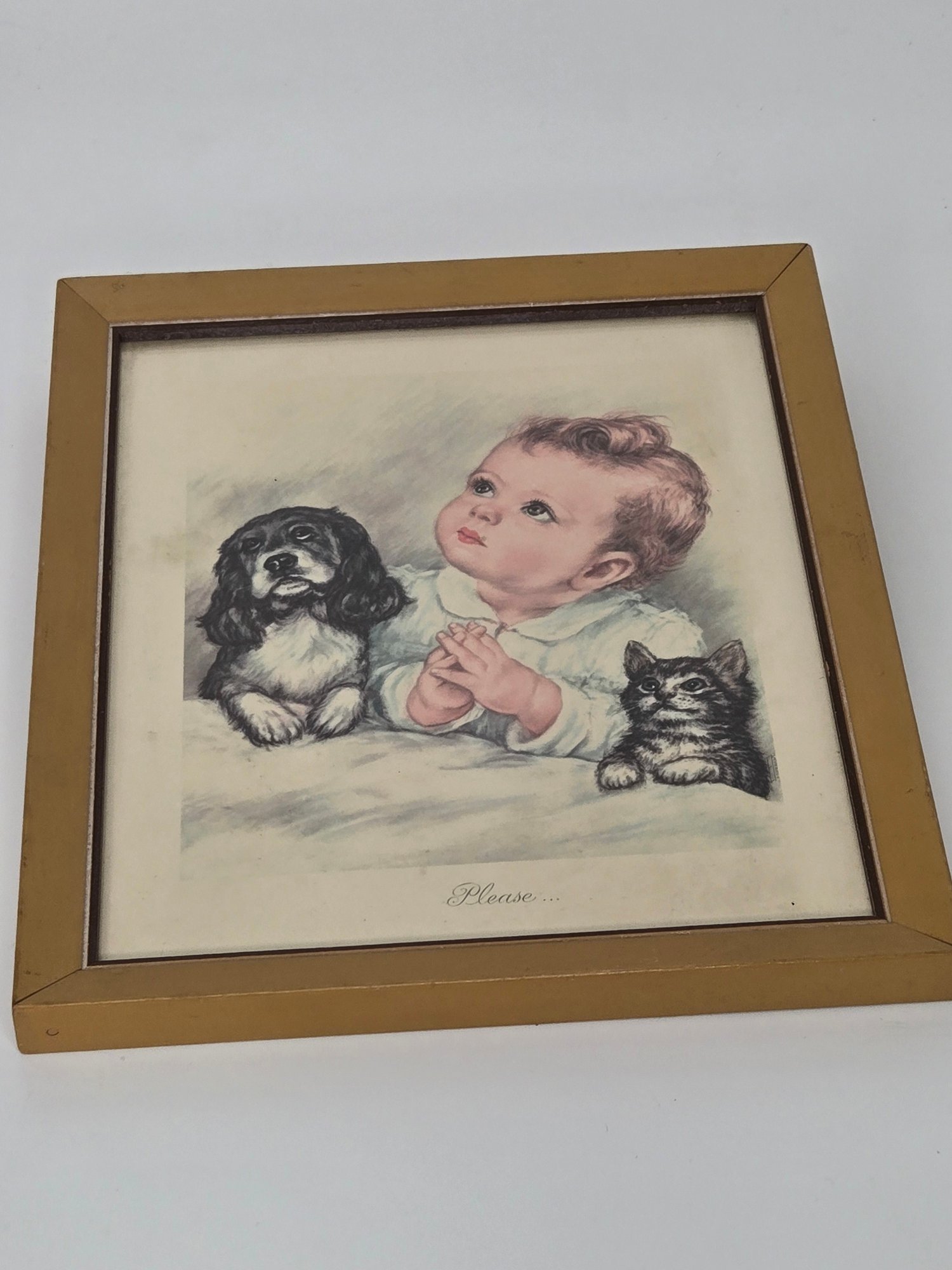 This vintage 1950s lithograph, titled "PLEASE," features a child praying with a puppy and a kitten.