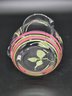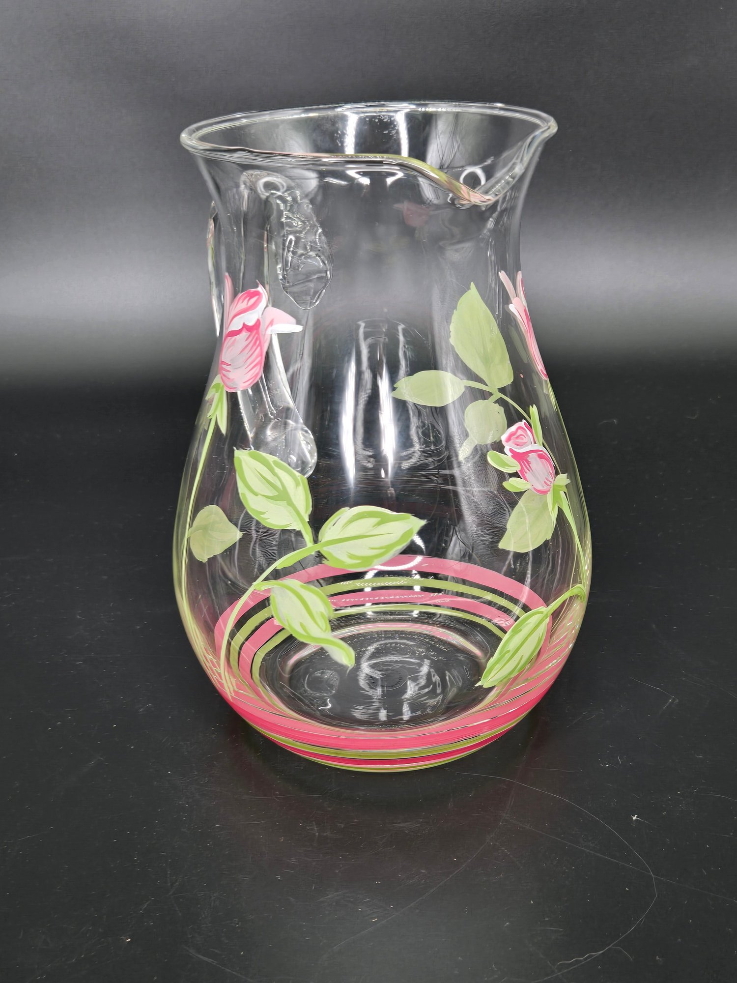 Vintage crystal pitcher featuring hand-painted pink rosebuds and green leaves, with search results identifying it as either a Princess House "Cottage Tulip" collection piece or a Crystal Clear Industries item