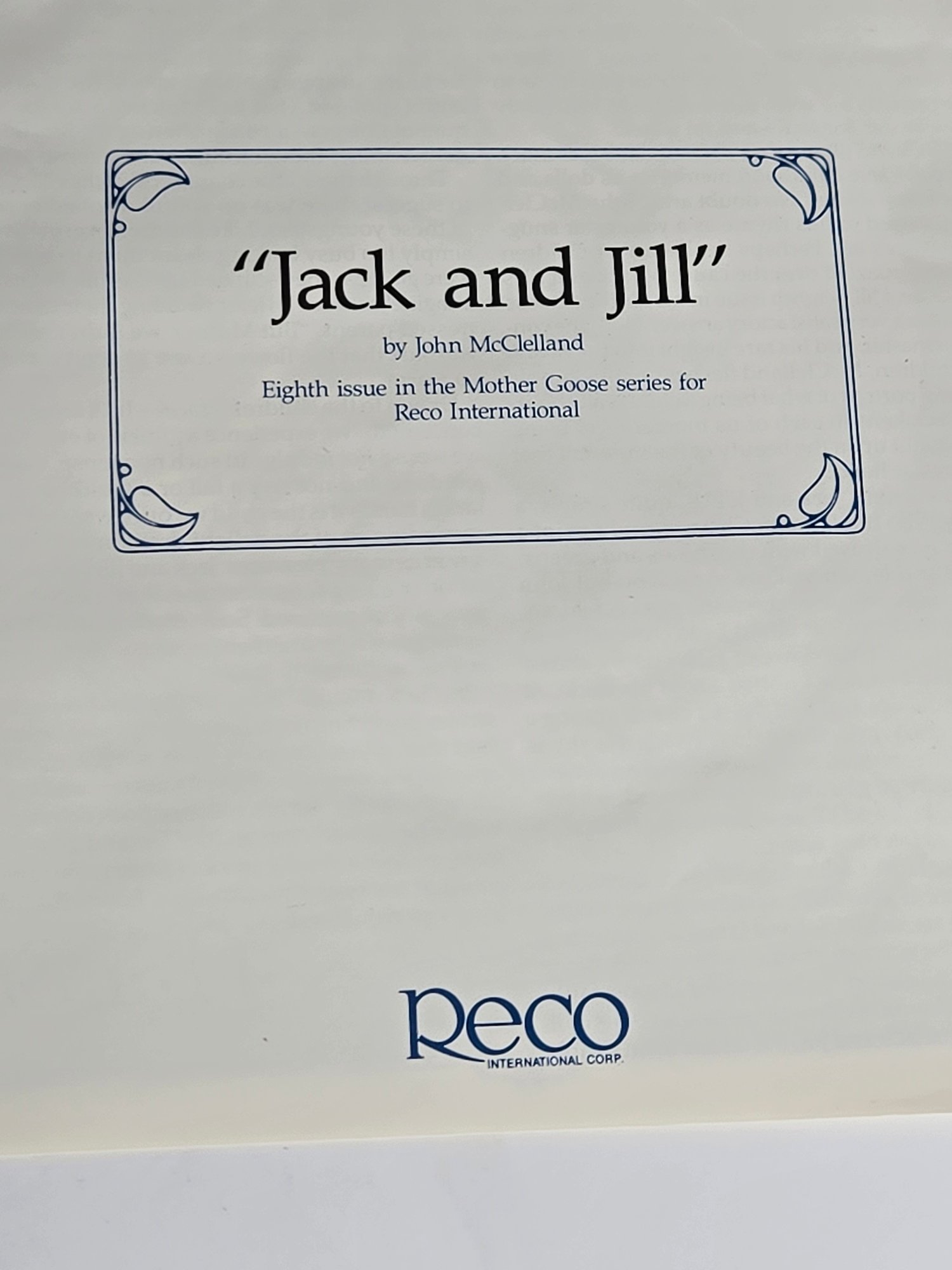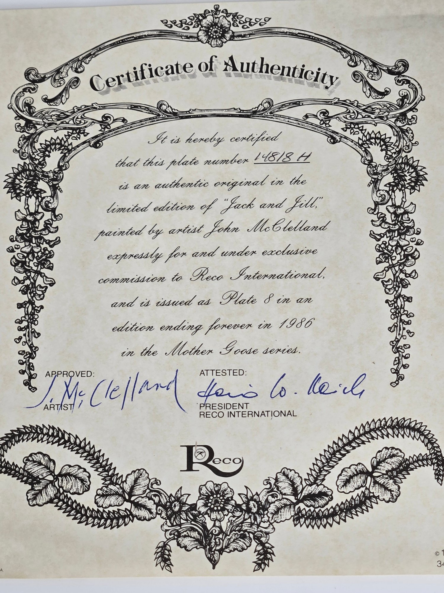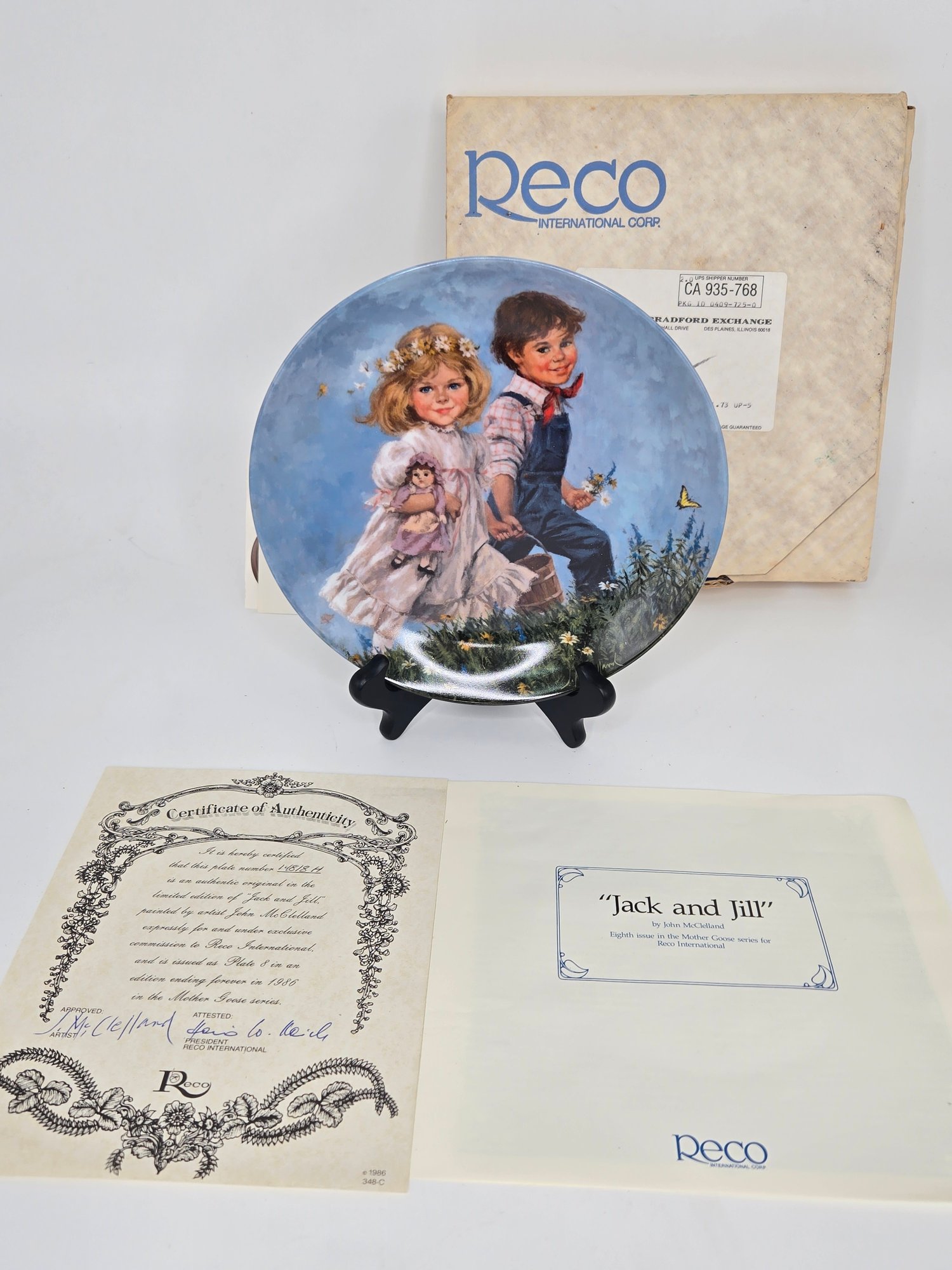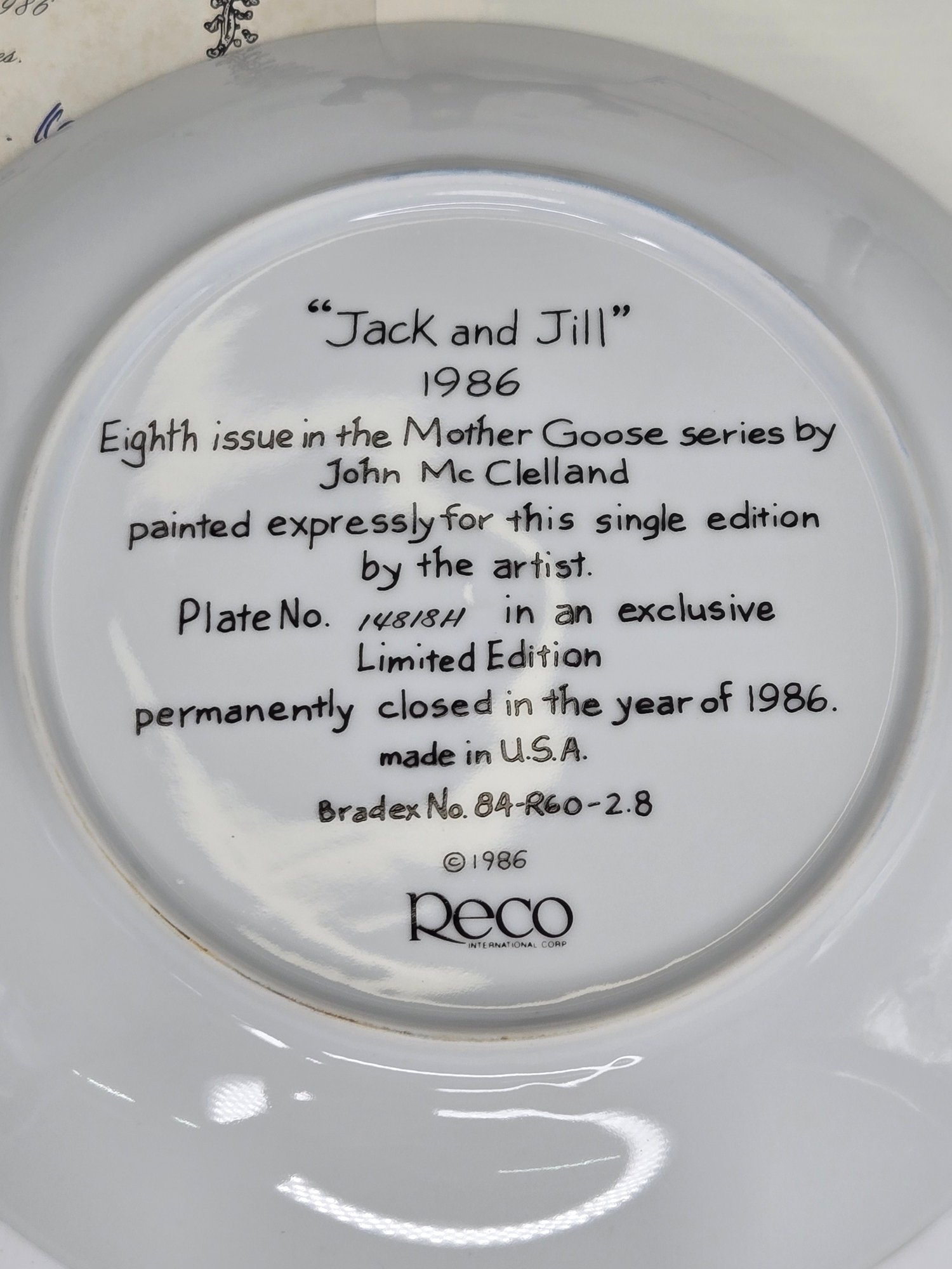 Reco limited edition collector plate is titled "Jack and Jill" and is the 8th issue in the Mother Goose Series by artist John McClelland, produced in 1986.