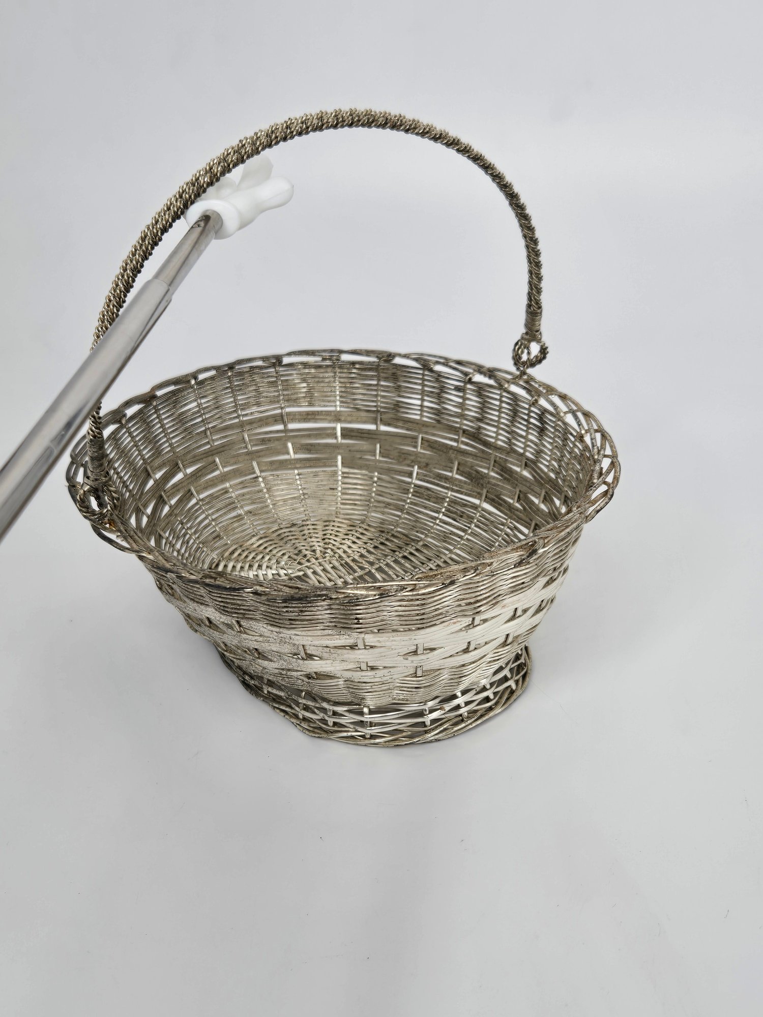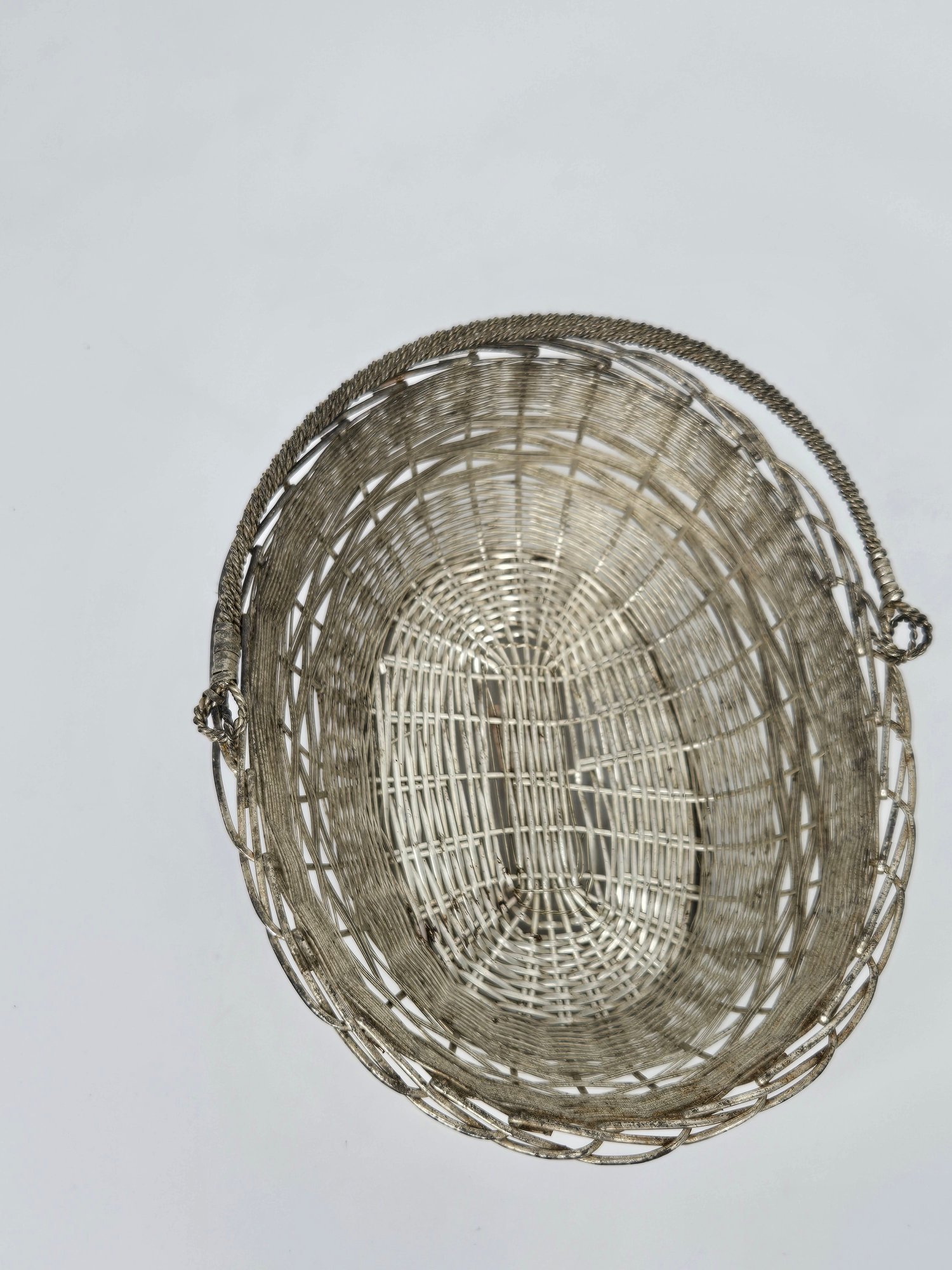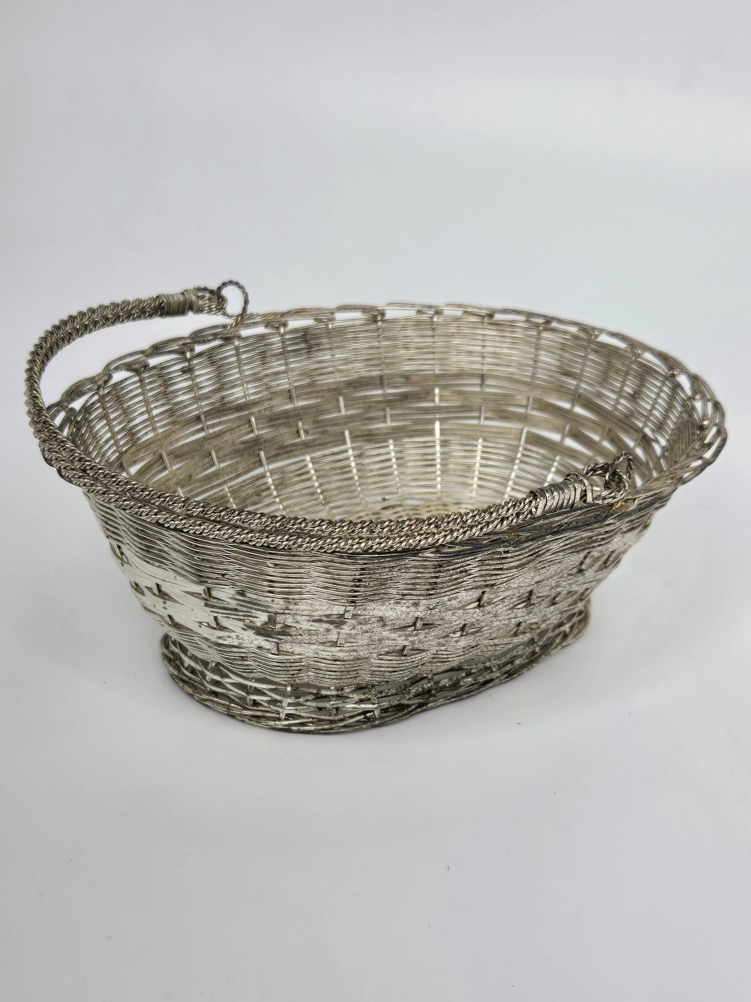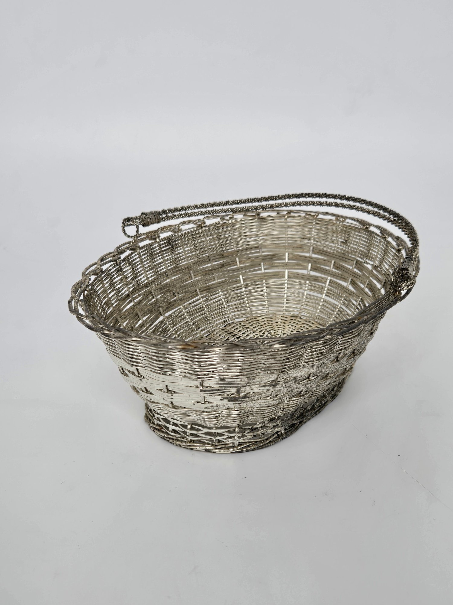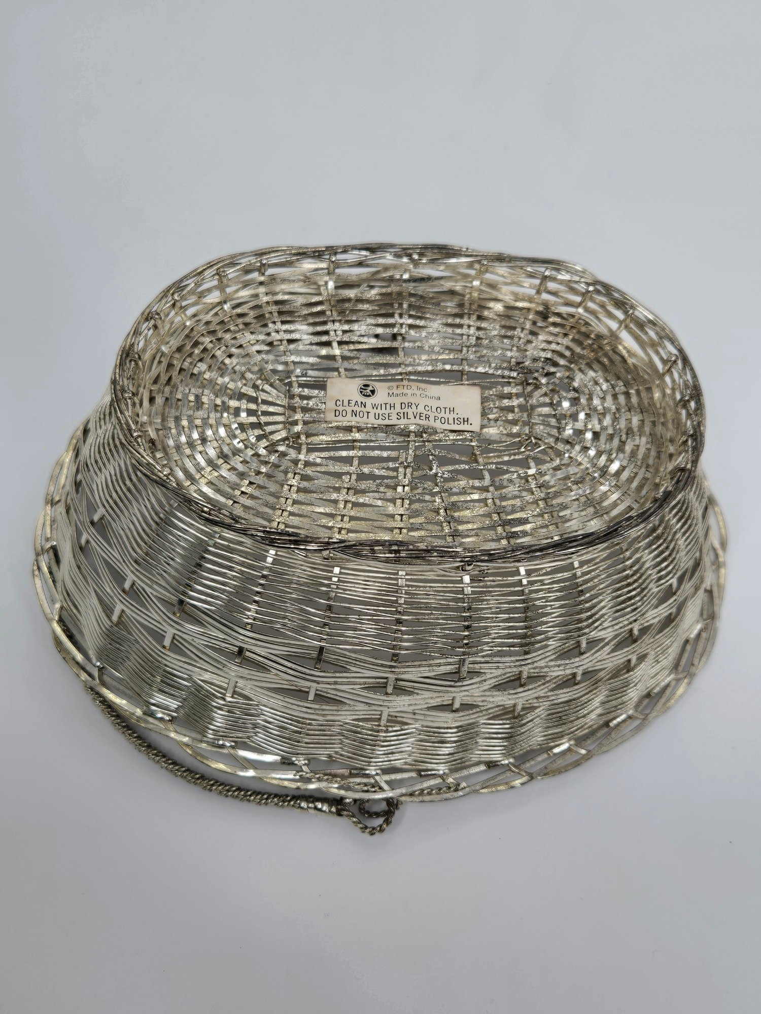 vintage wire woven basket, often referred to as a wicker-style serving basket or egg basket.