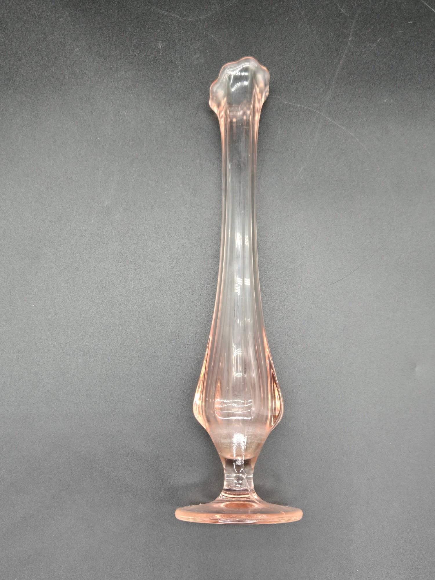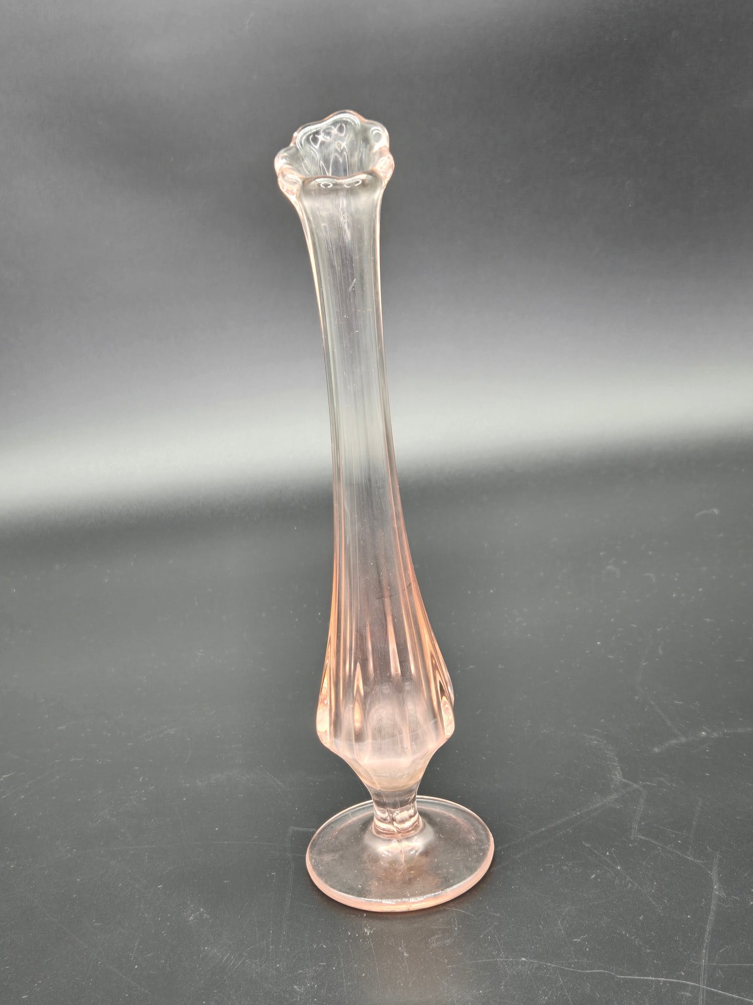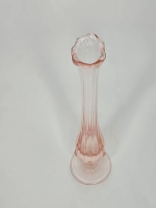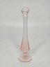 A vintage pink depression glass bud vase, likely from the mid-20th century.