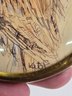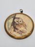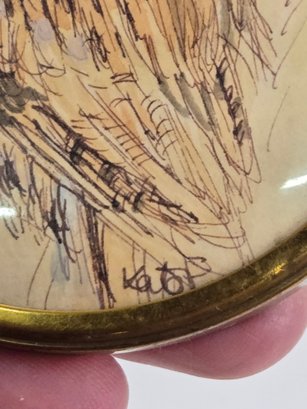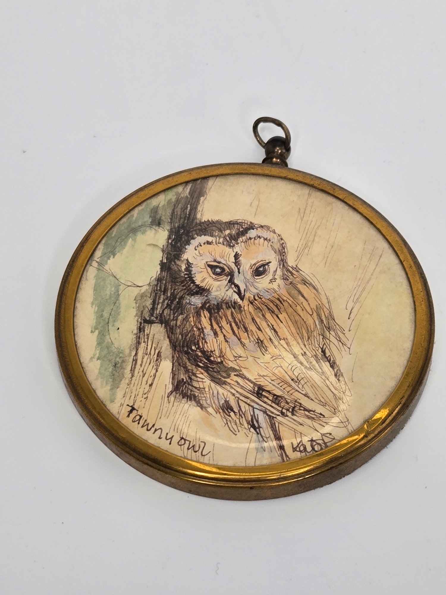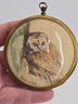 A vintage collectible hand-painted brooch or plaque featuring a "Tawny Owl" artwork by artist Sheila Mannes Abbott.