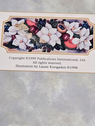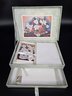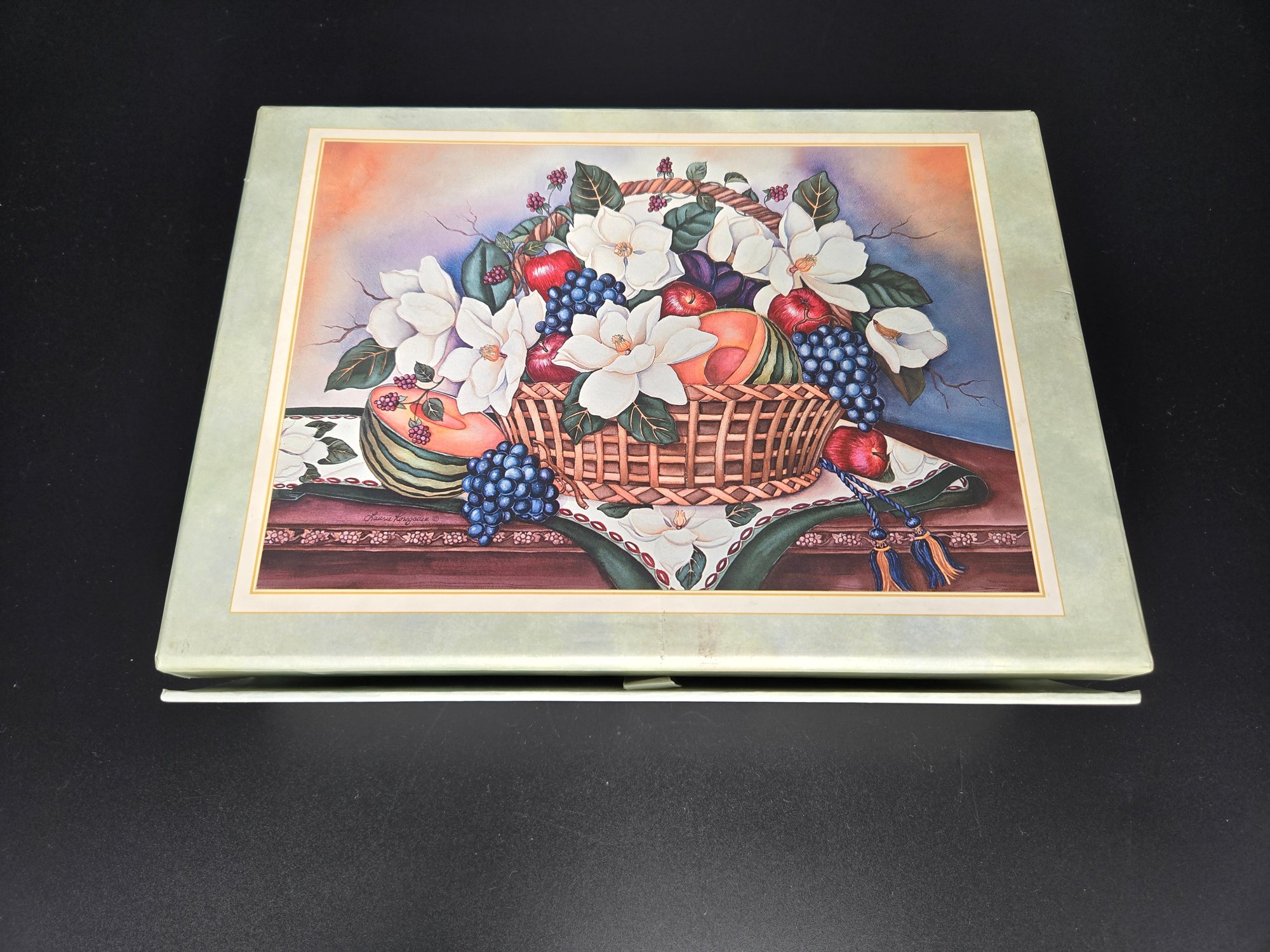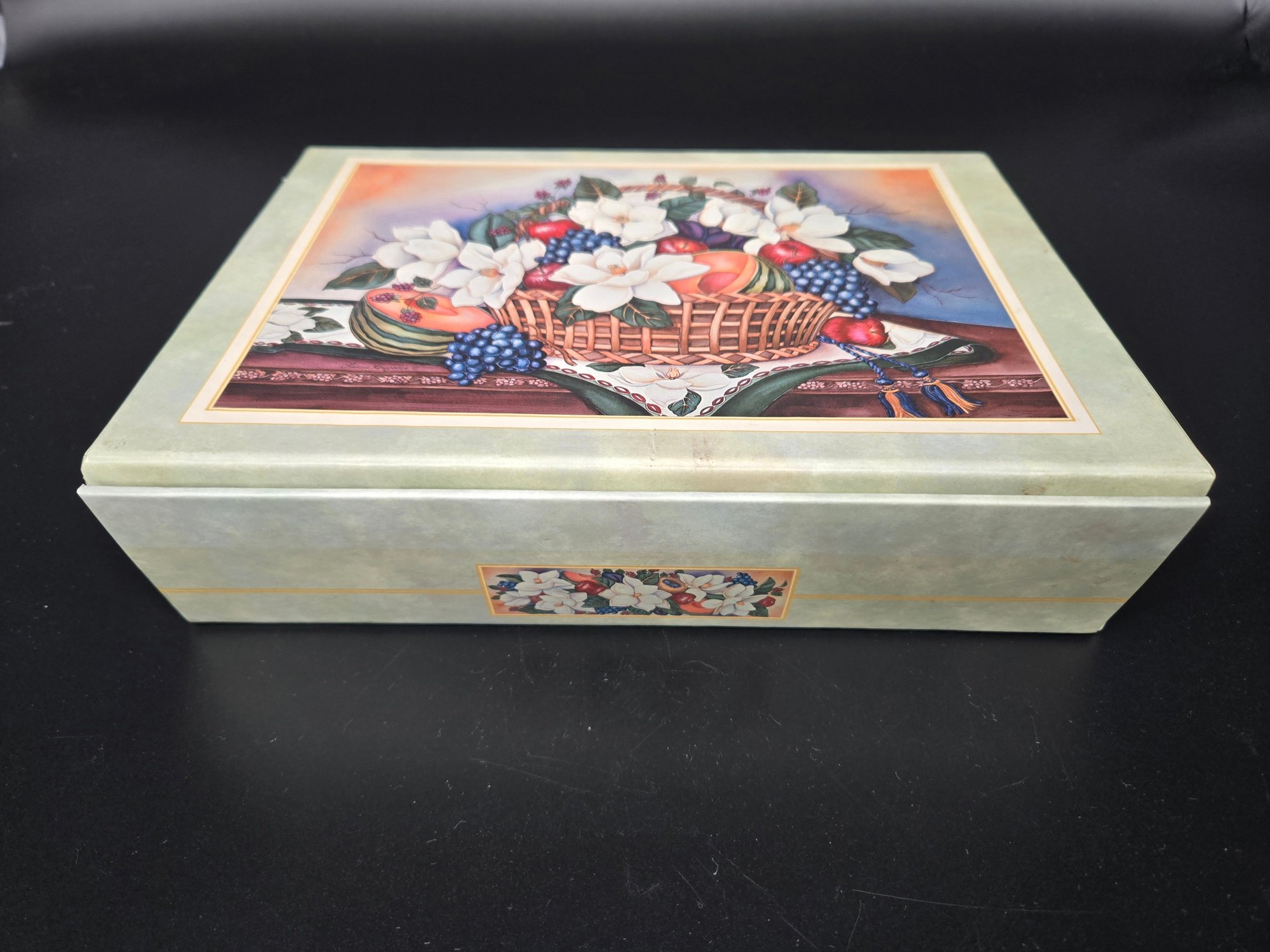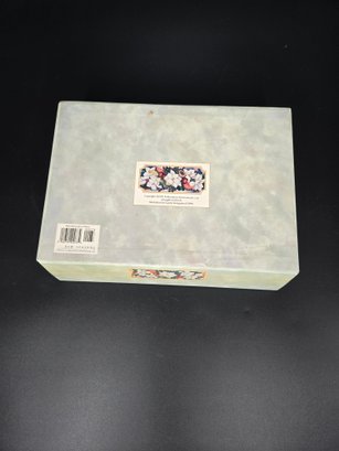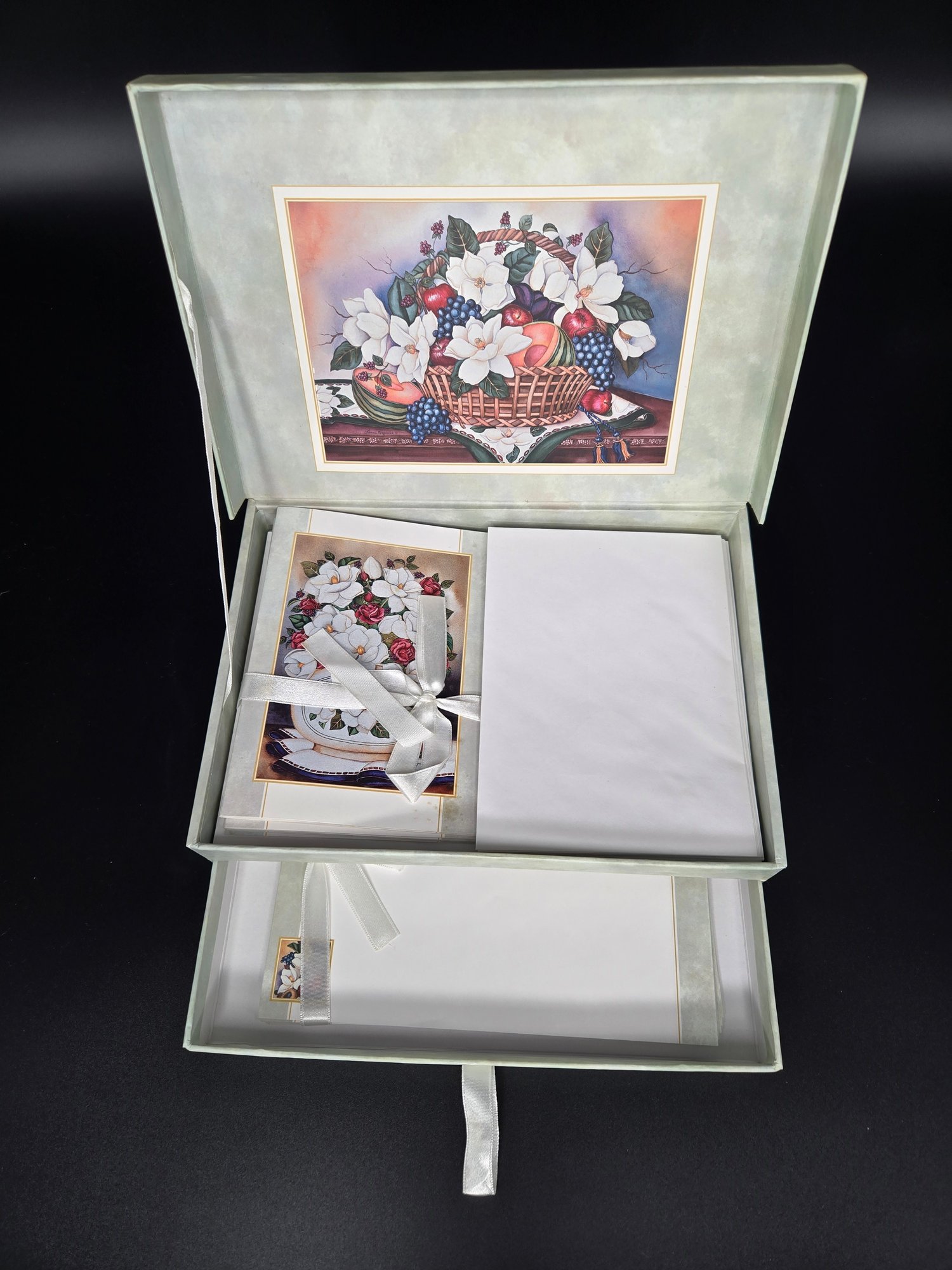 With plenty of stationary; 12 cards with envelopes and approximately 20 sheets of paper. The box is 10.5" wide x 7.25" deep x 2.5/8" wide.