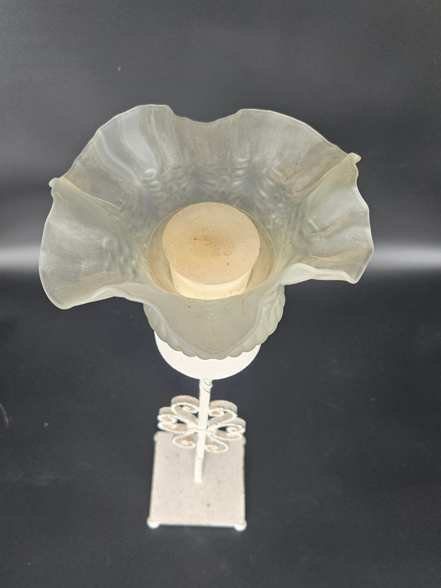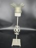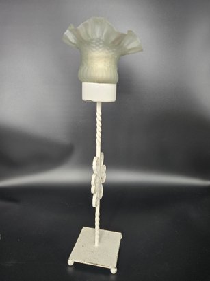 It measures 18 1/2" tall x 6" diameter. Holds a votive candle.
