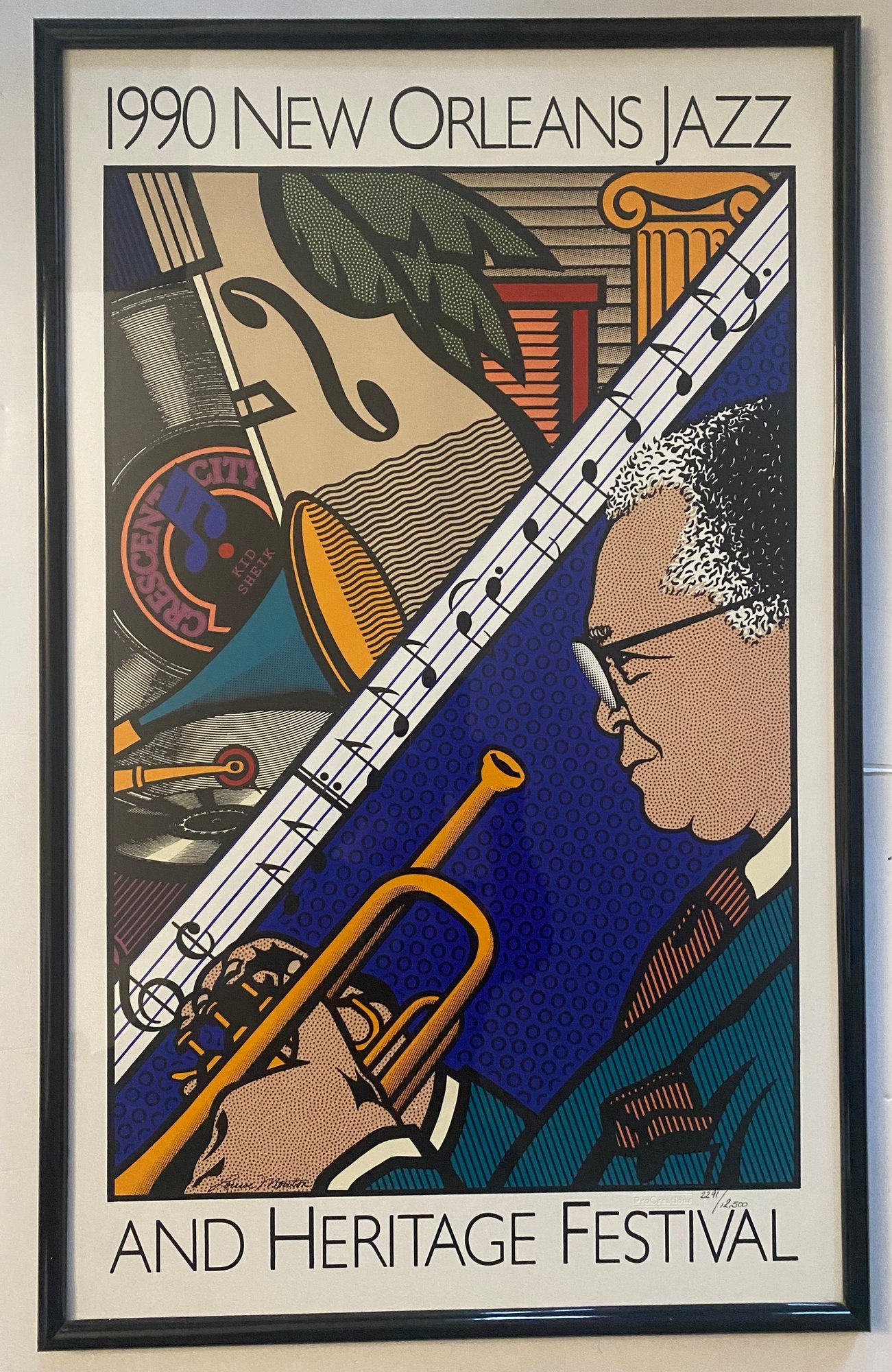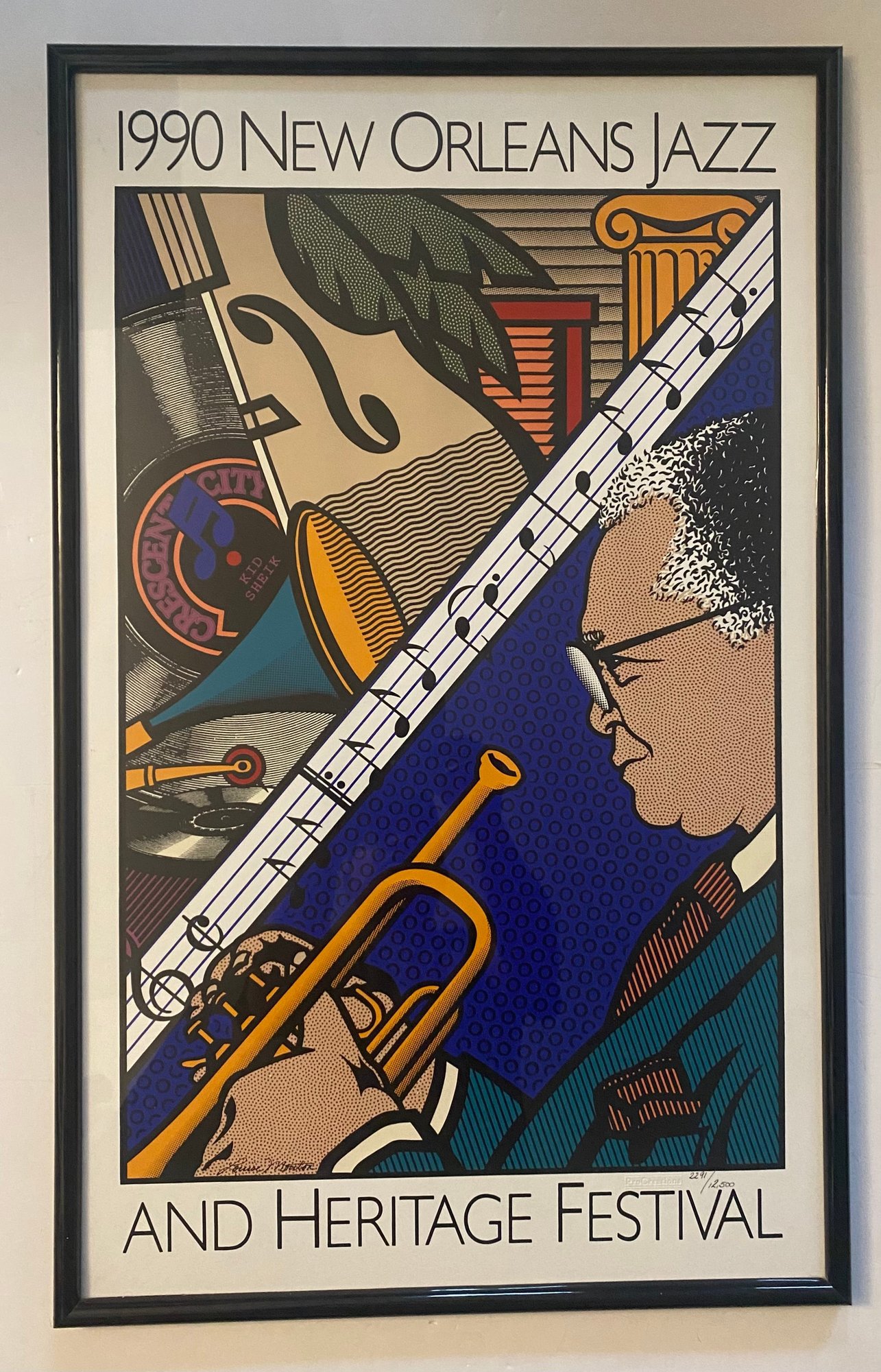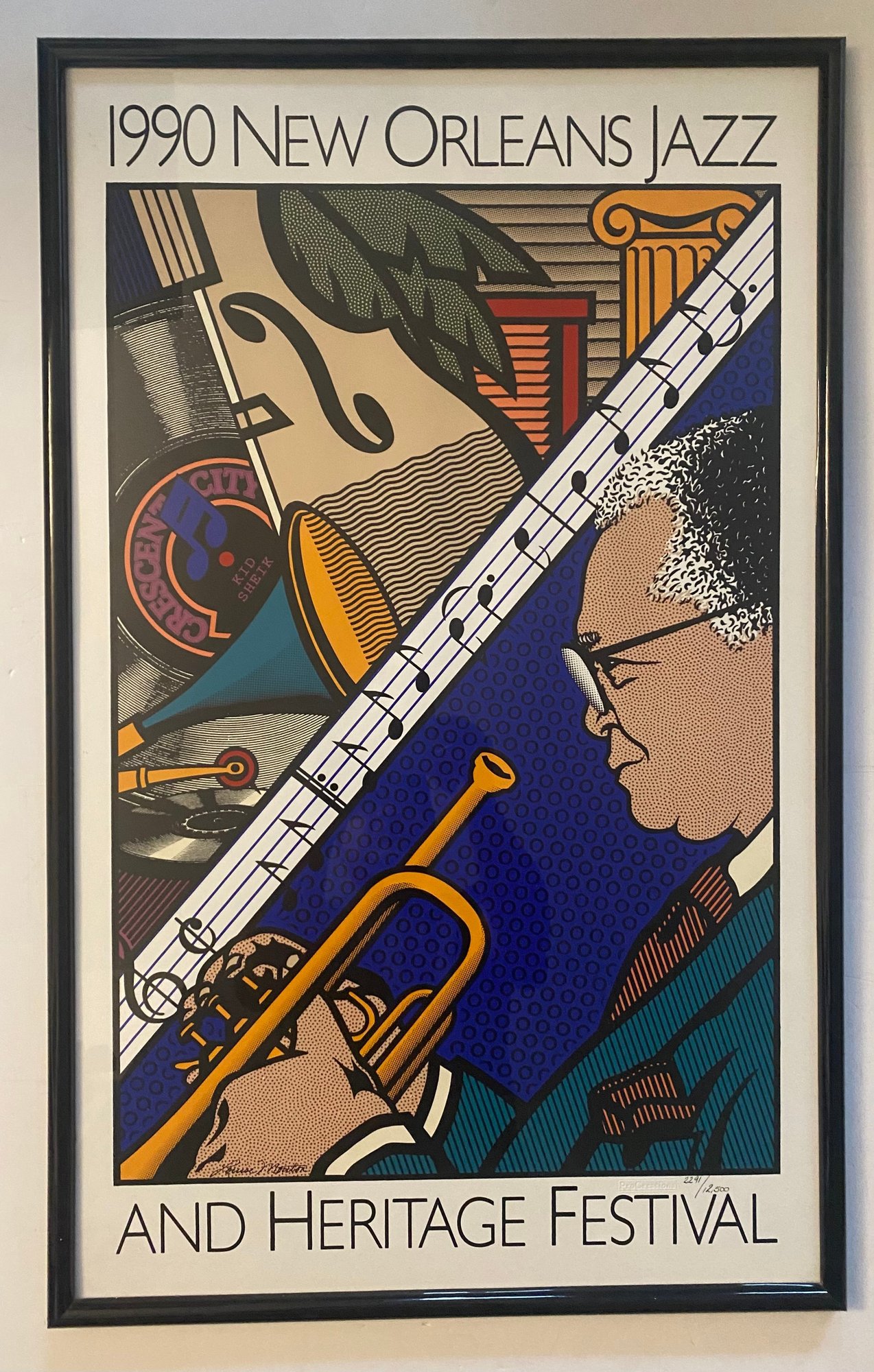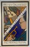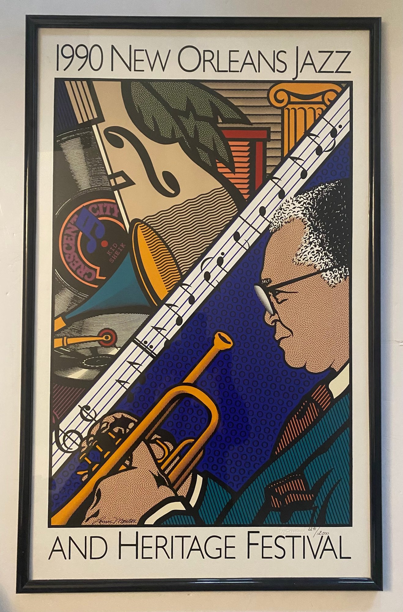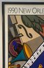 This image displays a framed poster for the 1990 New Orleans Jazz & Heritage Festival.