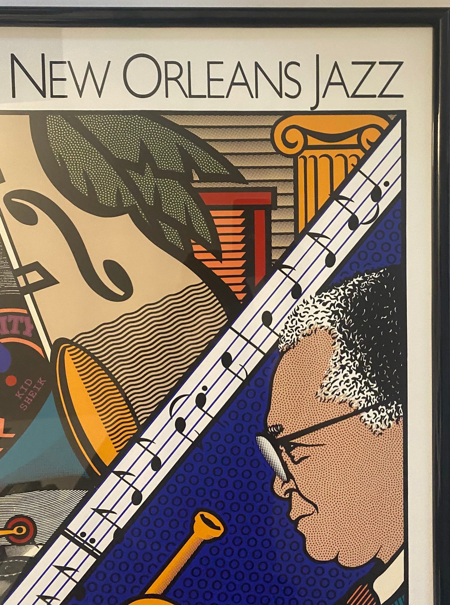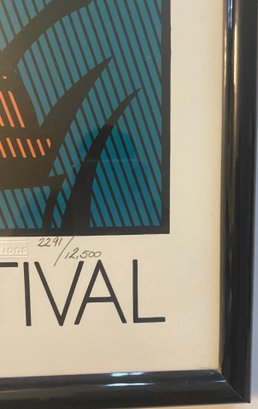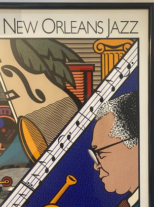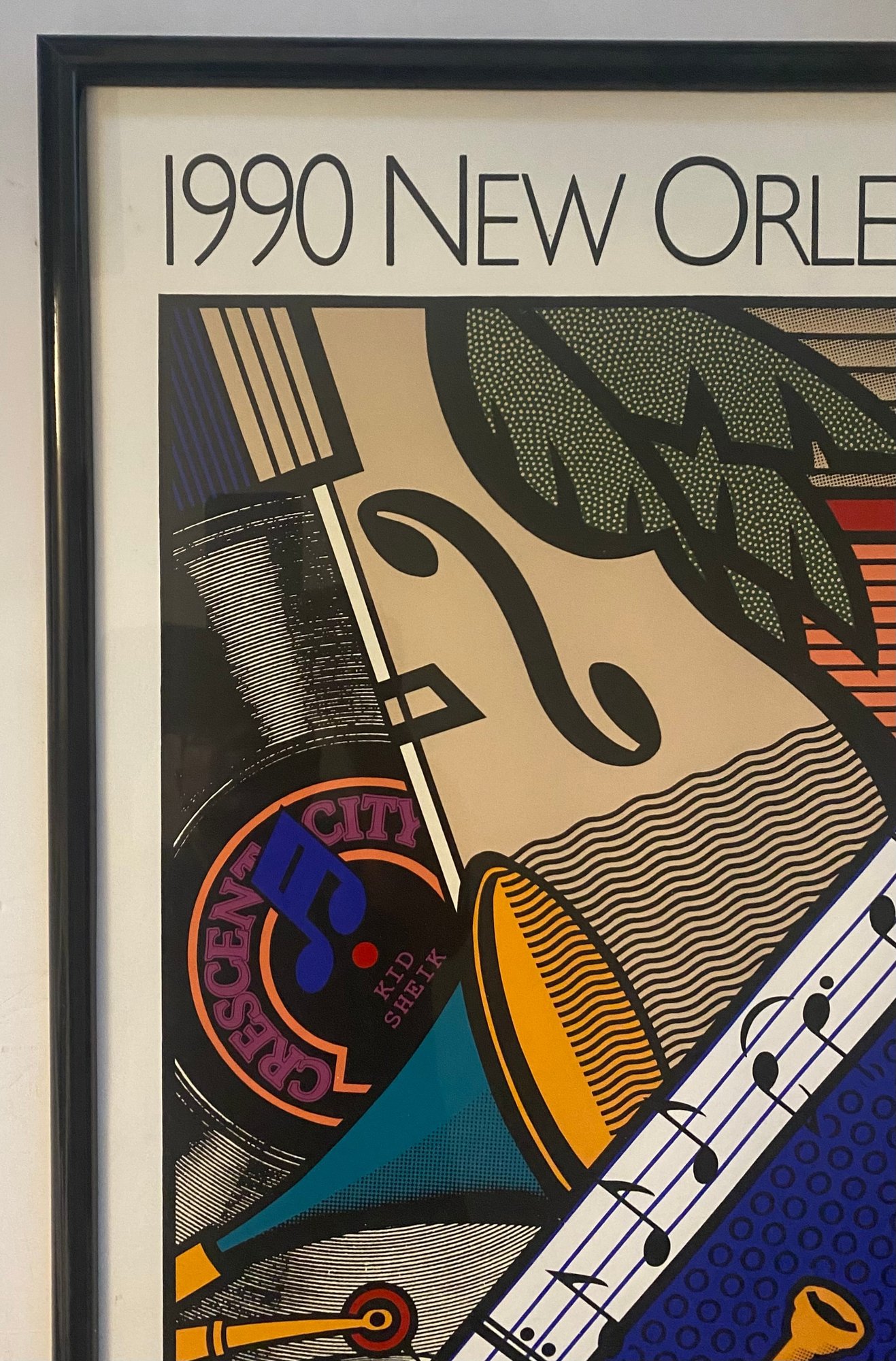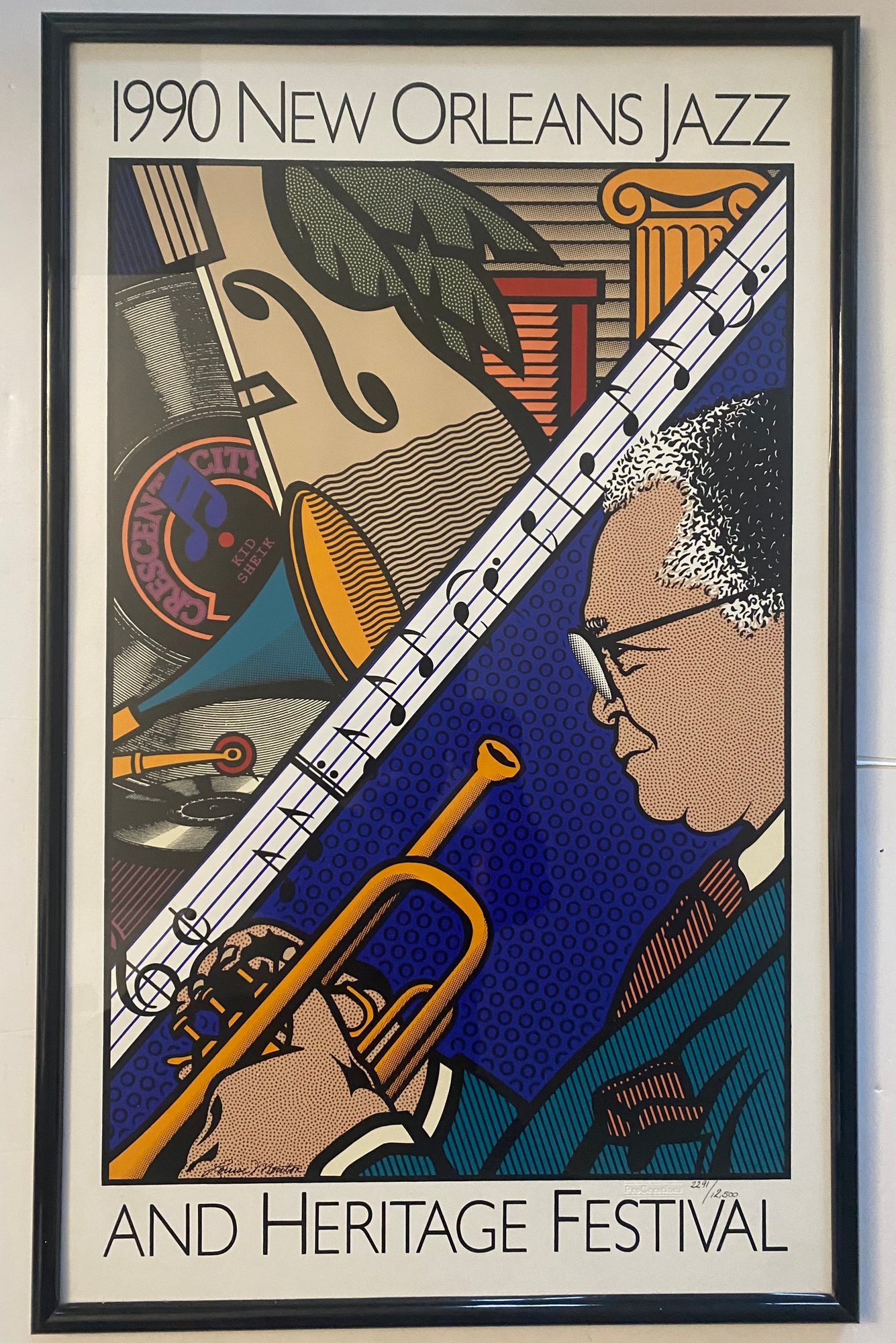 This image displays a framed poster for the 1990 New Orleans Jazz & Heritage Festival.