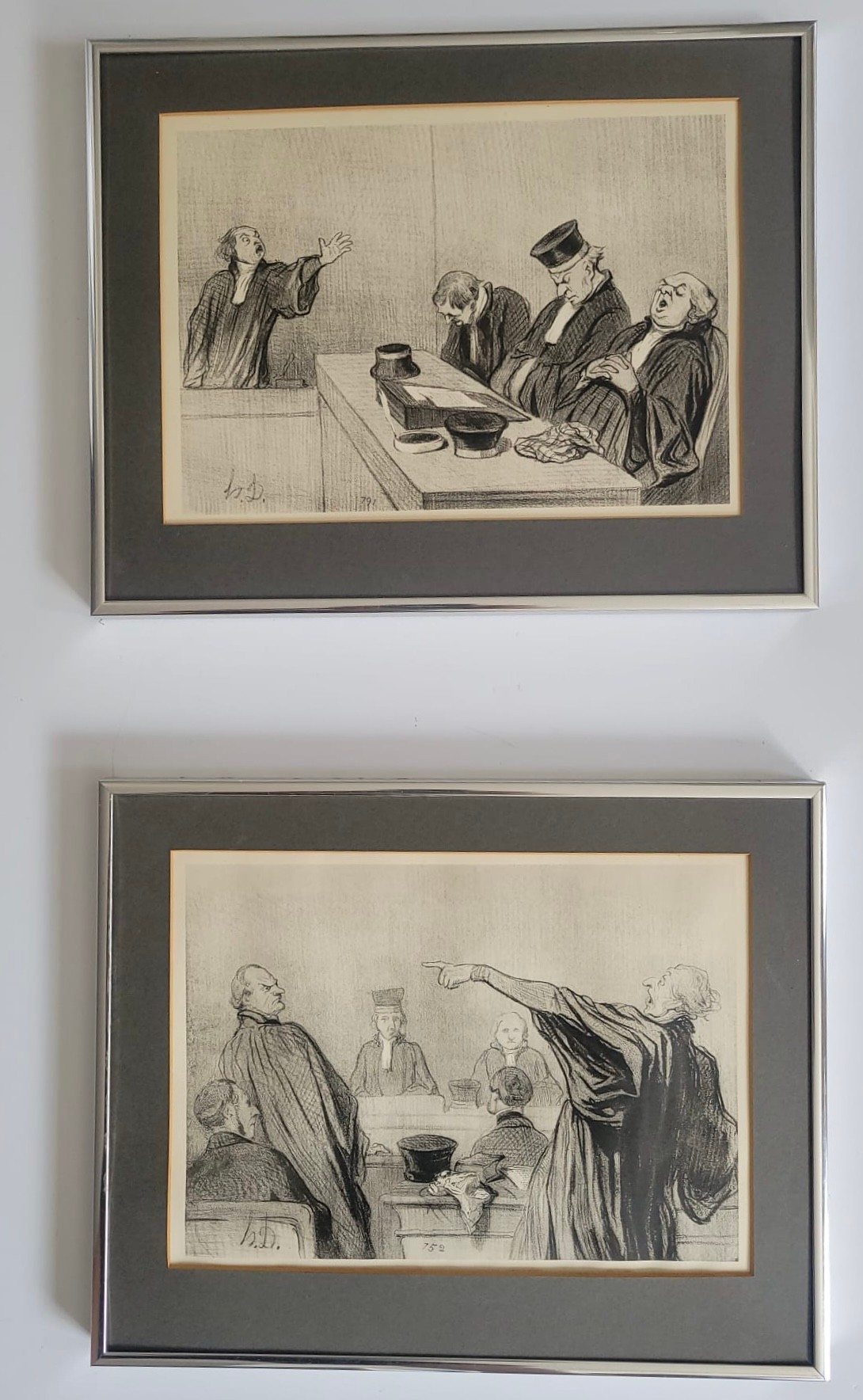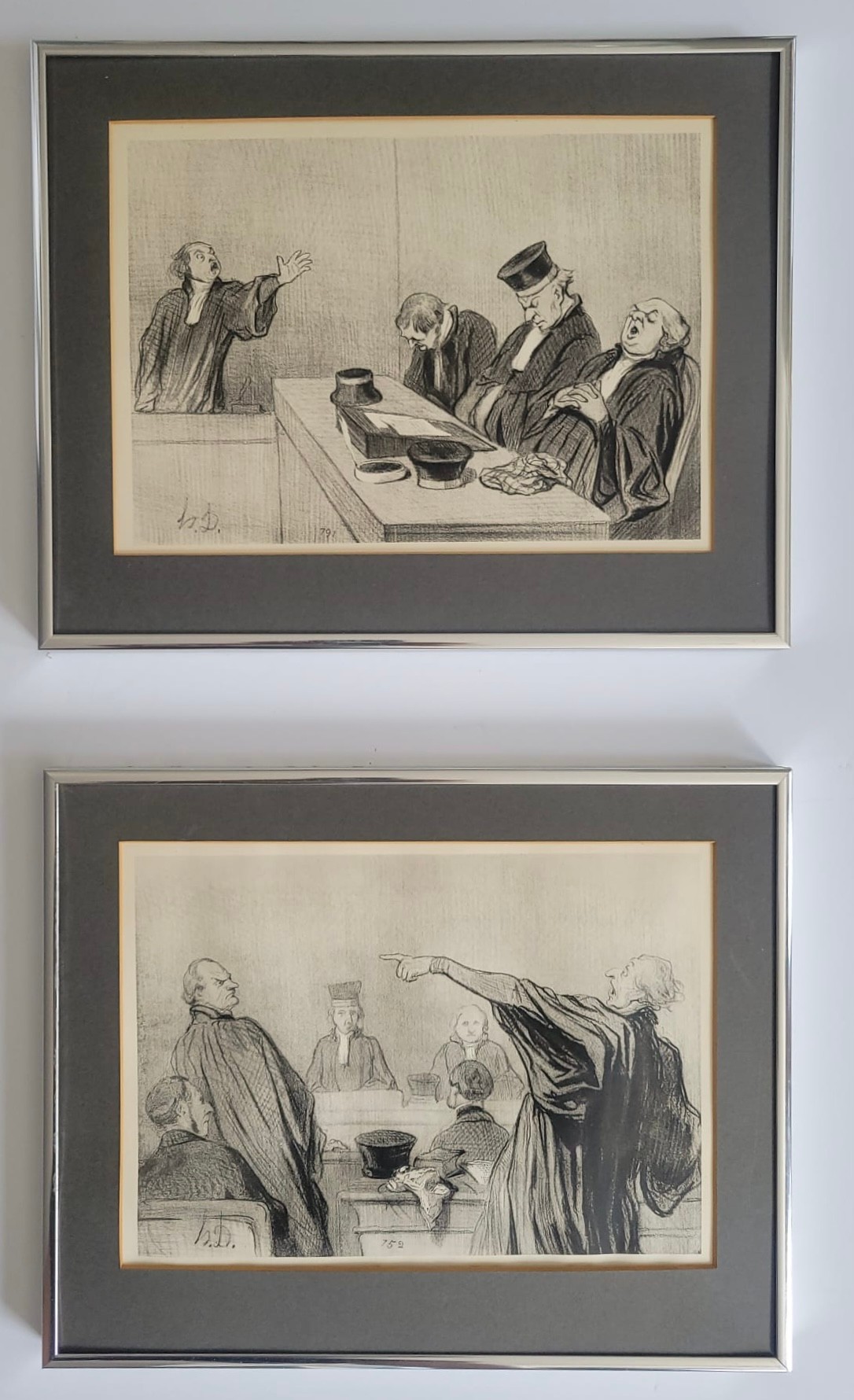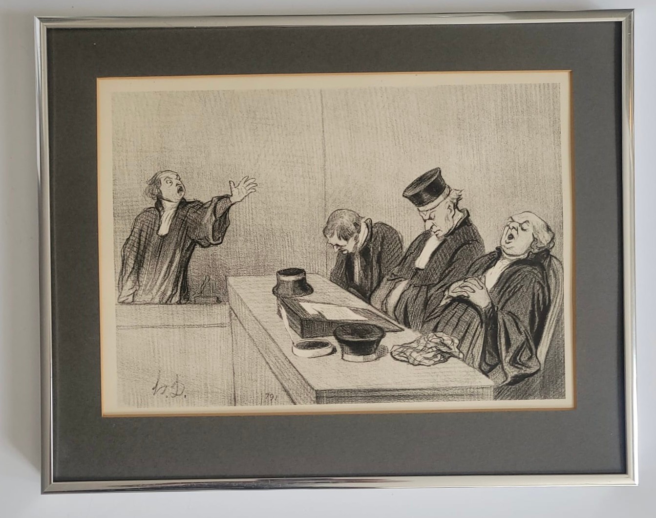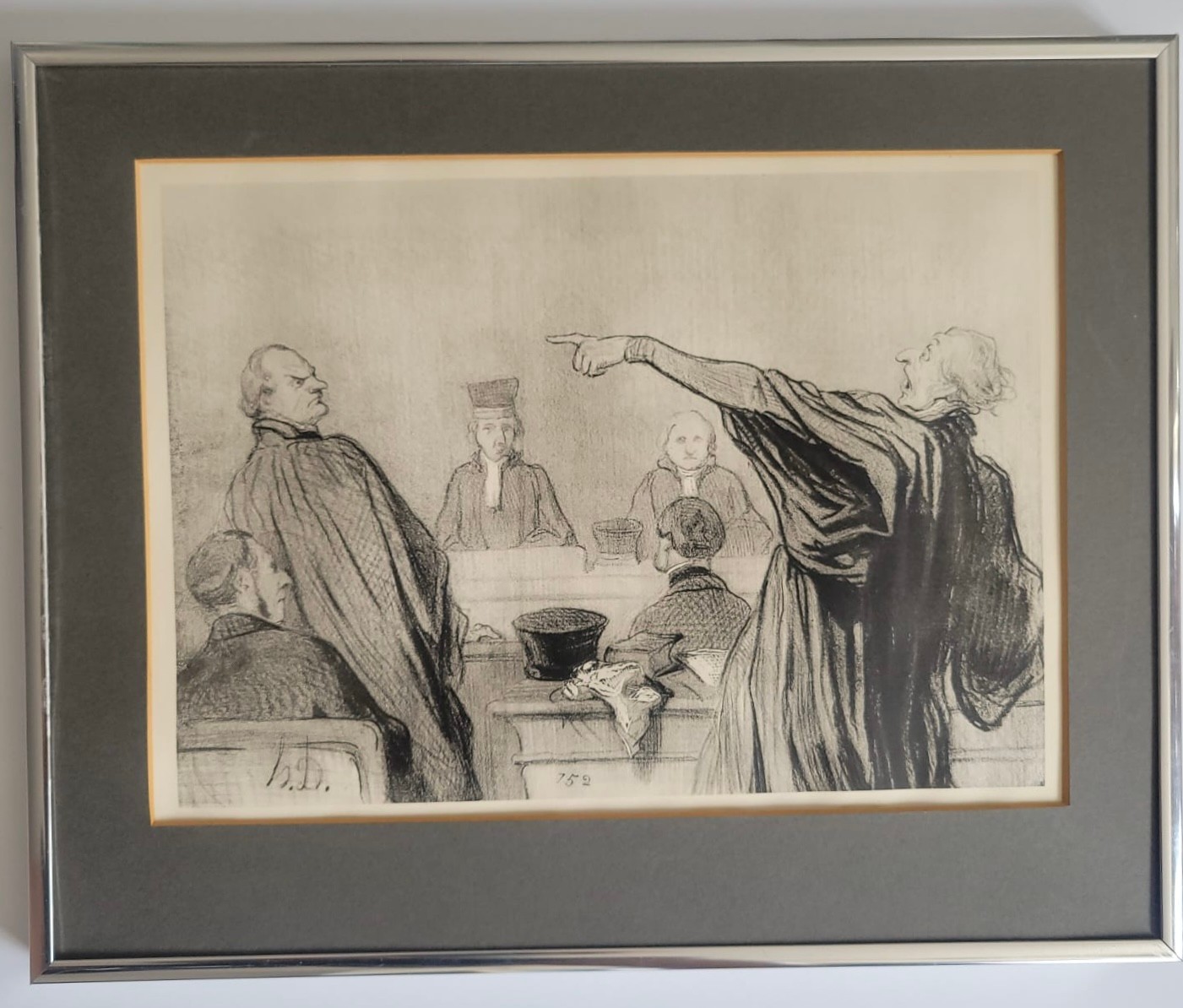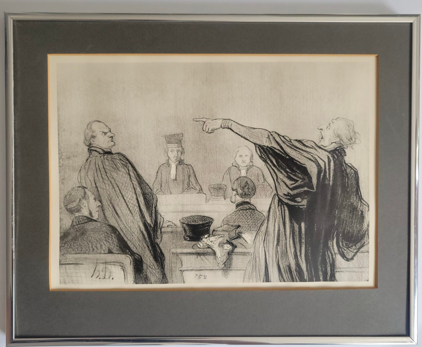 This artwork is a lithograph titled Un Avocat qui est... rempli de la conviction... intime... (A Lawyer Who is Obviously Completely Convinced) by French artist Honoré Daumier, created in 1845