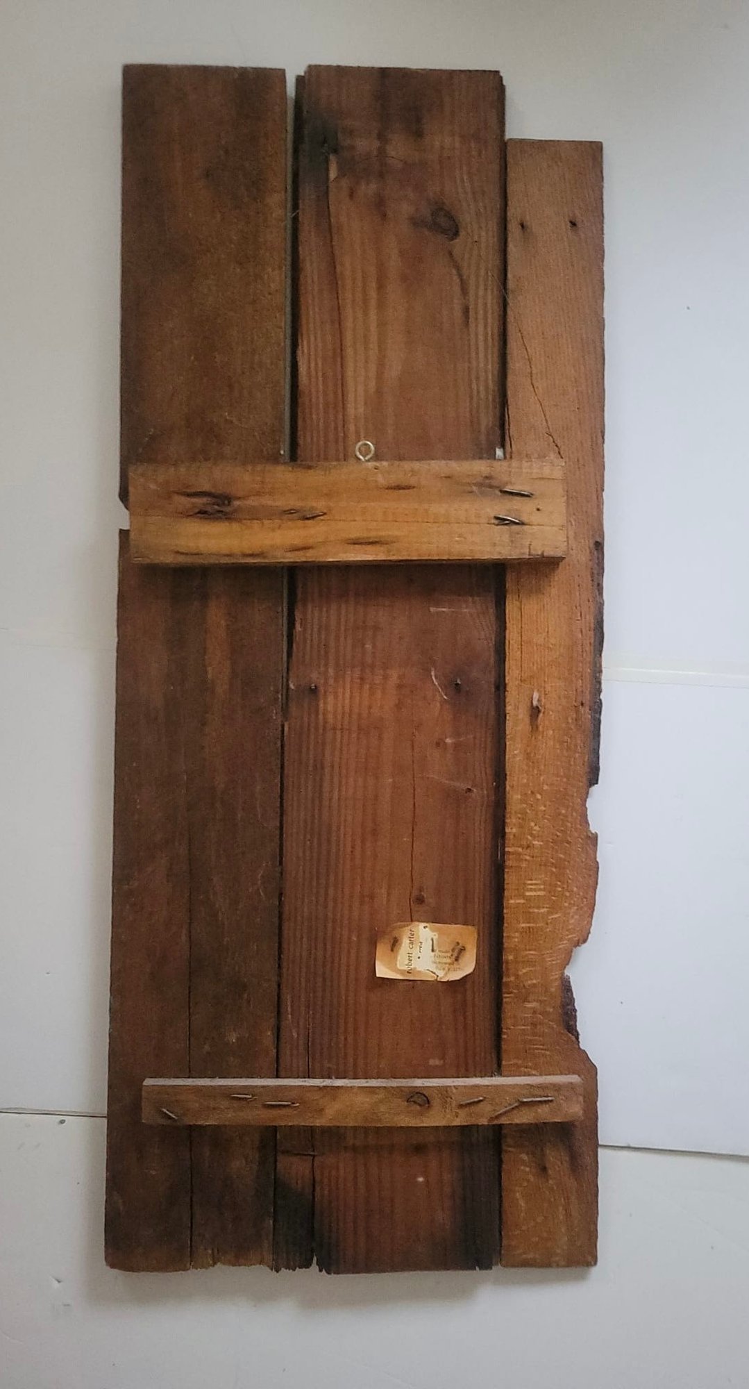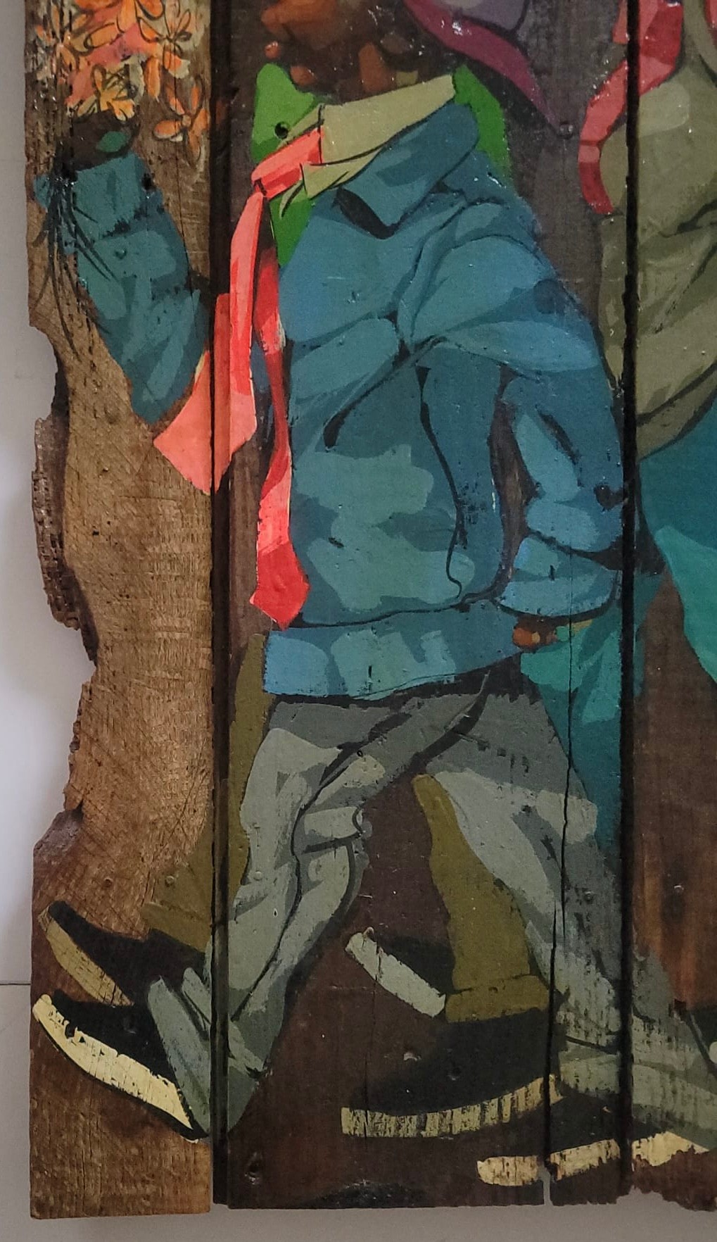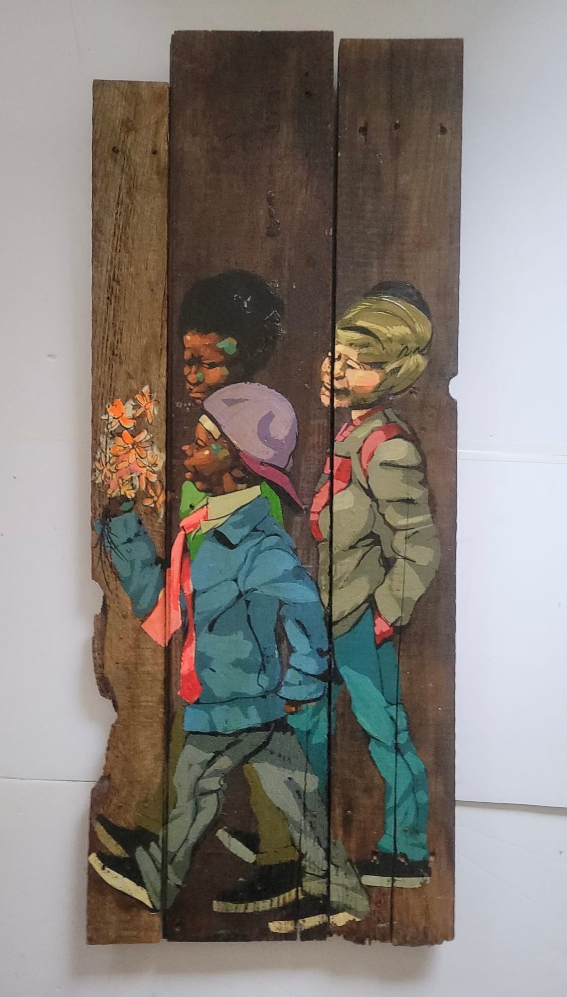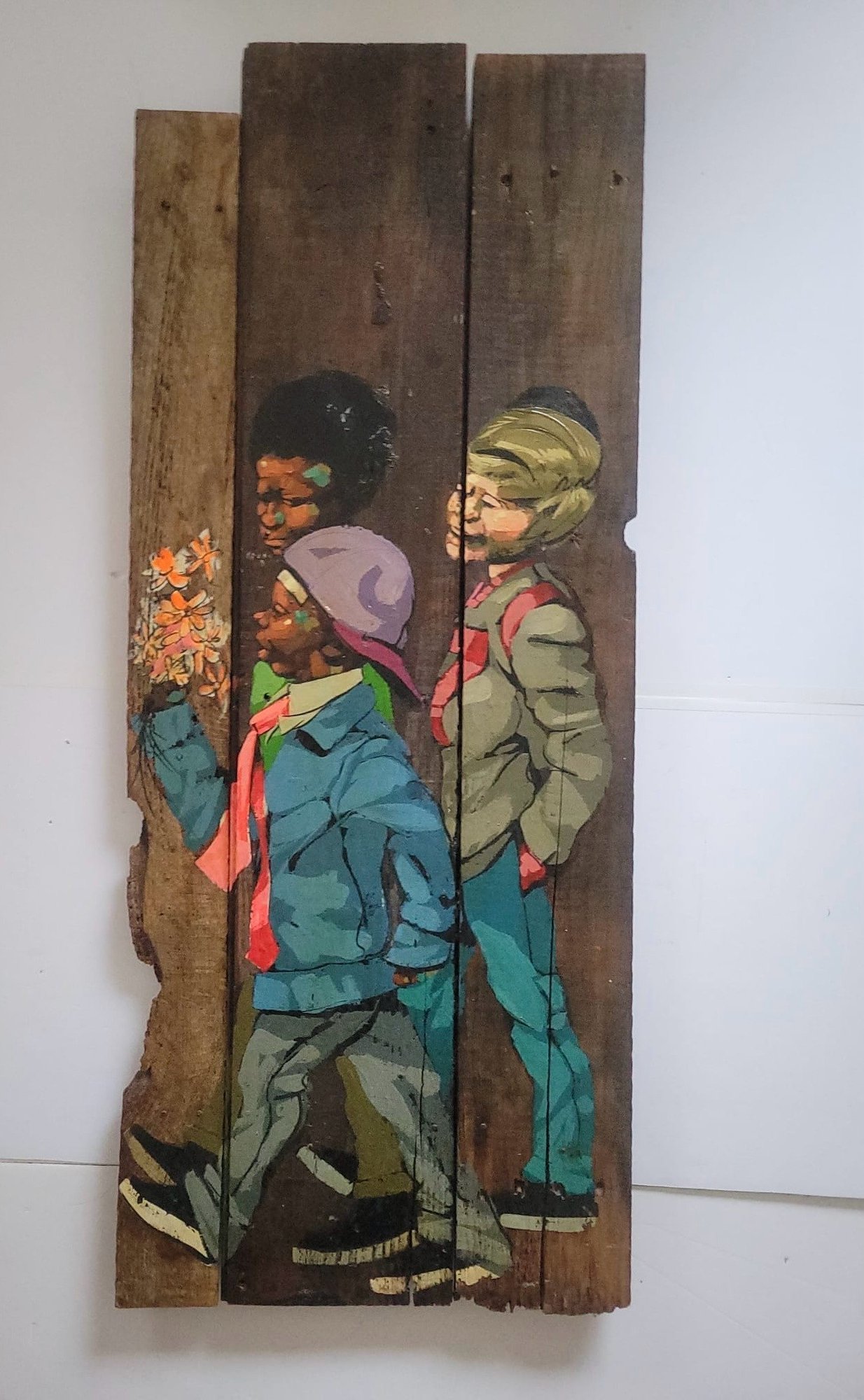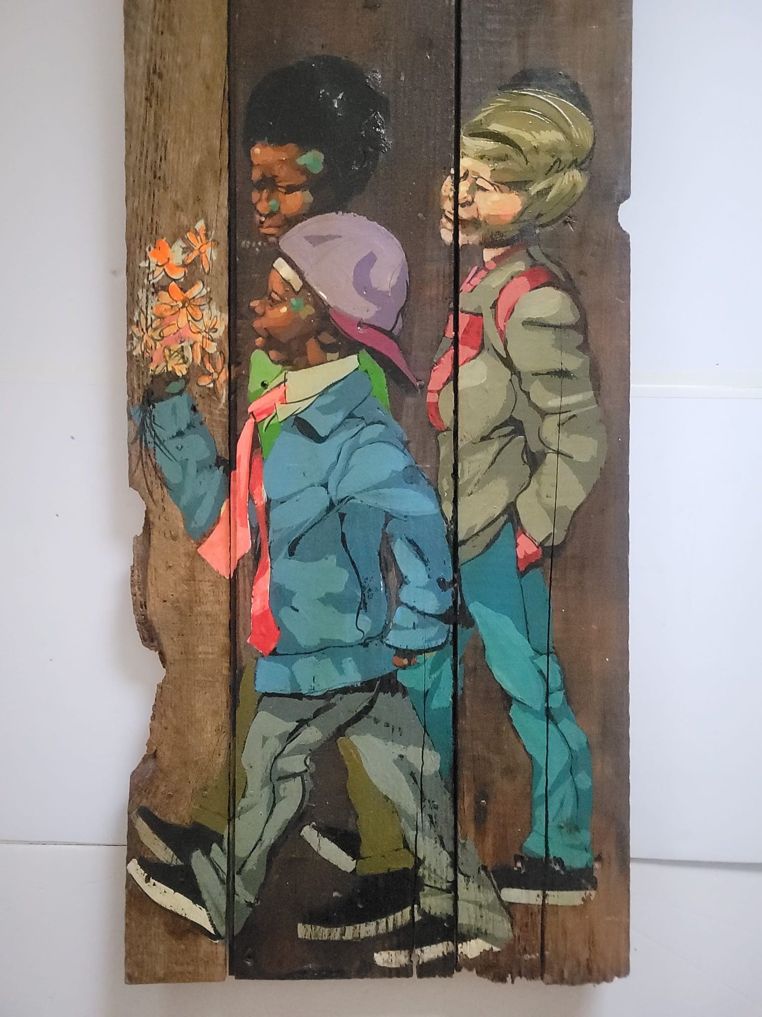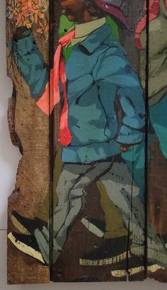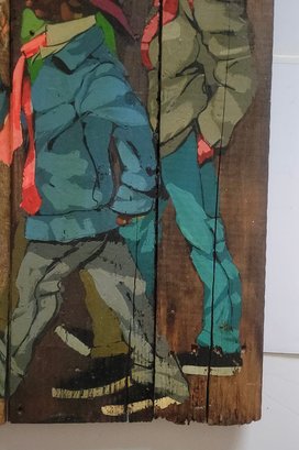 Figurative painting on wood planks, possibly created by American artist Robert Carter.