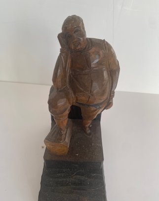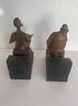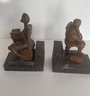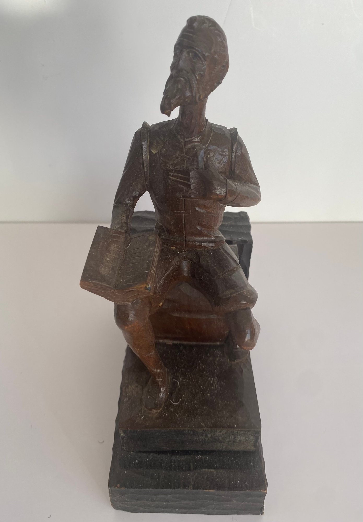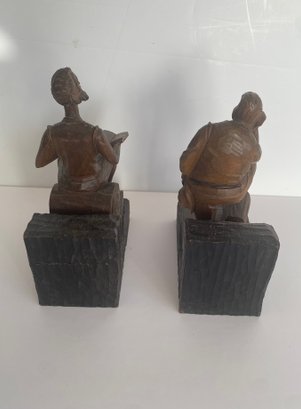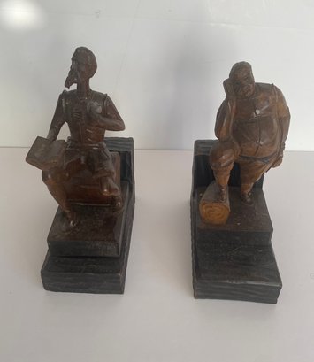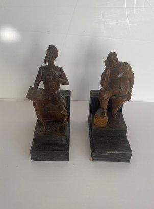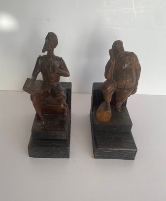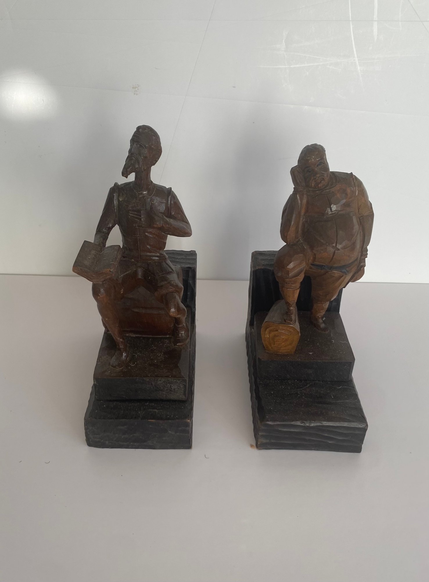 Vintage hand-carved wooden bookends depicting characters from Miguel de Cervantes' novel, Don Quixote. The bookends feature Don Quixote and Sancho Panza, the main characters of the renowned Spanish novel. 8 inches height