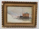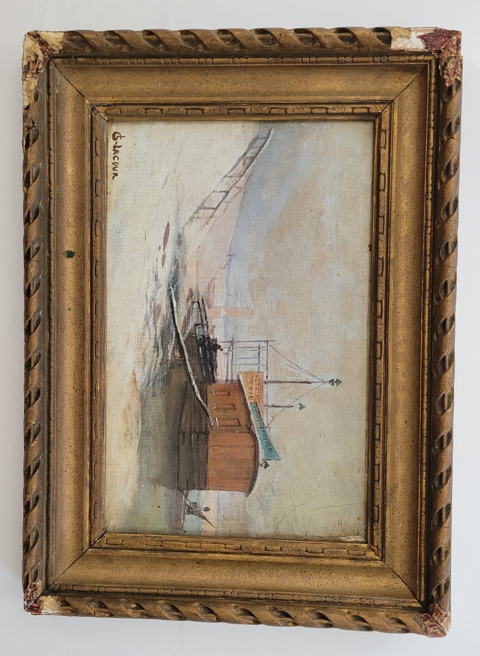 This captivating oil painting by G. Lacour depicts a serene harbor scene, showcasing a rustic barge moored along a snowy shoreline. The muted tones and soft brushstrokes evoke a tranquil winter’s day, while intricate details like the dock, signage, and distant figures add depth and character. Set in a beautifully aged, ornate gold frame with charming signs of wear, this artwork is a timeless piece perfect for vintage art collectors or those seeking to bring a touch of nostalgia and elegance to their decor. Art size 13X9. Frame size 17X13