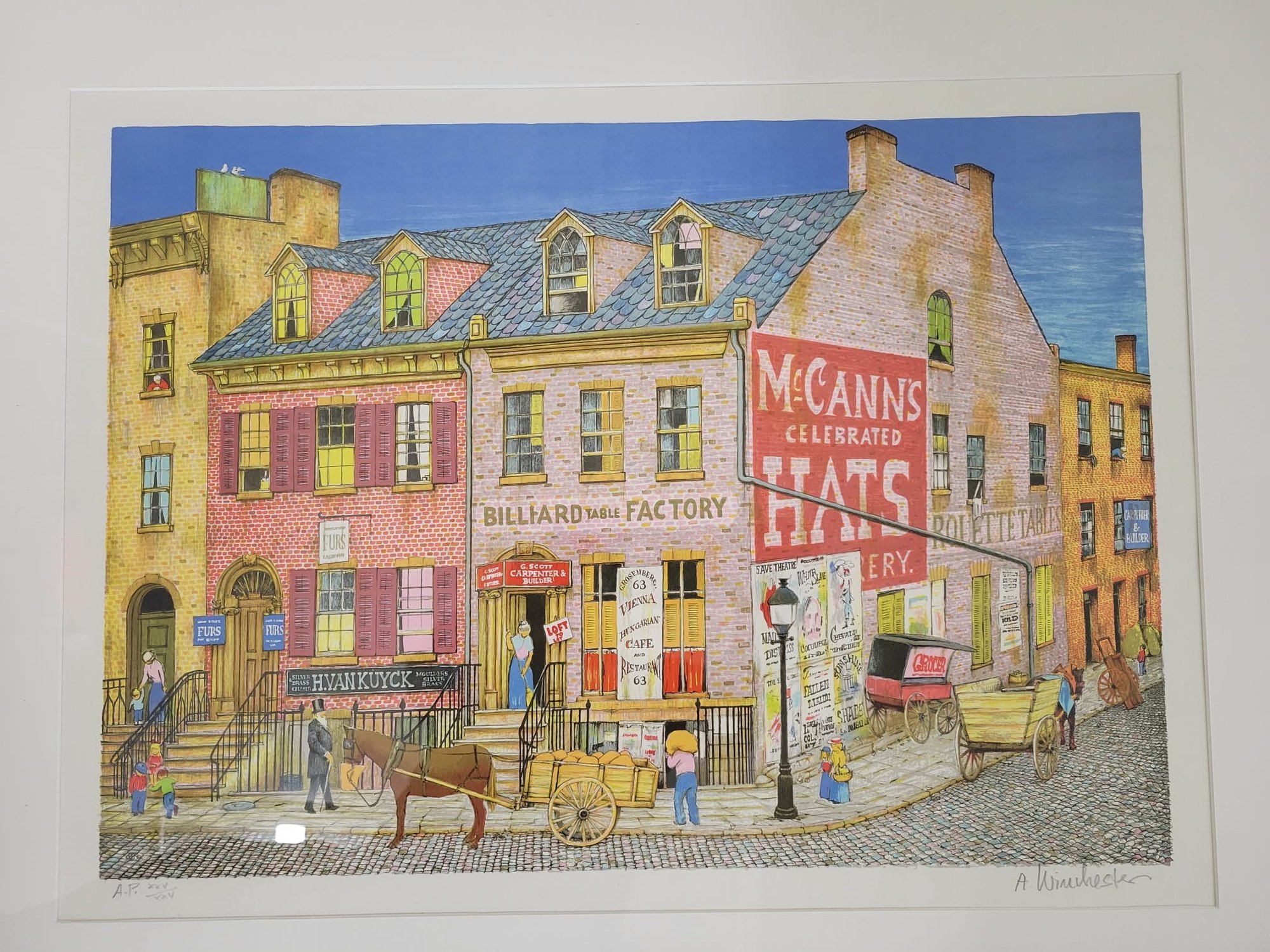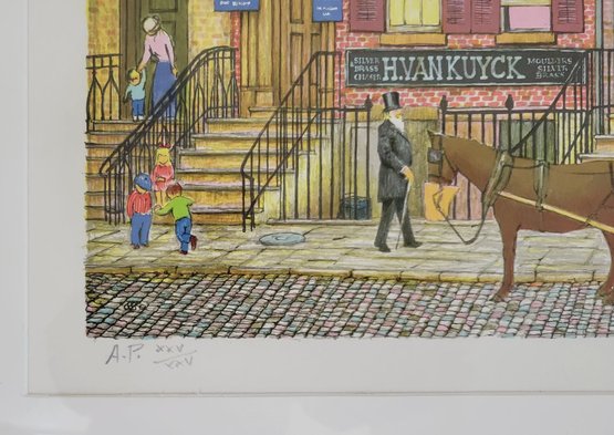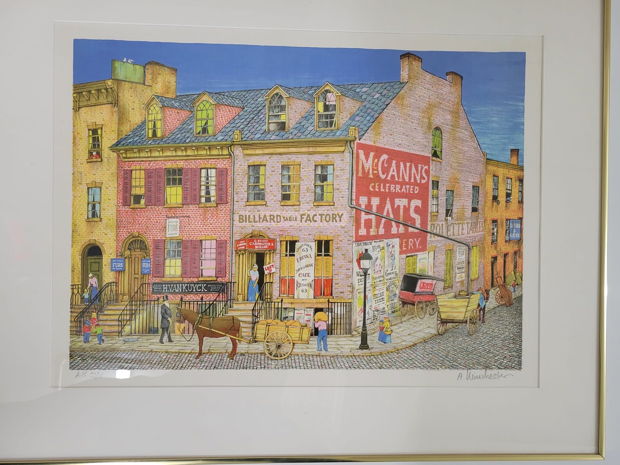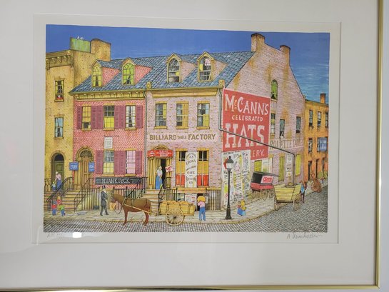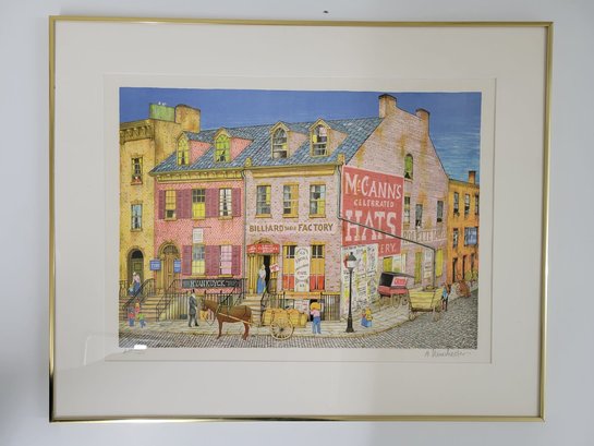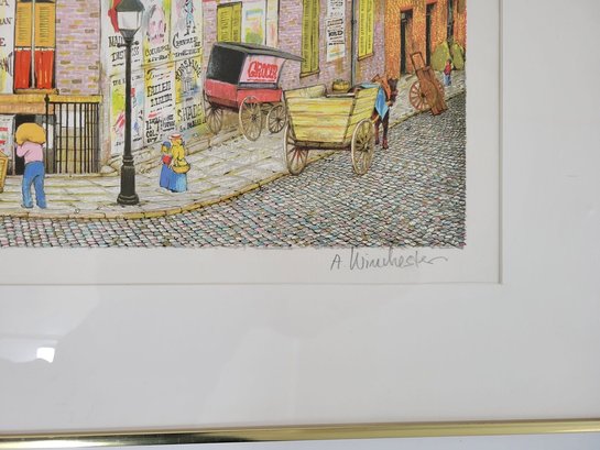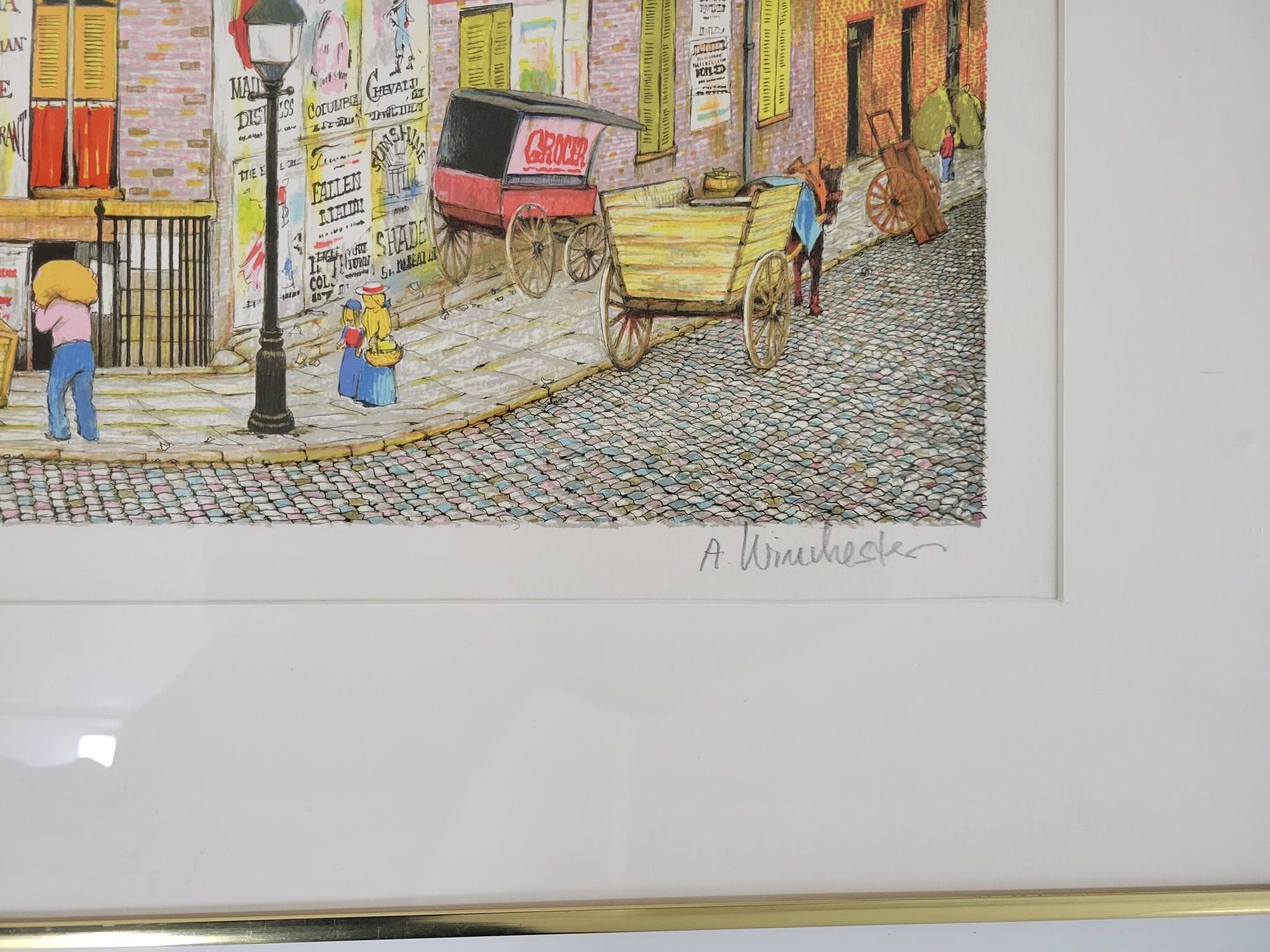 Immerse yourself in the lively world of "The Vibrant Streetscape," a delightful artwork that captures the essence of a bustling neighborhood. Featuring a charming factory scene with colorful buildings, bustling figures, and horse-drawn carts, this piece brings to life the spirit of community and the charm of everyday life. Bring home "The Vibrant Streetscape" and let its cheerful energy transform your environment, celebrating the beauty of community and the joy of daily life! Single mat with Gold Metal Frame. Art Size 22 1/2 x16 1/2 . Frame Size 29X 23