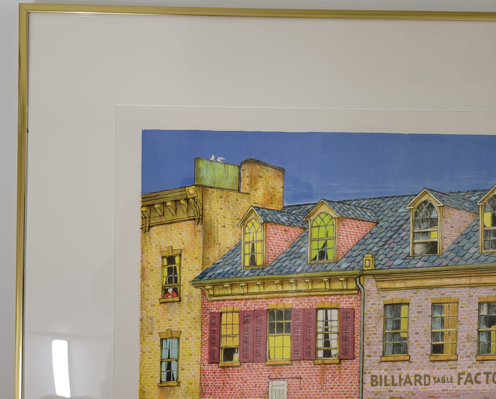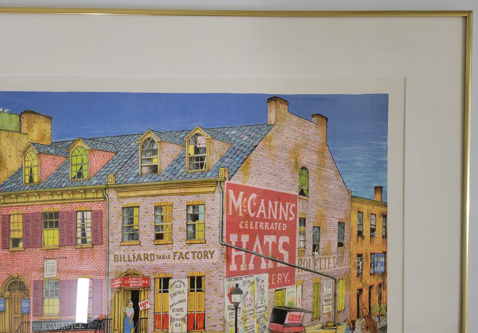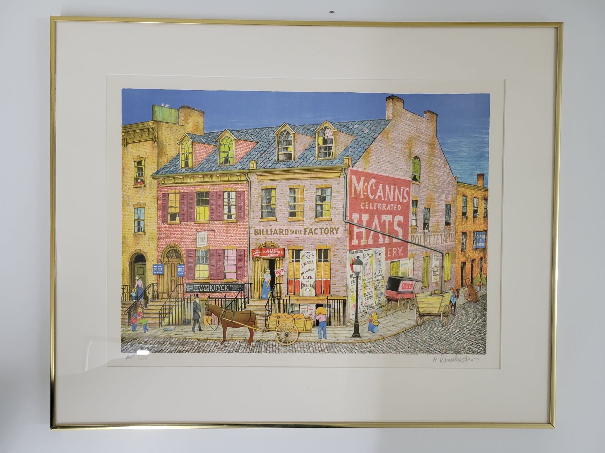 Immerse yourself in the lively world of "The Vibrant Streetscape," a delightful artwork that captures the essence of a bustling neighborhood. Featuring a charming factory scene with colorful buildings, bustling figures, and horse-drawn carts, this piece brings to life the spirit of community and the charm of everyday life. Bring home "The Vibrant Streetscape" and let its cheerful energy transform your environment, celebrating the beauty of community and the joy of daily life! Single mat with Gold Metal Frame. Art Size 22 1/2 x16 1/2 . Frame Size 29X 23