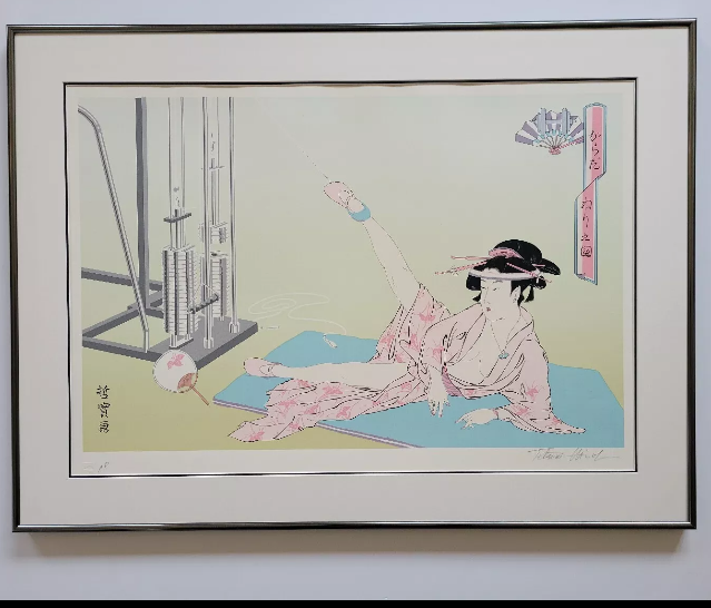 This stunning Artist Proof silkscreen features a captivating Japanese woman in a scene of therapy. The print is pencil signed on the bottom, making it a unique and valuable addition to any art collection. The piece is classified under the categories of Art Prints and Art, and is specifically designed for those interested in Women and Print subjects. Don't miss out on the opportunity to own a piece of art that is sure to impress. Artist Proof silkscreen, Pencil signed on Bottom / Japanese woman in Therapy. Embossed paper on left bottom, double mats with a shiny gray metal frame. Art size ( 25 × 17 ). Frame size ( 30 1/2 × 22 1/2 )