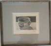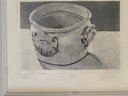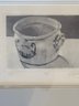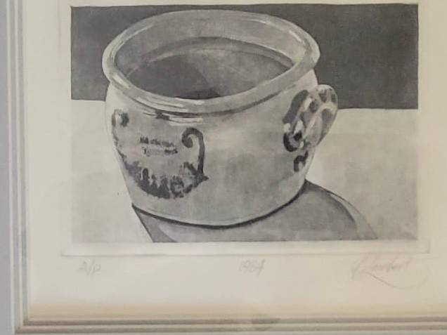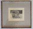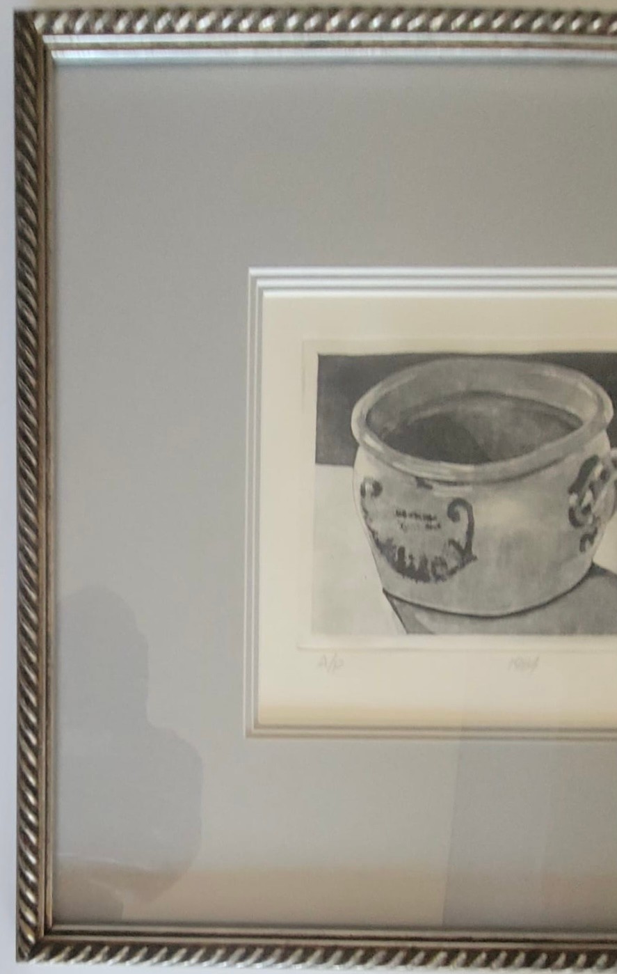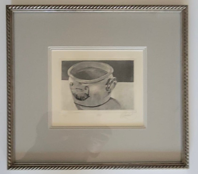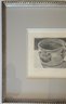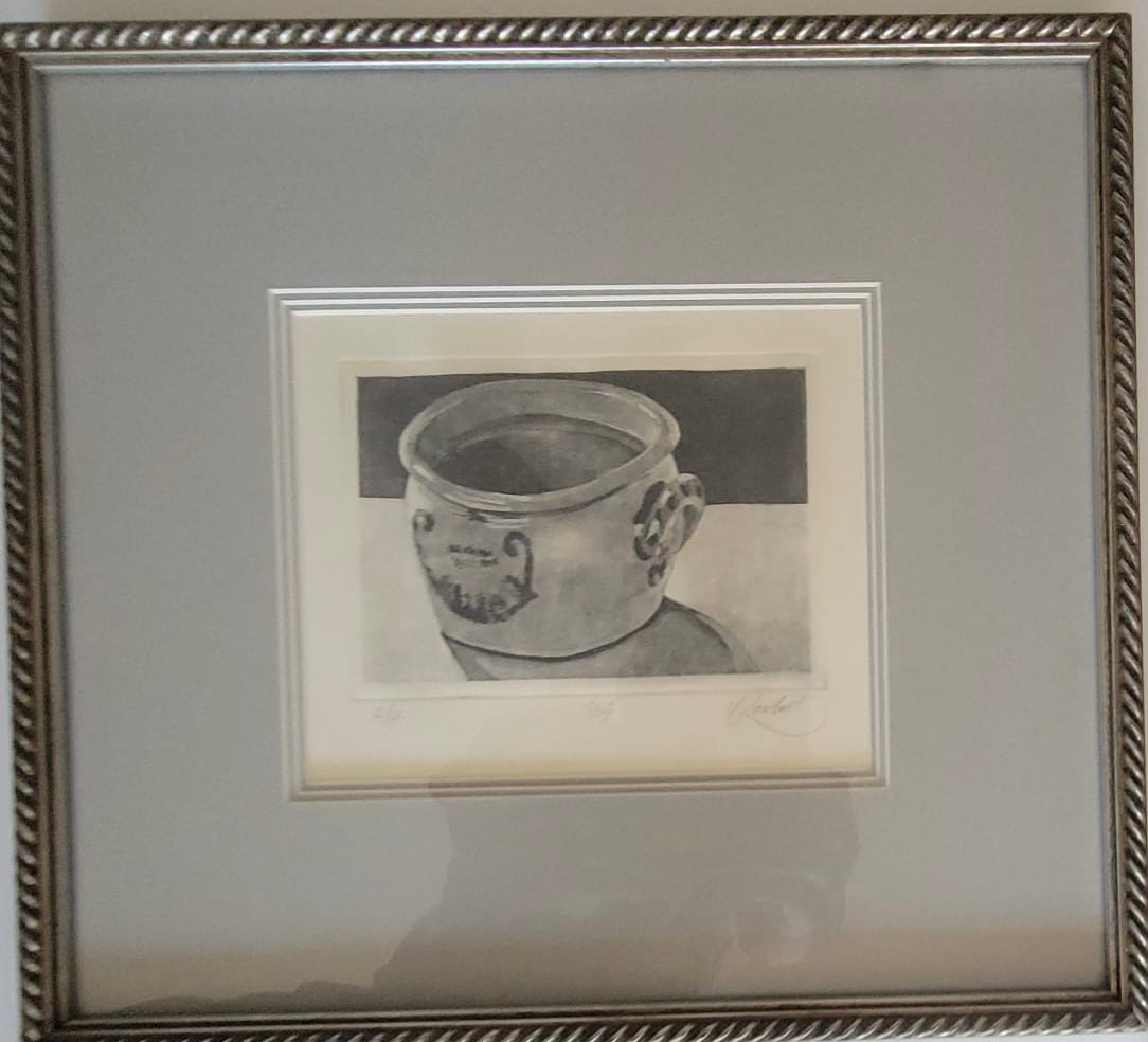 This item is a framed still life painting of A reflective pewter drinking vessel