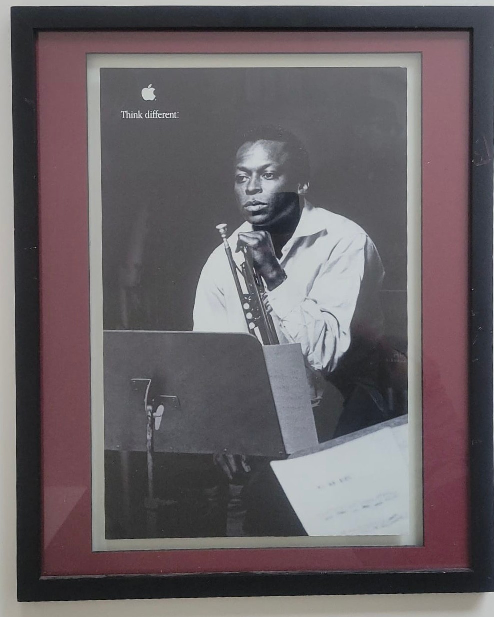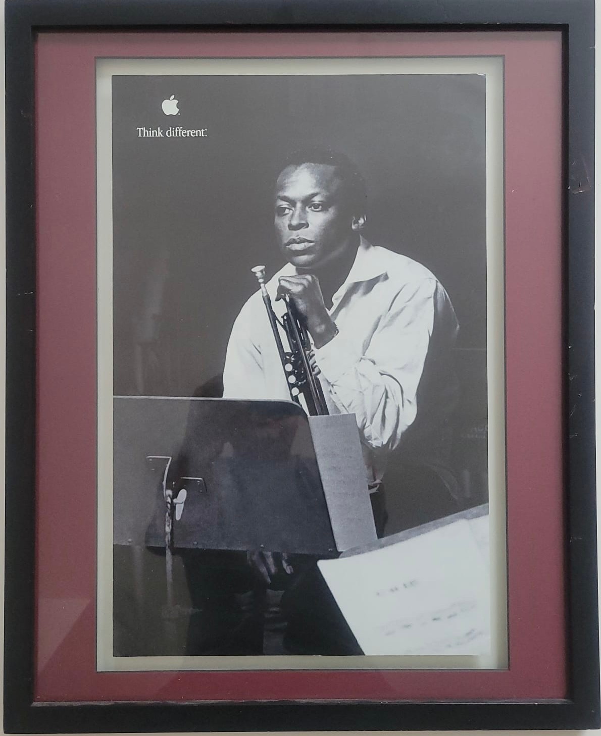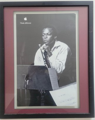 Black And White Poster Print From Apple's Think Different Campaign Featuring Miles Davis an American jazz trumpeter, widely considered one of the most influential musicians of the 20th century.Campaign: It is a print advertisement from Apple's iconic "Think Different" marketing campaign, which celebrated influential creative figures.