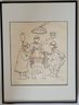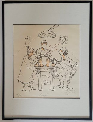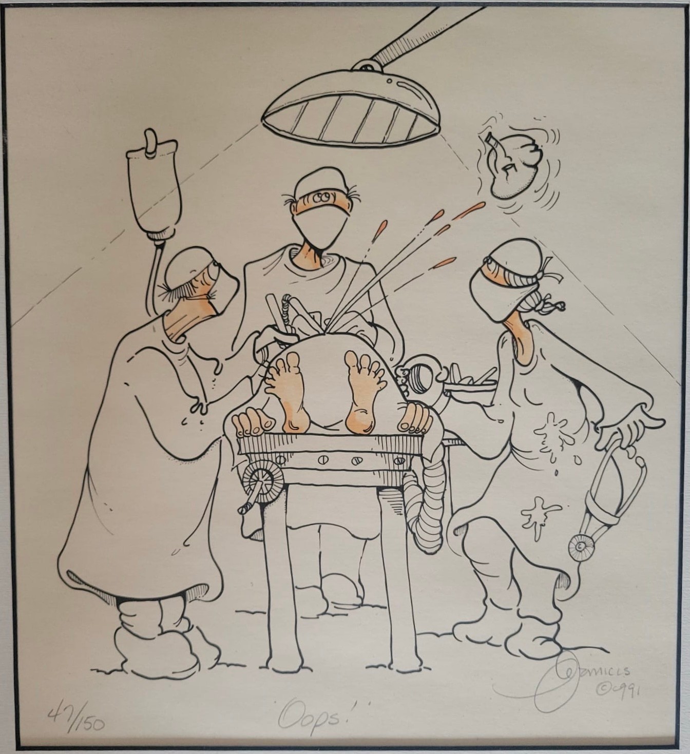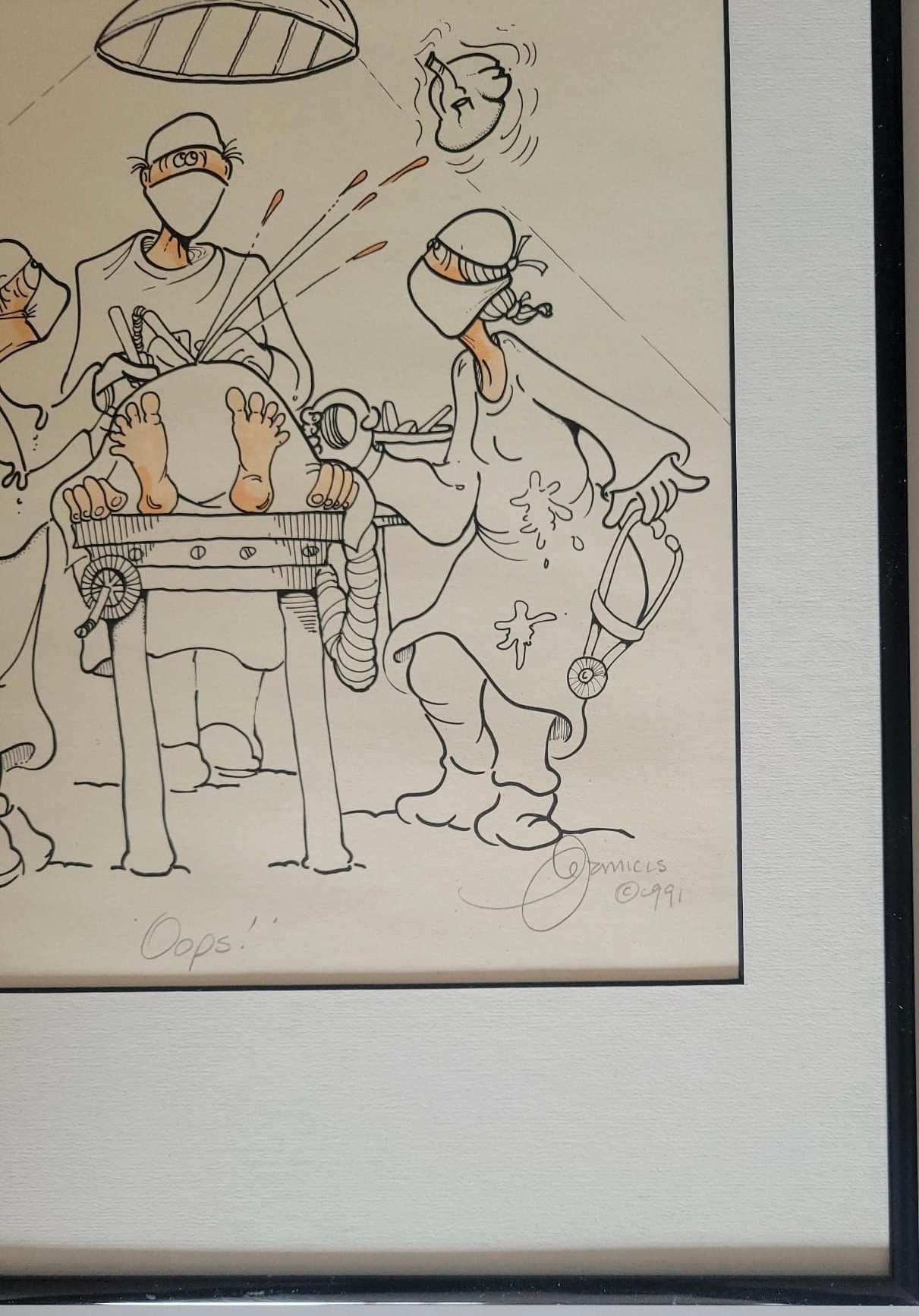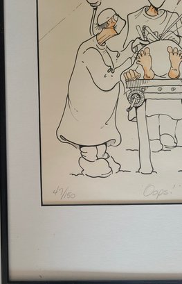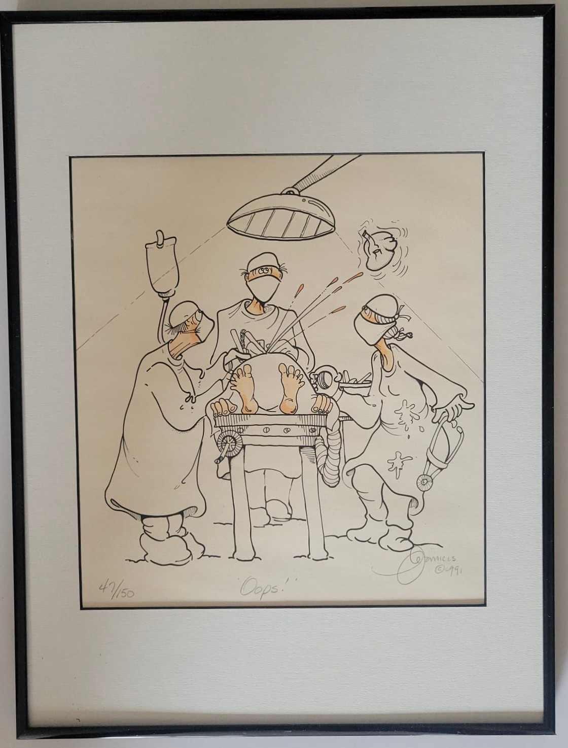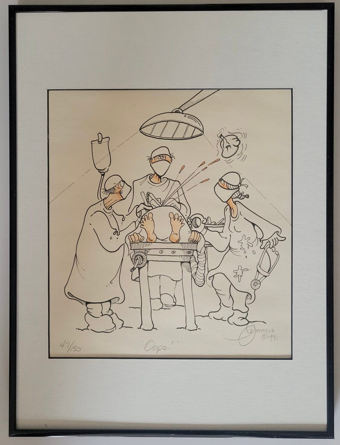 Framed cartoon print titled "Oops", likely a collectible piece of art depicting a humorous surgical mishap in an operating room. The cartoon features a distinct sketch-like ink drawing style similar to work by cartoonists such as Gary Larson.