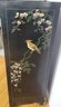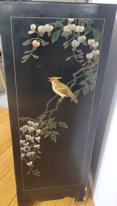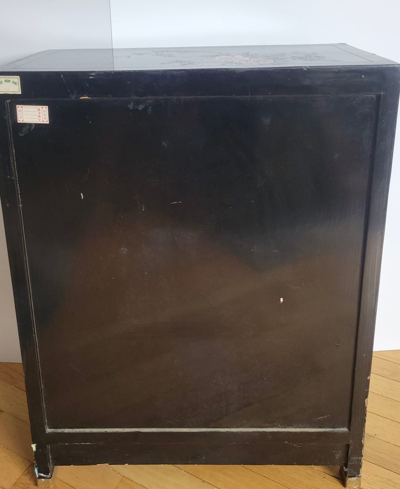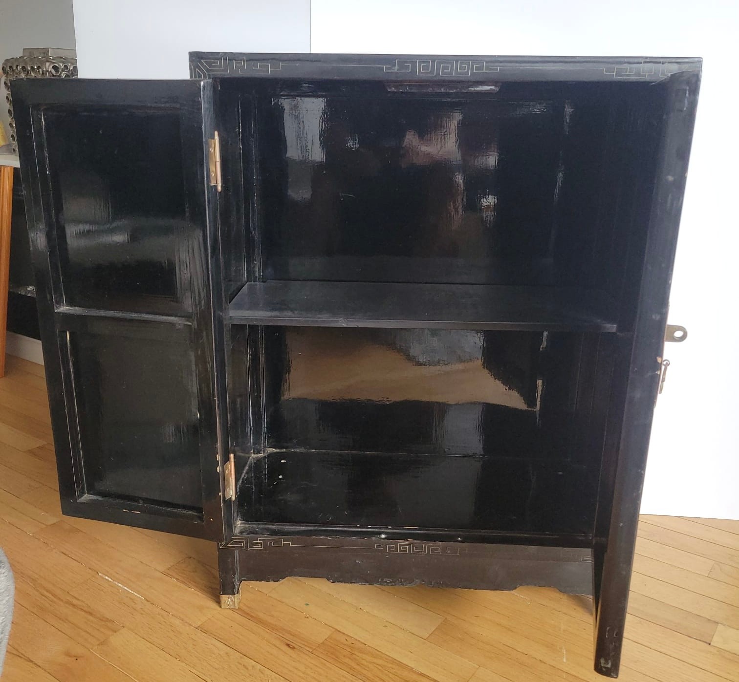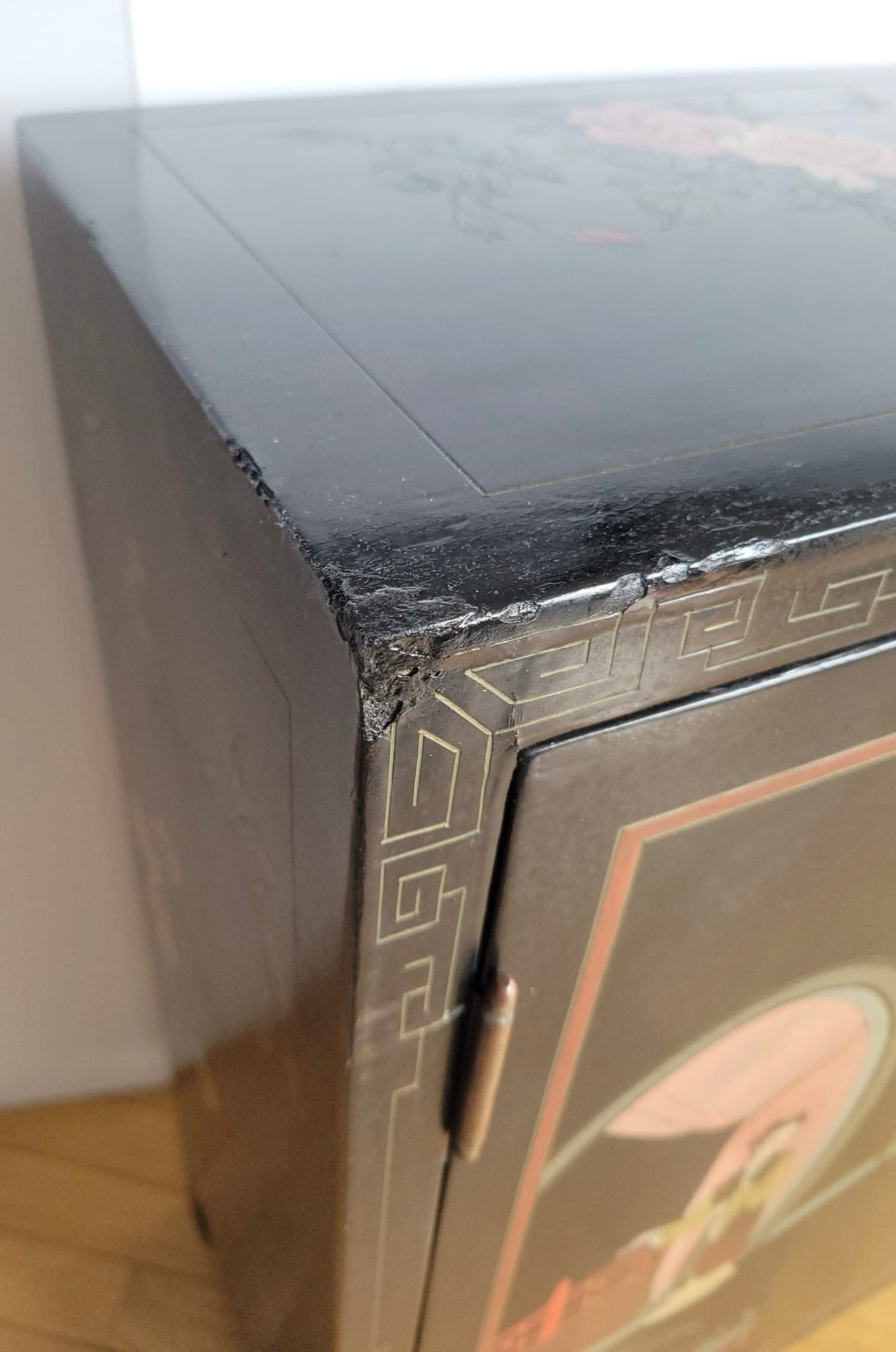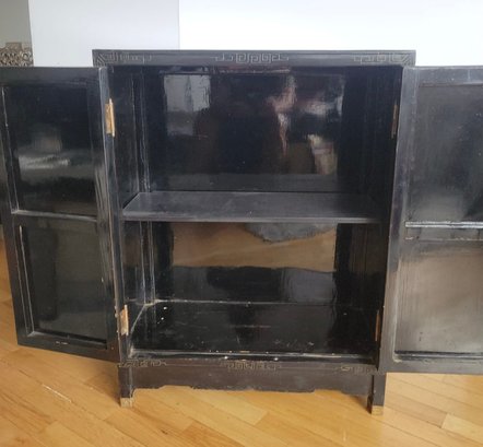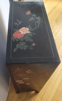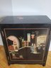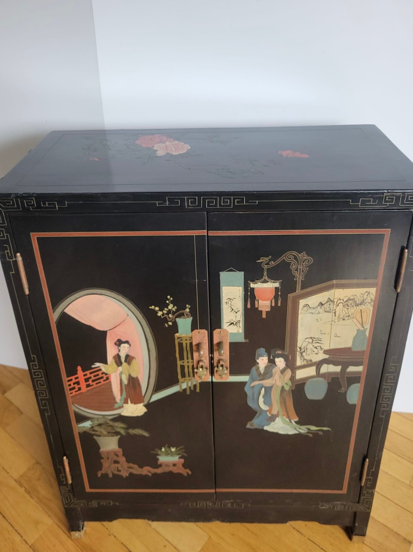 Chinese black lacquer cabinet featuring hand-painted Chinoiserie scenes and brass hardware