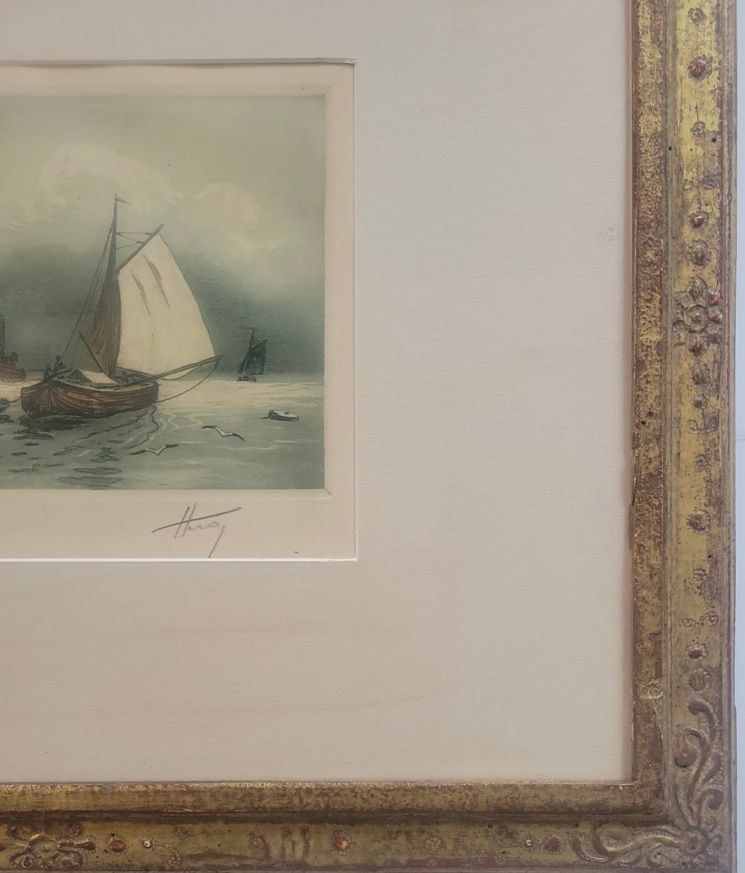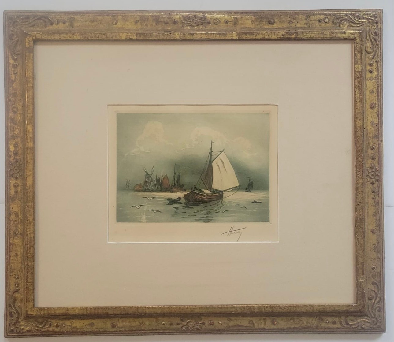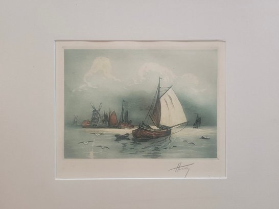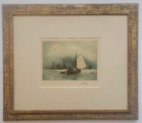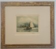 Color Etching Of A Marine Scene with Sailing Vessels.