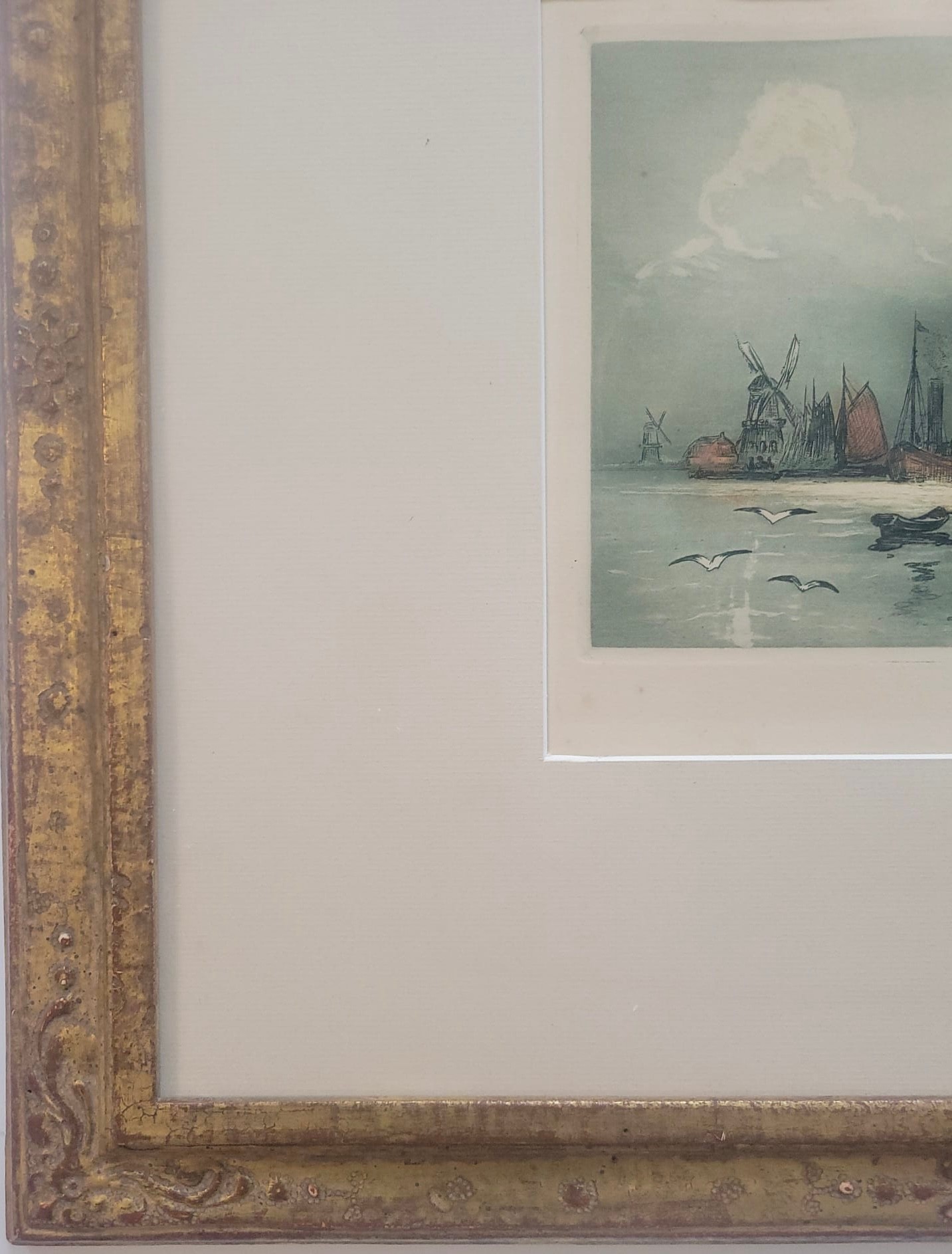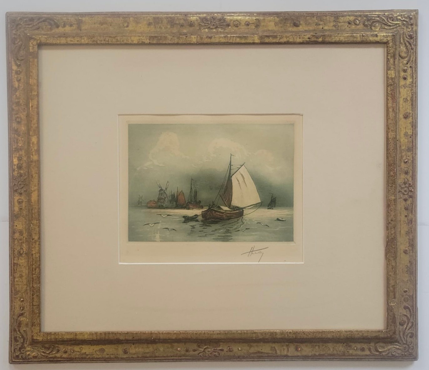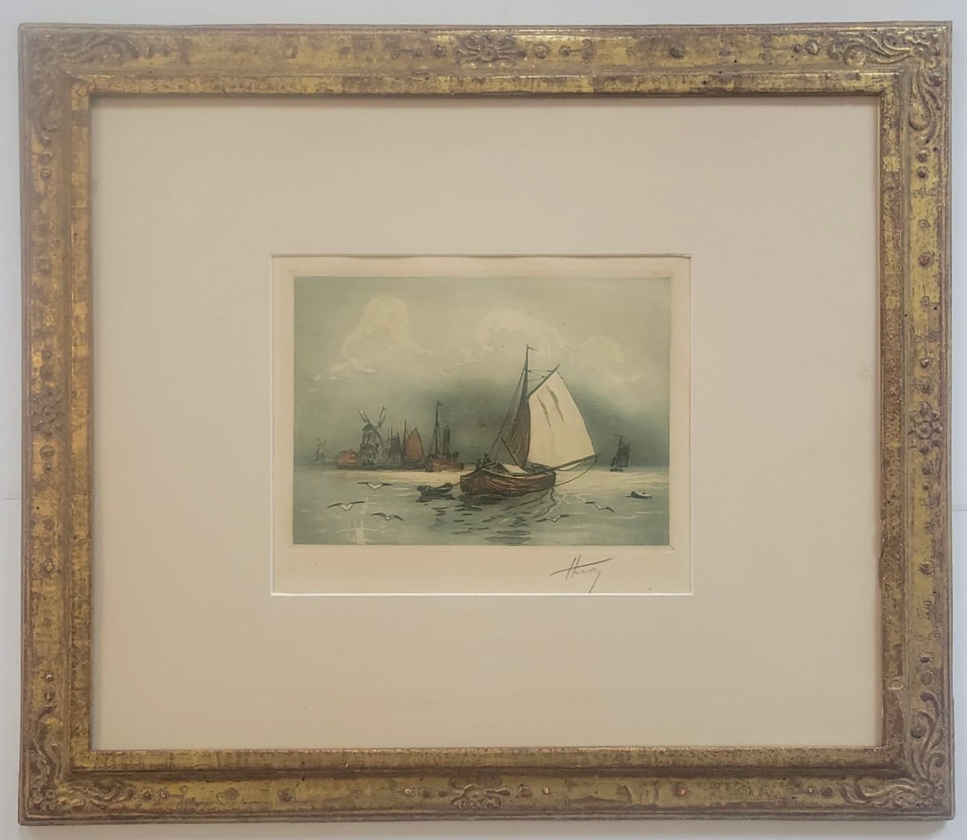 Color Etching Of A Marine Scene with Sailing Vessels.