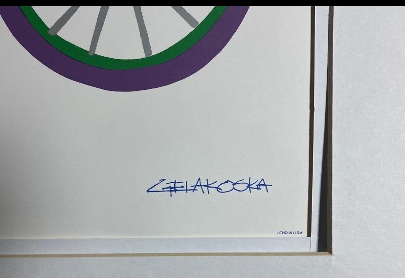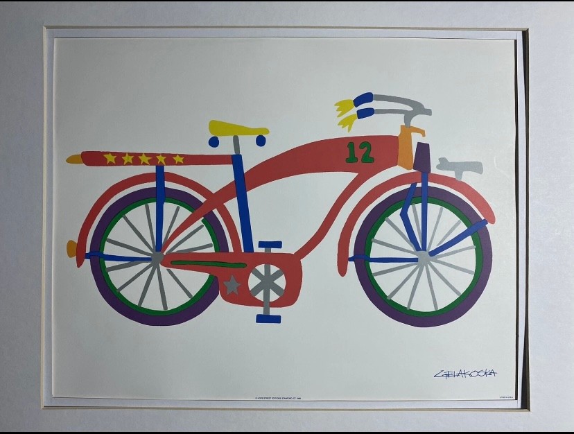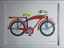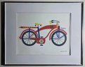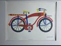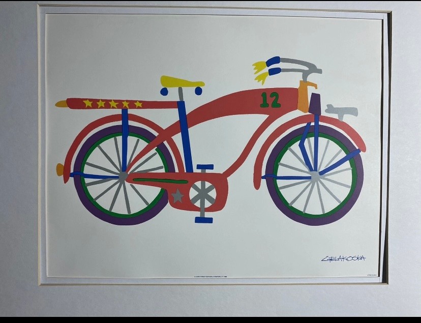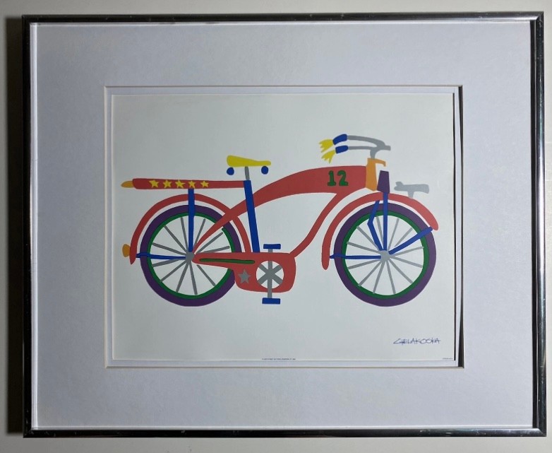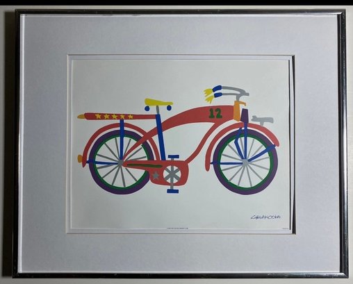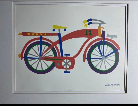 Framed lithograph print of a bicycle by artist Daniel Gelakoska. The subject of the art is a bicycle with the number "12" on the frame. Features: Double Mat with Old Silver Metal Frame. Art Size 14x11. Frame Size 20x16