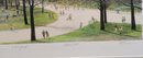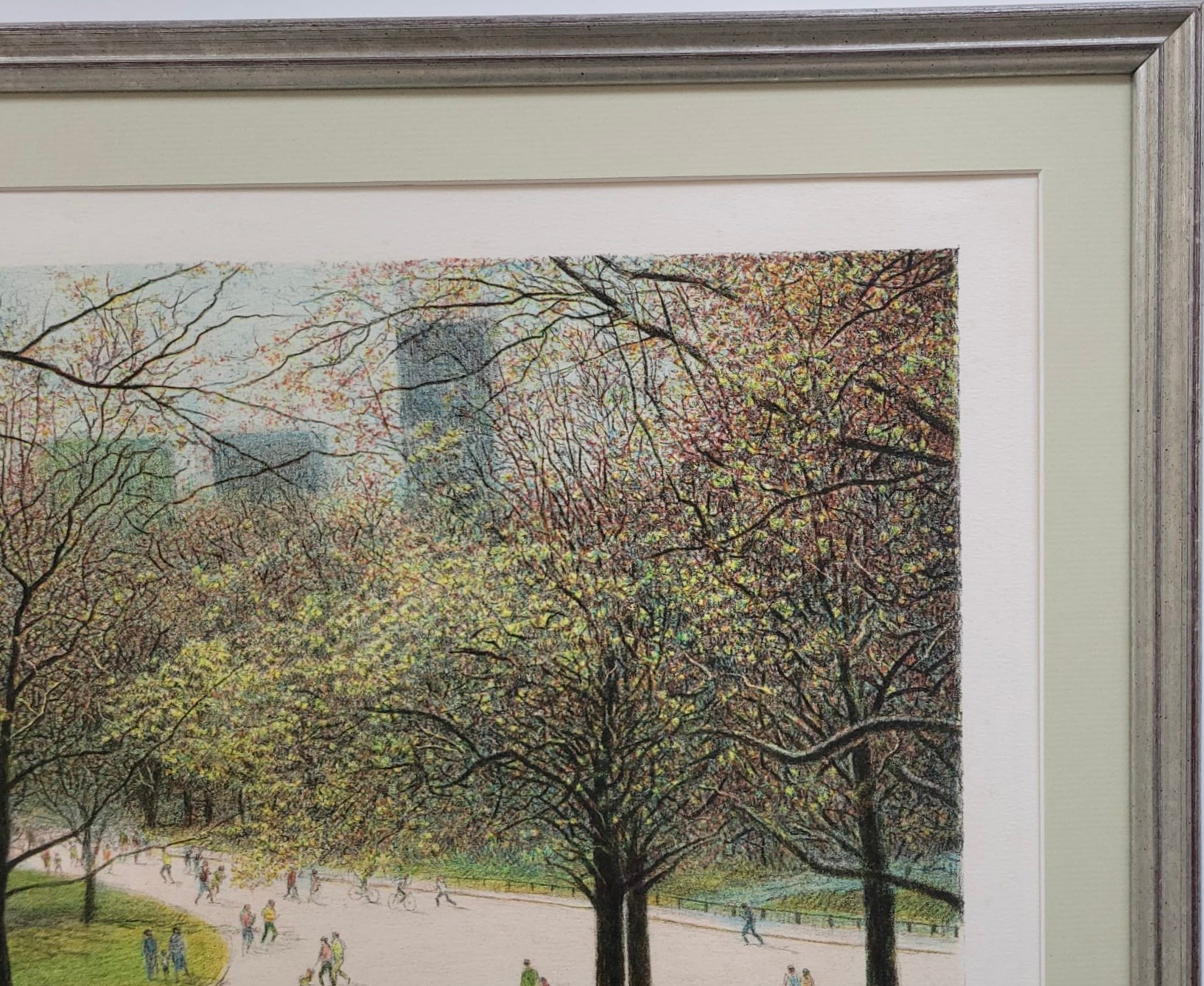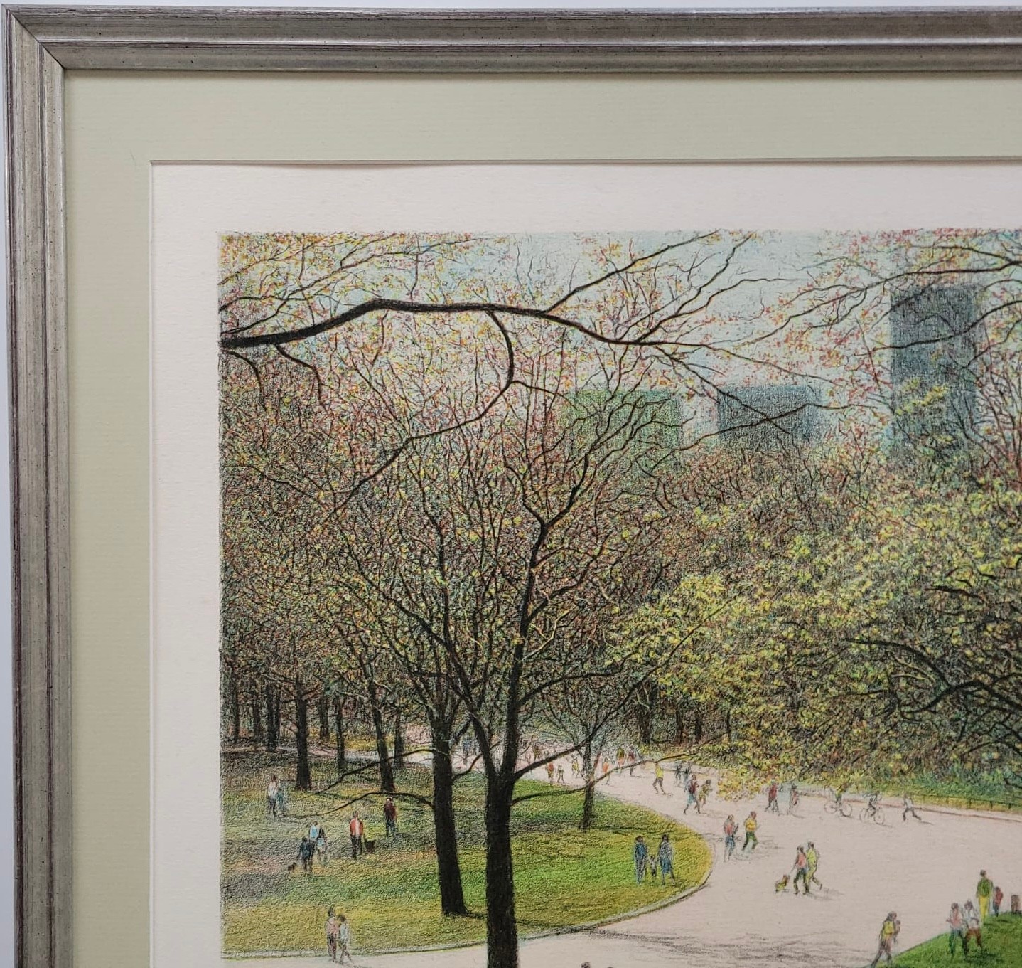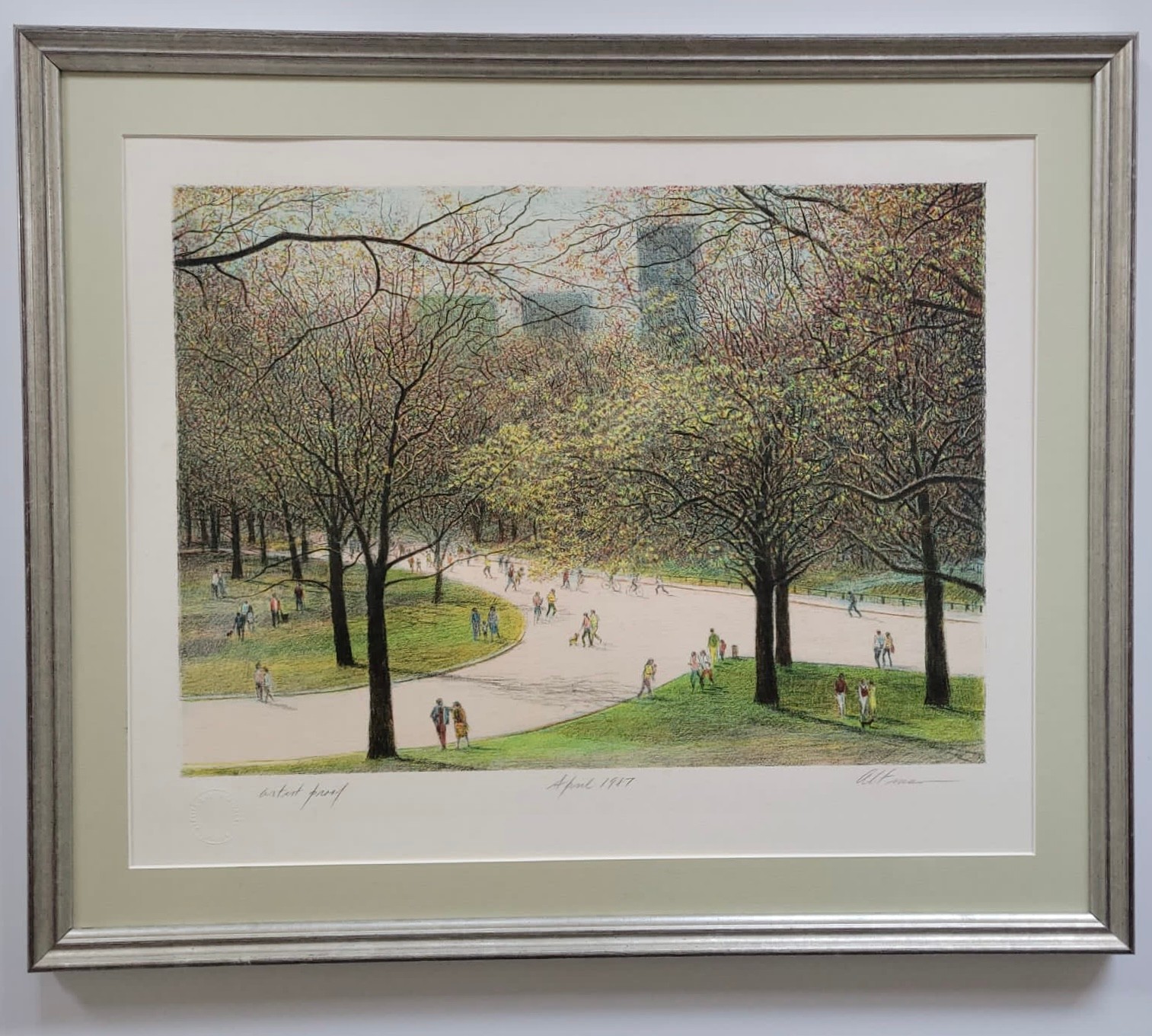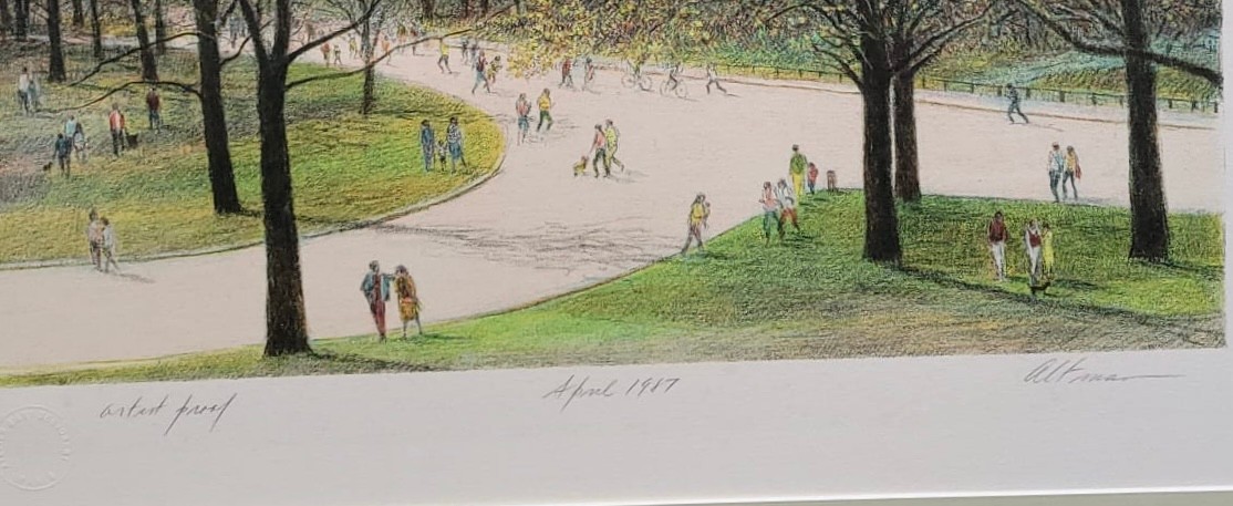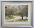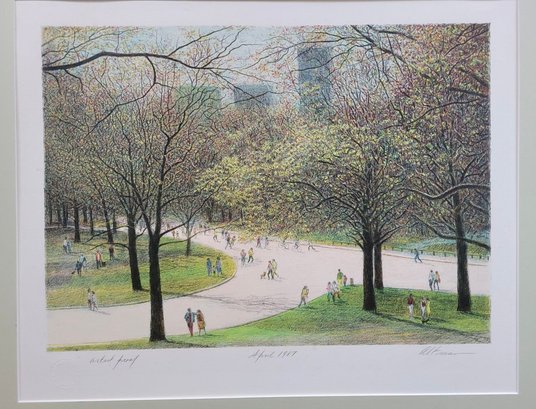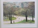 The artwork depicts a serene spring scene in New York's Central Park with people walking along paths