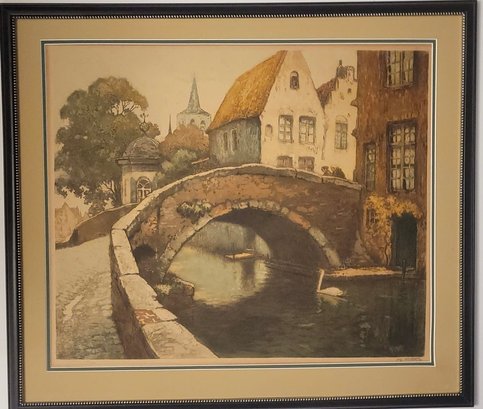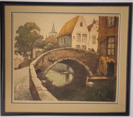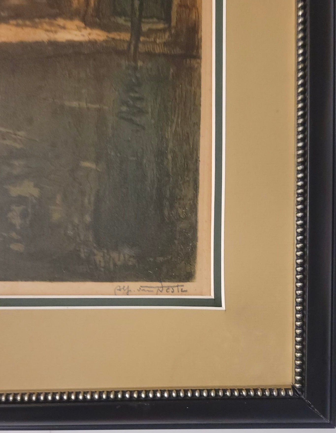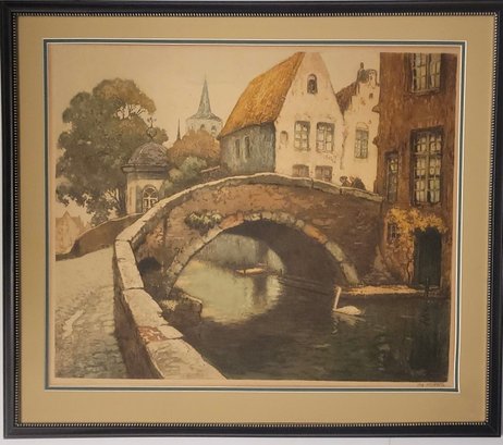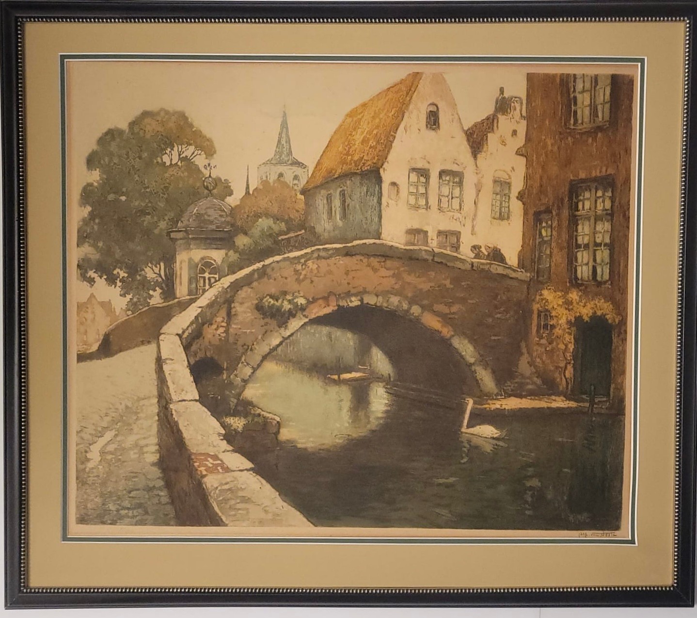 Colored etchingprint depicting a canal scene in Bruges, Belgium, by the Belgian artist Alfred Joseph Auguste Van Neste (1874–1969).