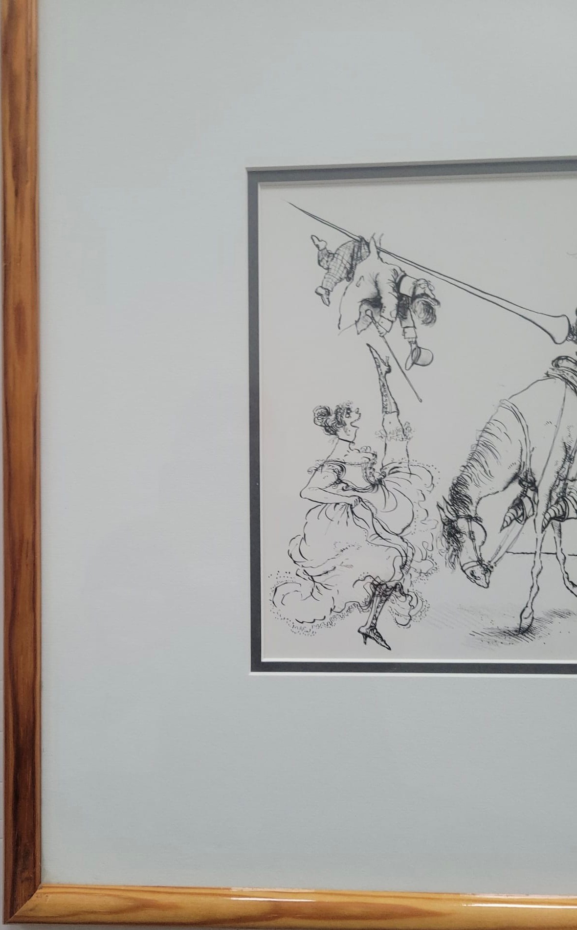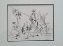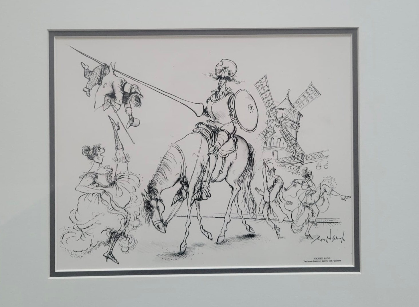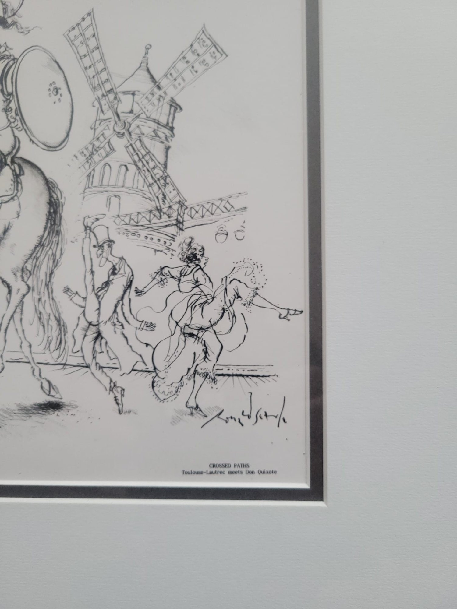 Drawing titled Crossed Paths: Toulouse-Lautrec Meets Don Quixote by the British artist and cartoonist Ronald Searle. This unique piece of black-and-white art masterfully blends the iconic character of Don Quixote with the style and subjects of French artist Henri de Toulouse-Lautrec