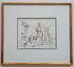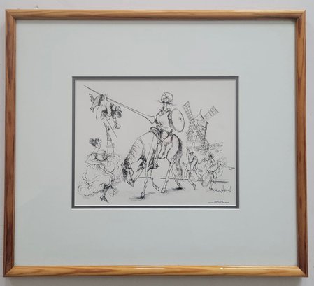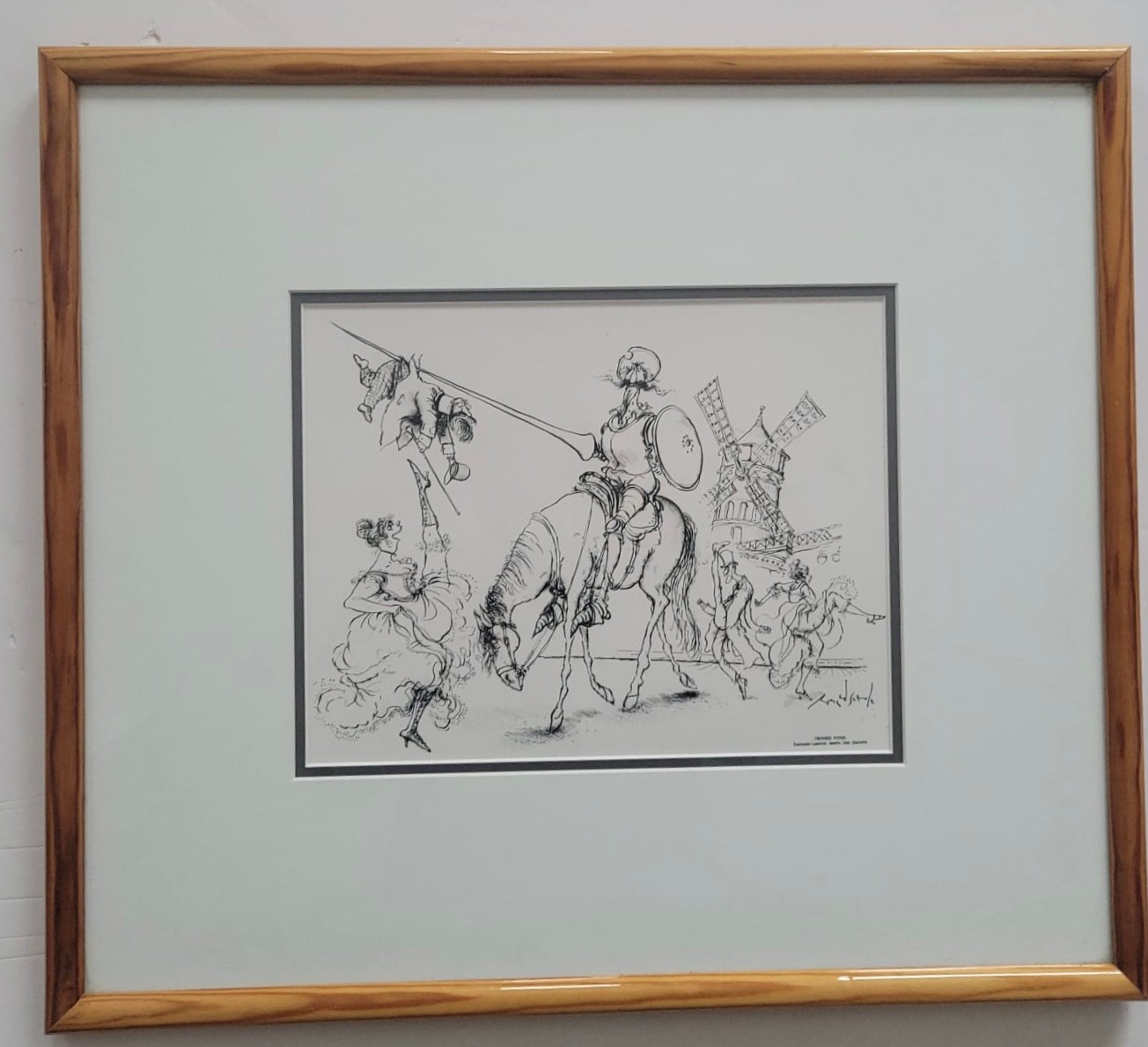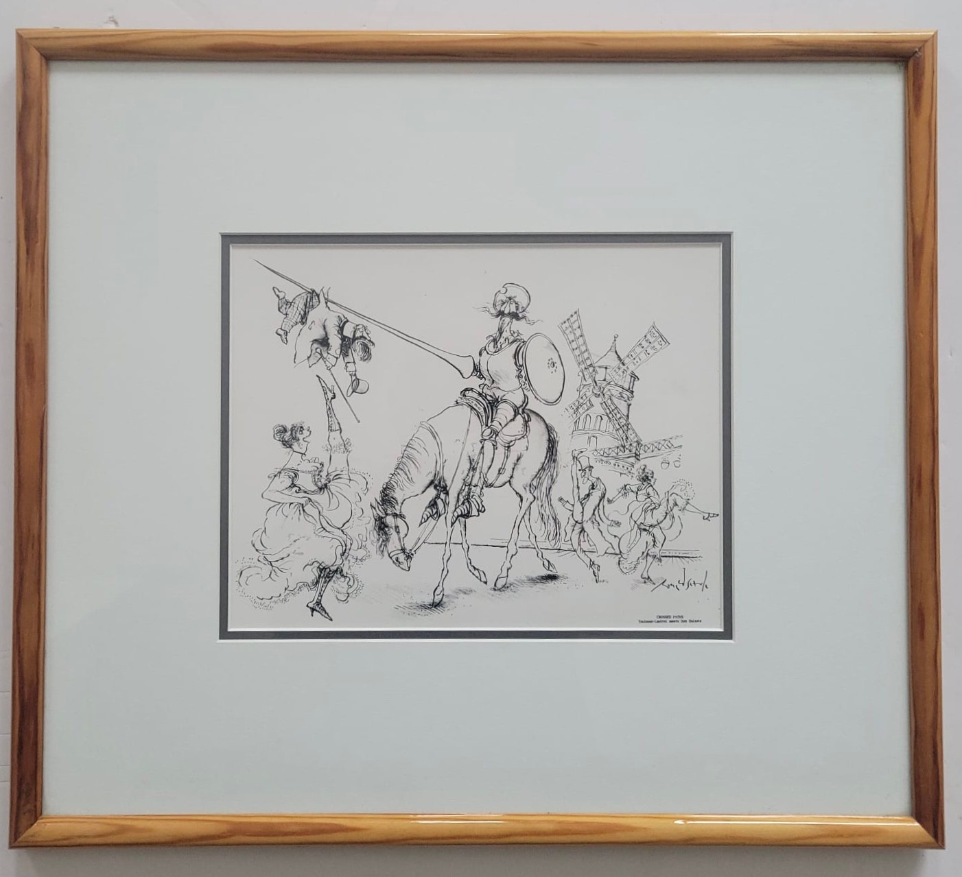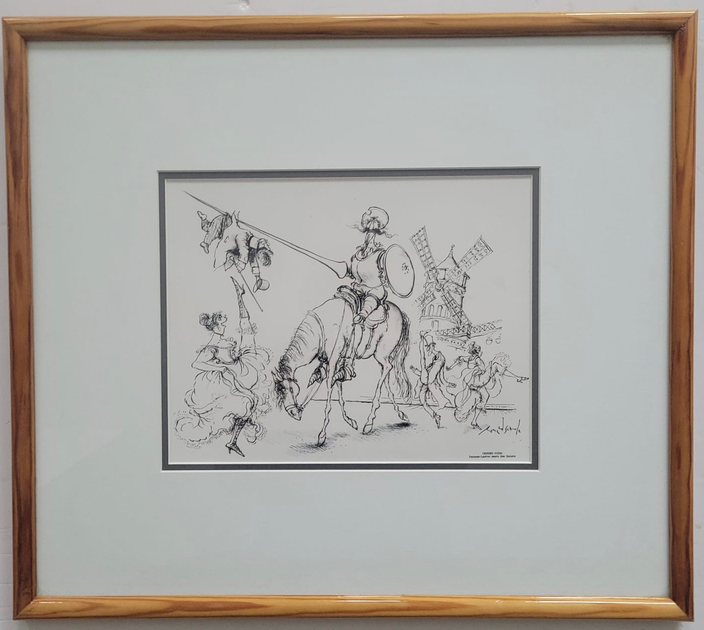 Drawing titled Crossed Paths: Toulouse-Lautrec Meets Don Quixote by the British artist and cartoonist Ronald Searle. This unique piece of black-and-white art masterfully blends the iconic character of Don Quixote with the style and subjects of French artist Henri de Toulouse-Lautrec
