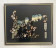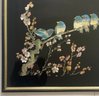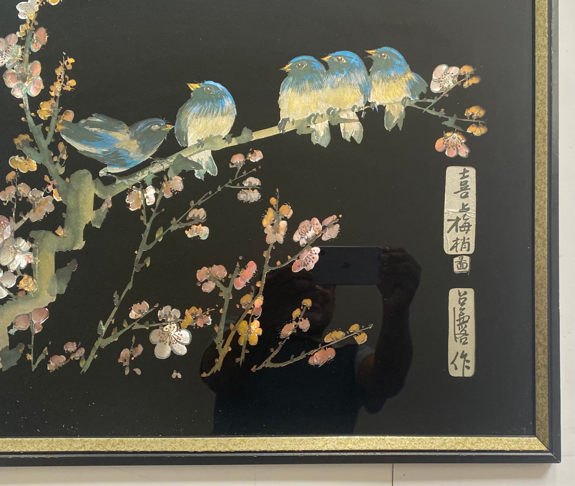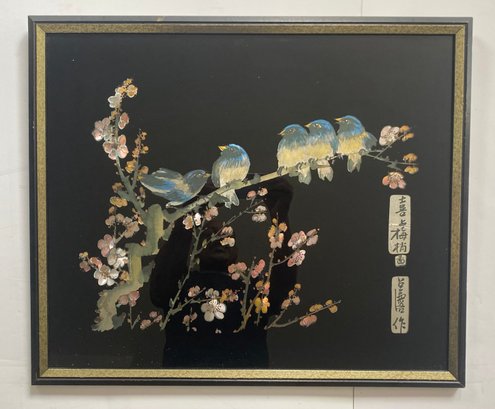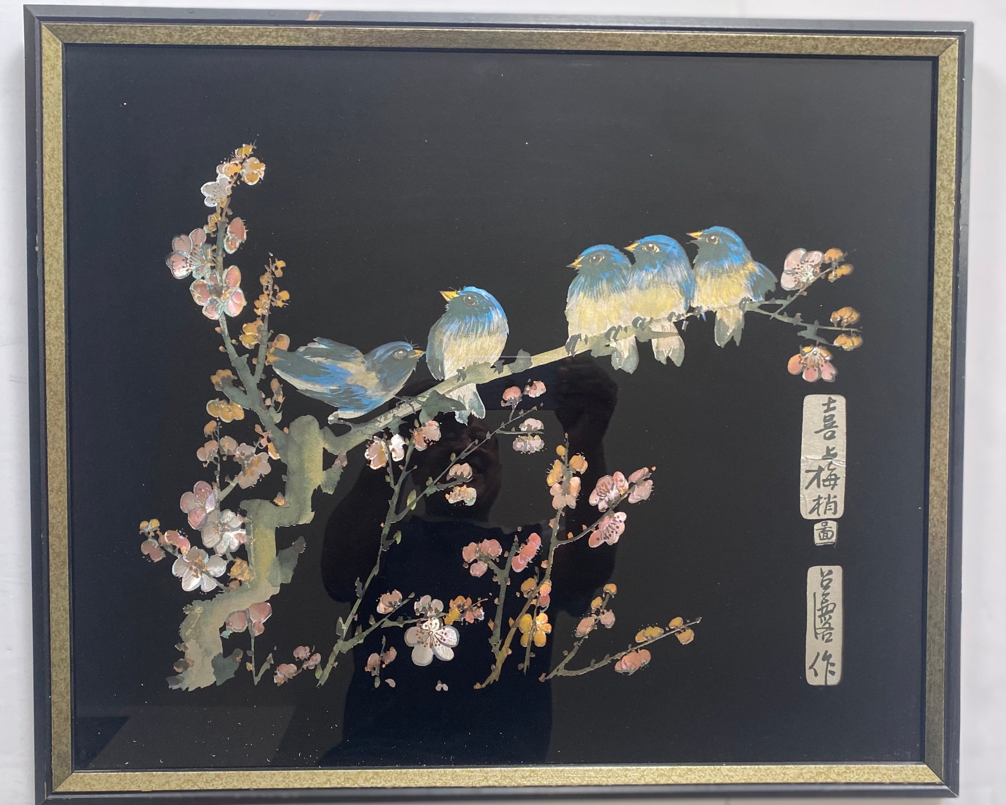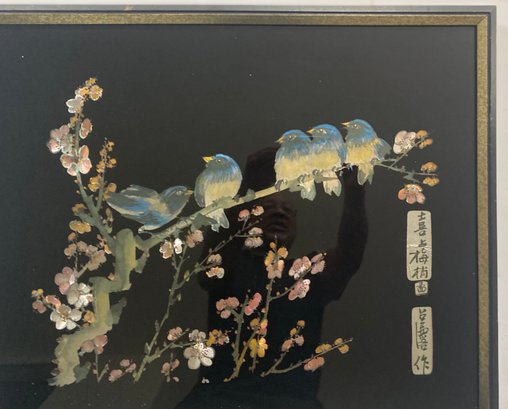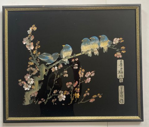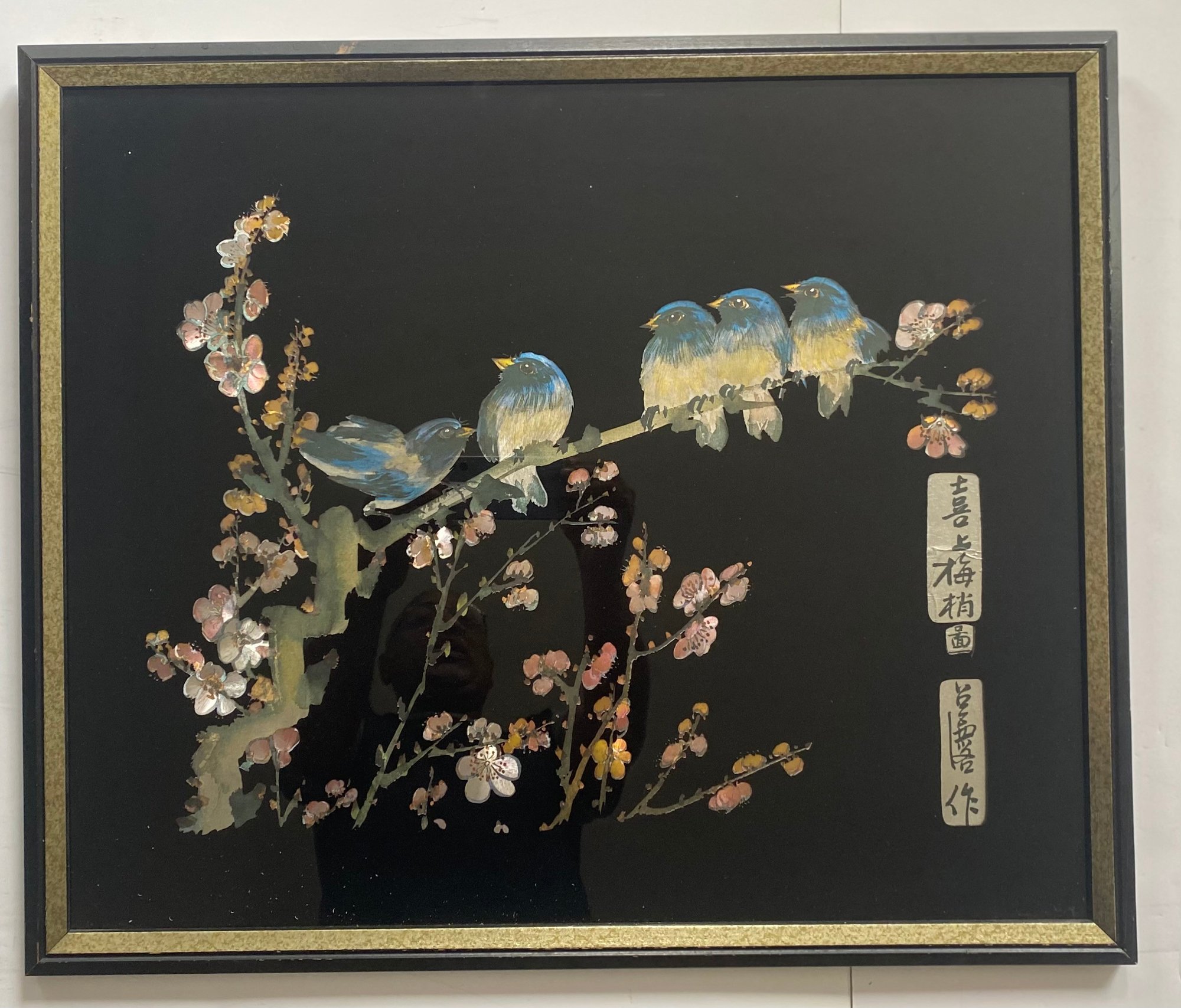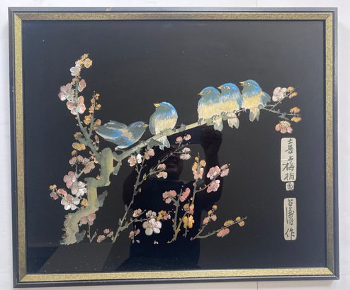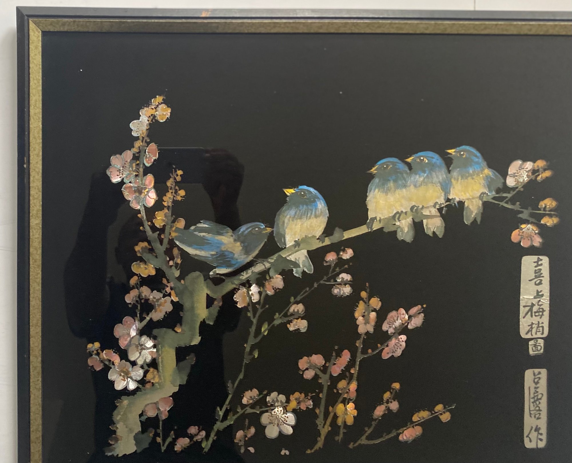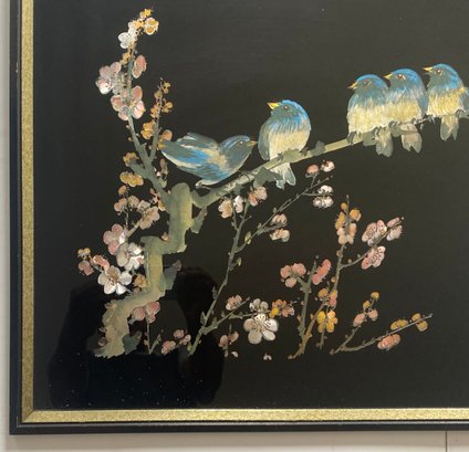 This is a piece of Mother of Pearl Japanese Wall Art, a scene with birds on a blossoming branch, against a black lacquer background.