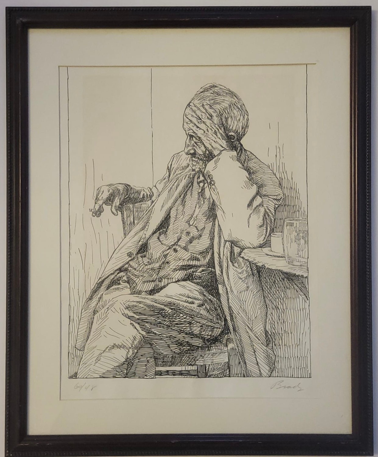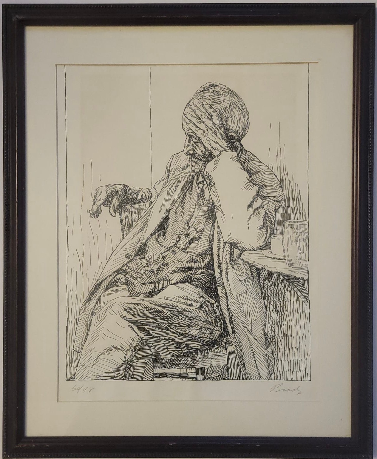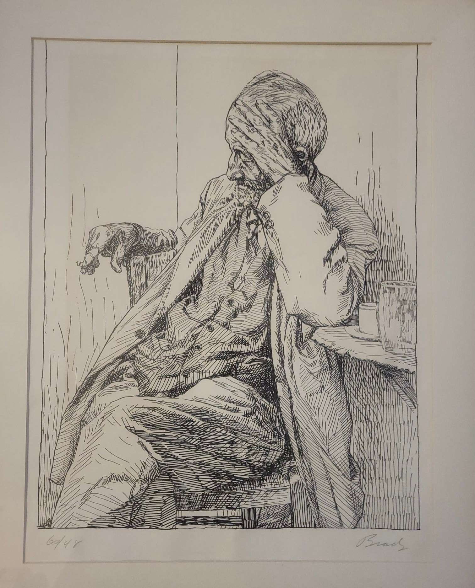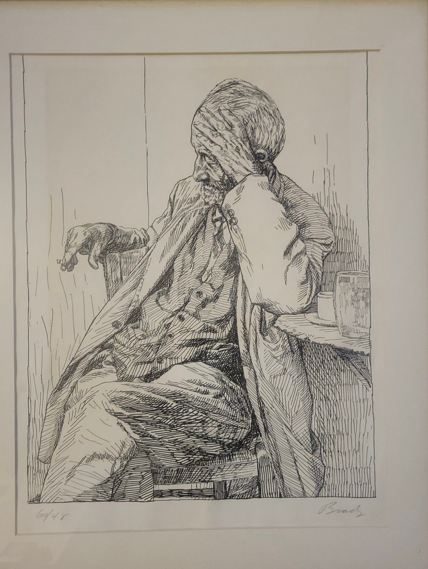 Pencil signed engraving by Brady. The artwork depicts an elderly man smiking and sitting contemplatively at a table, resting his head on his hand, with a mug nearby.