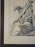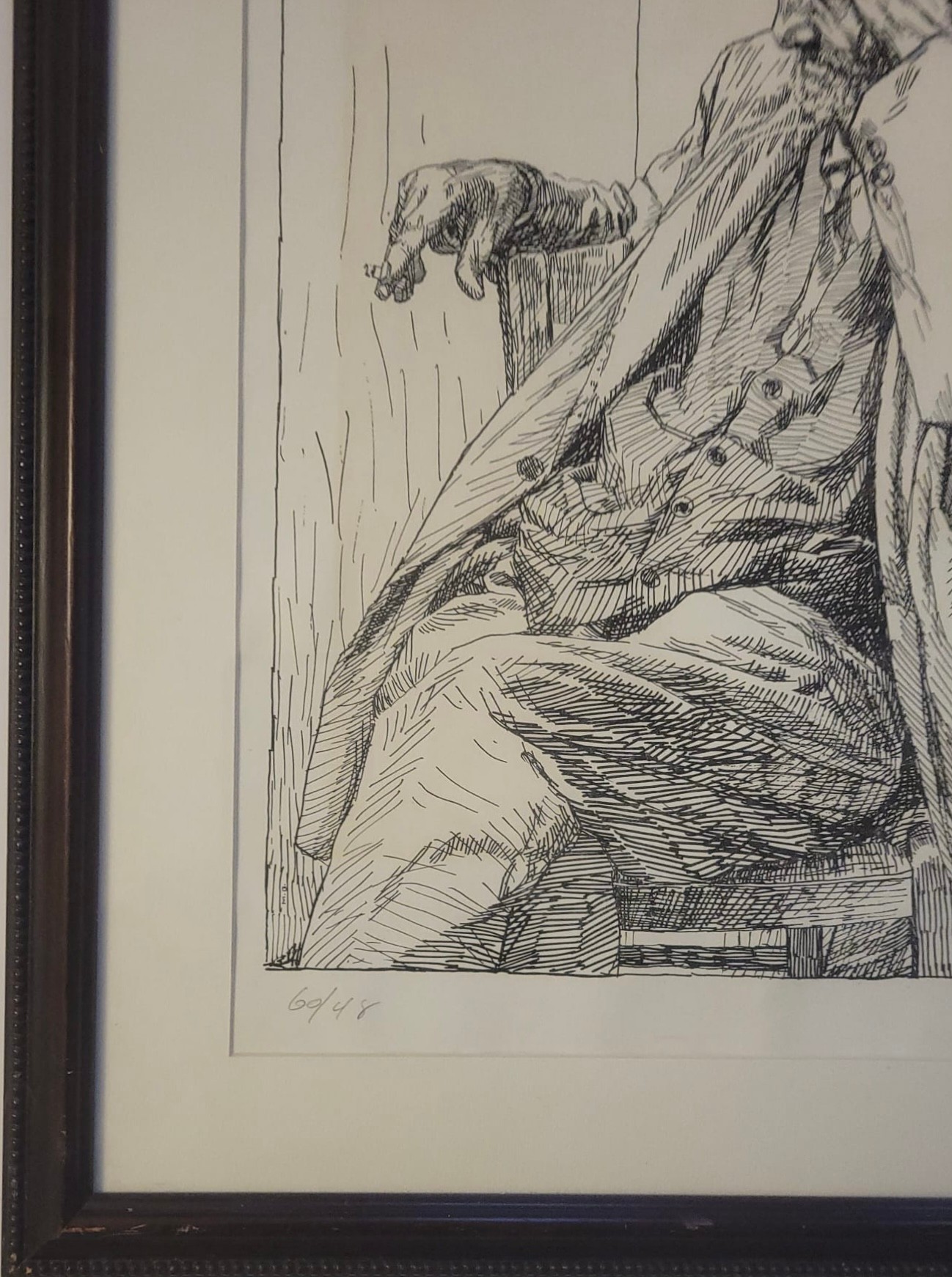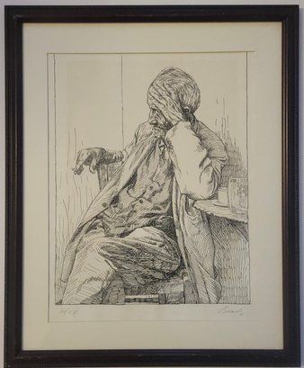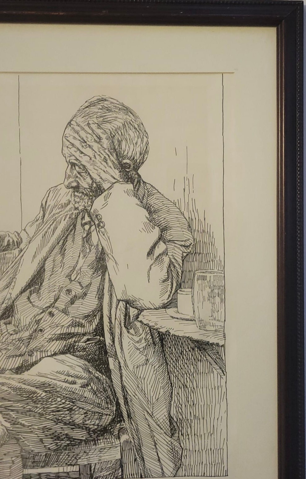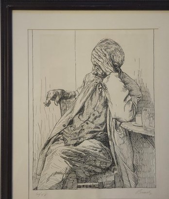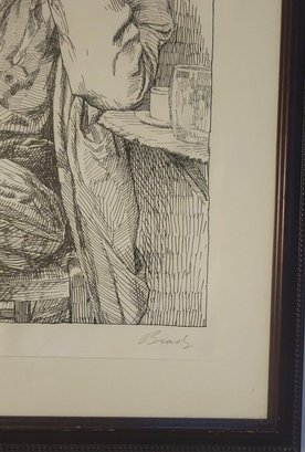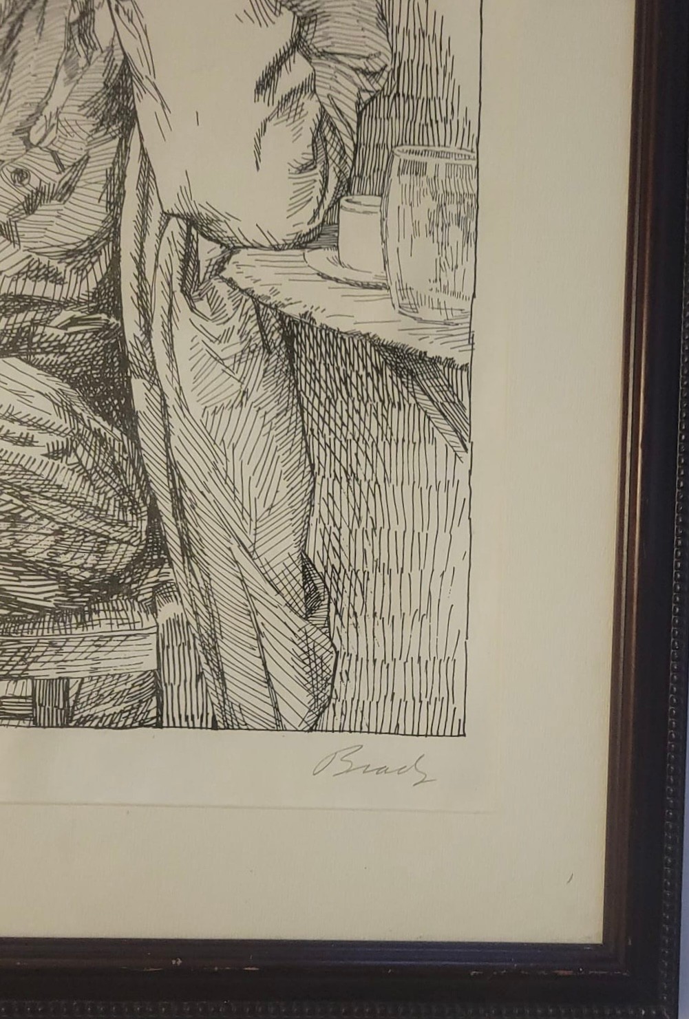 Pencil signed engraving by Brady. The artwork depicts an elderly man smiking and sitting contemplatively at a table, resting his head on his hand, with a mug nearby.