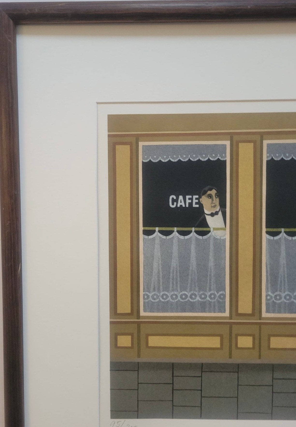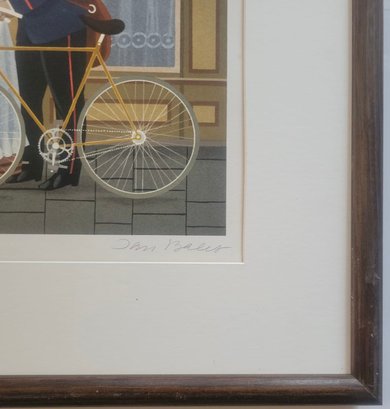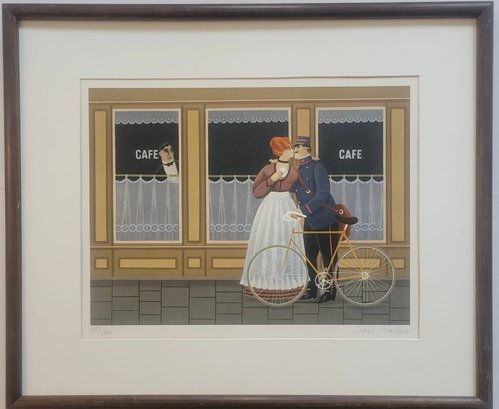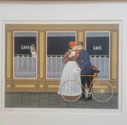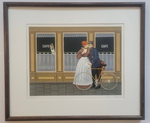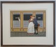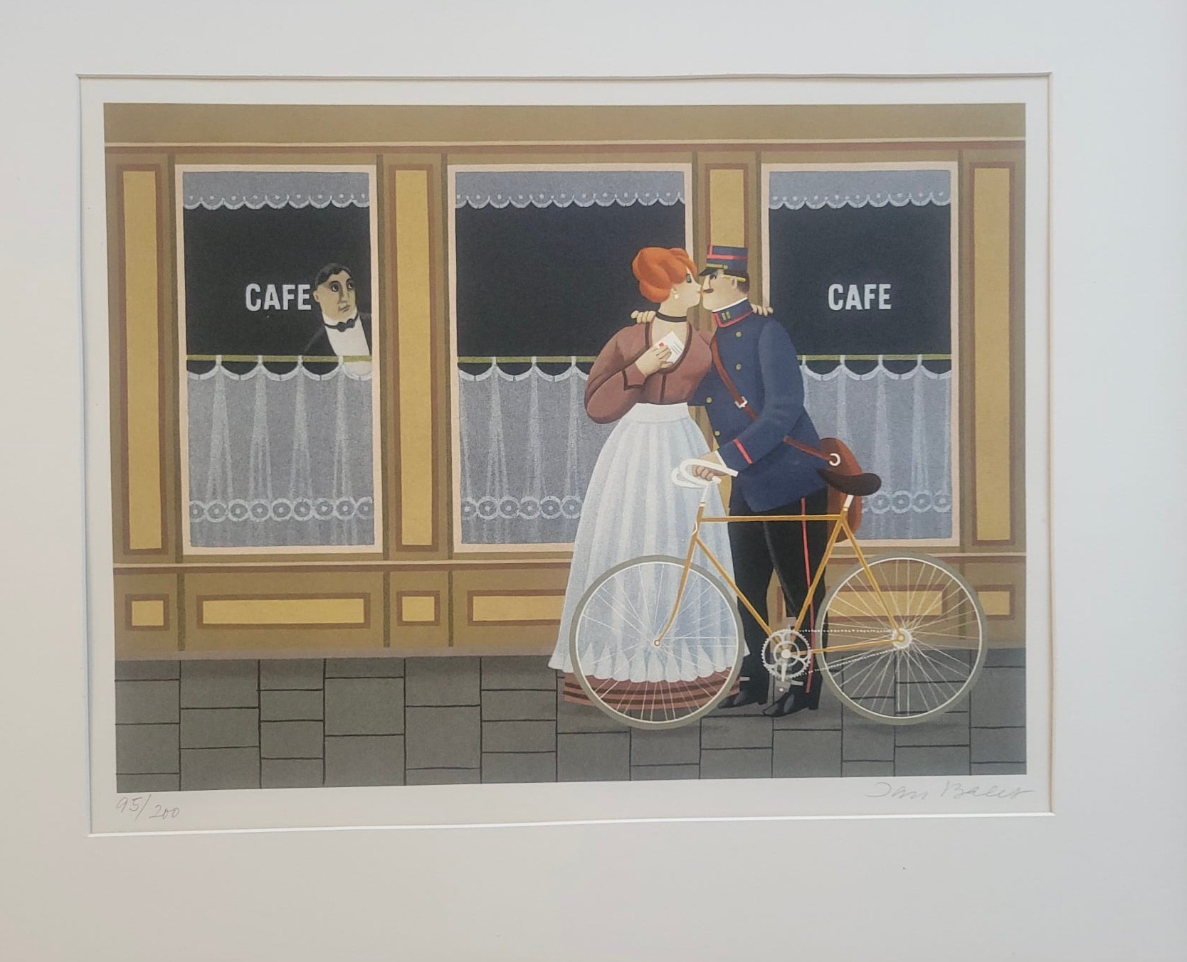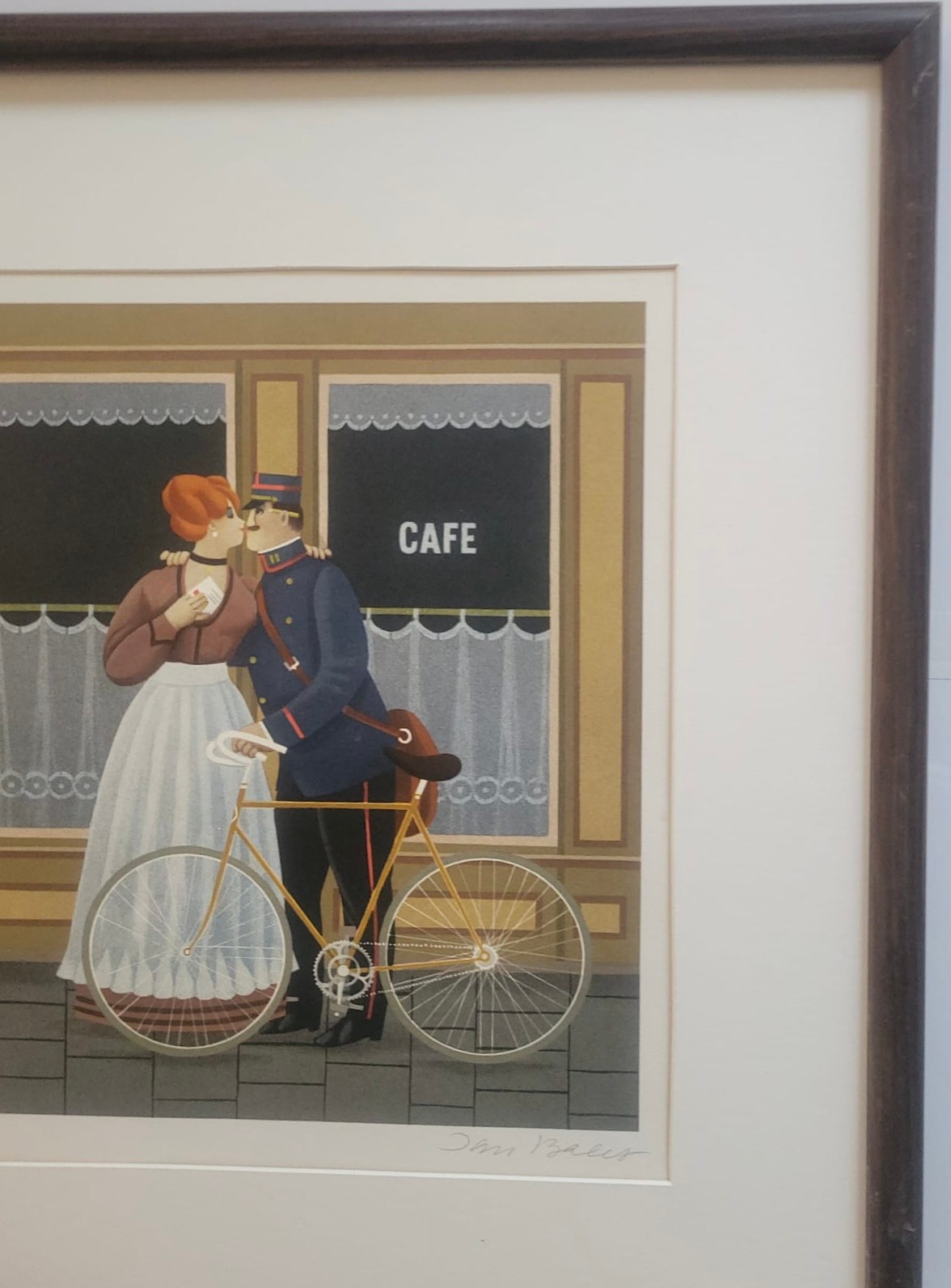 This is a limited edition (95/200) serigraph, titled Stealing a Kiss by the German-American artist Jan Balet (1913-2009). Jan Balet was known for his "naïve" style and satirical, nostalgic depictions of everyday life.