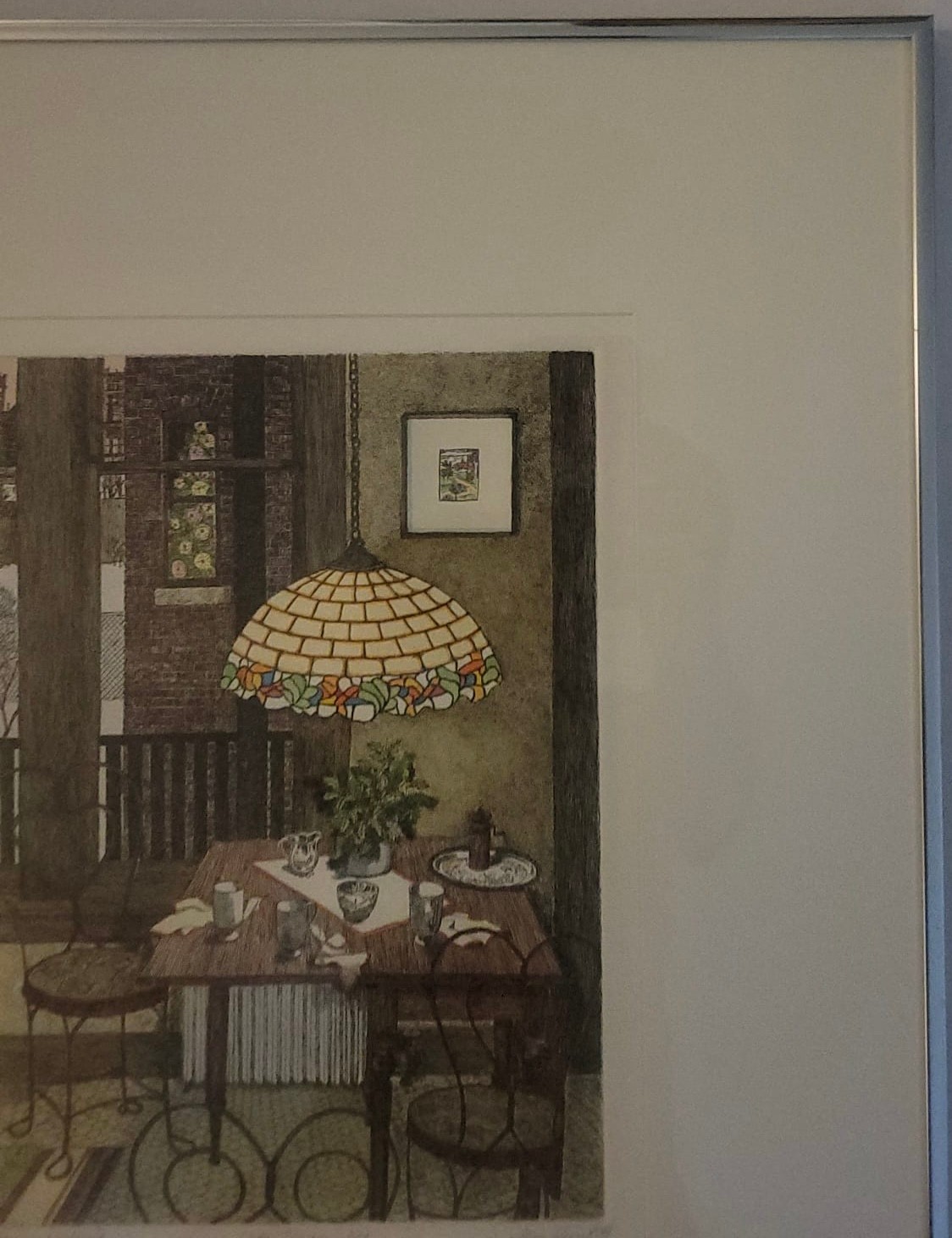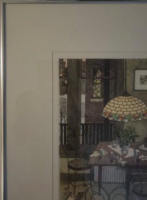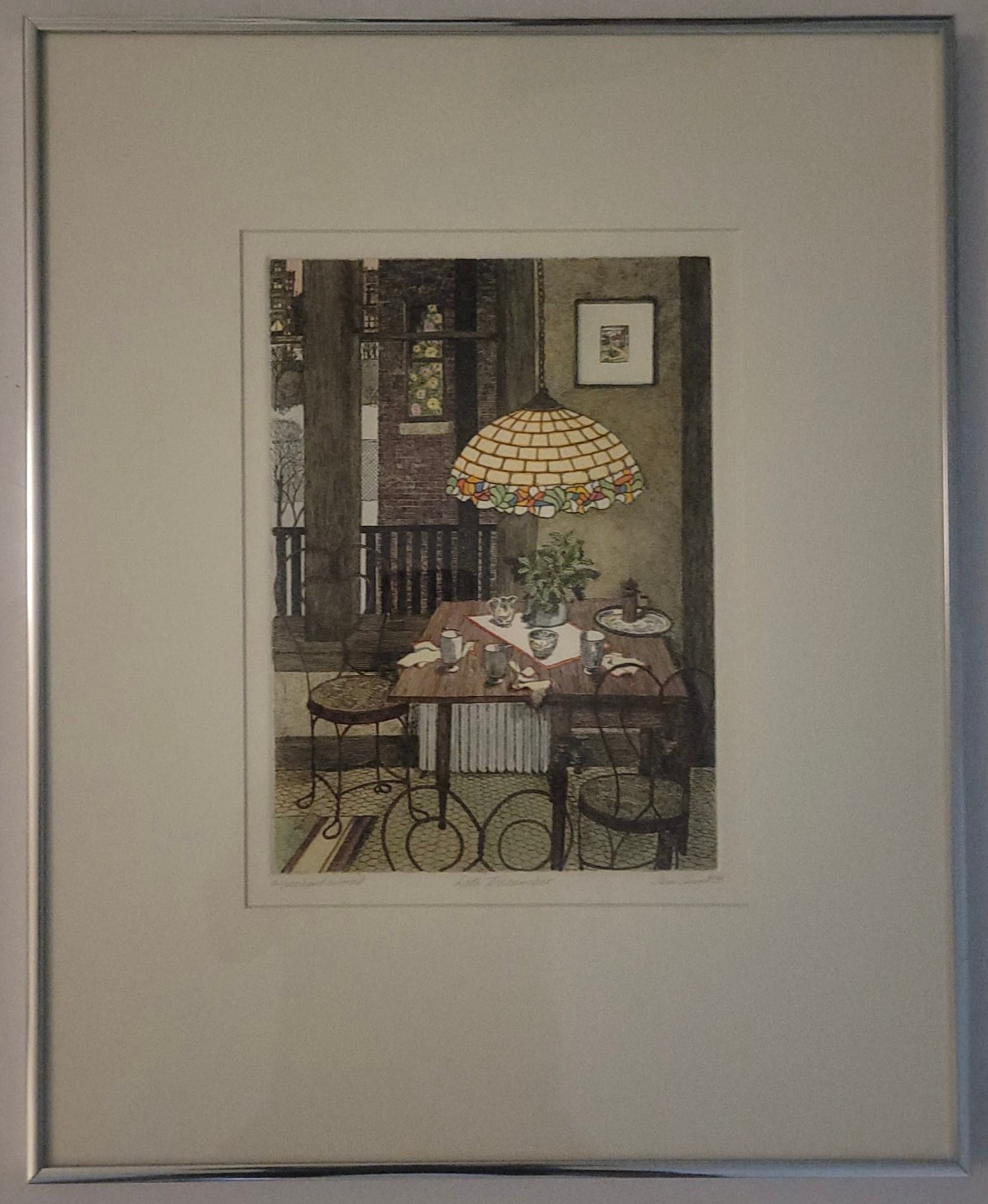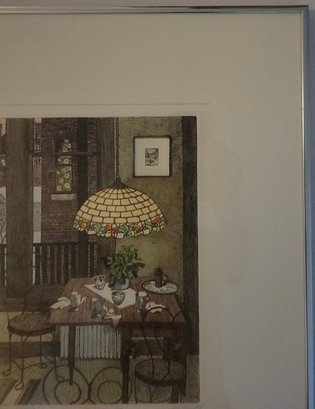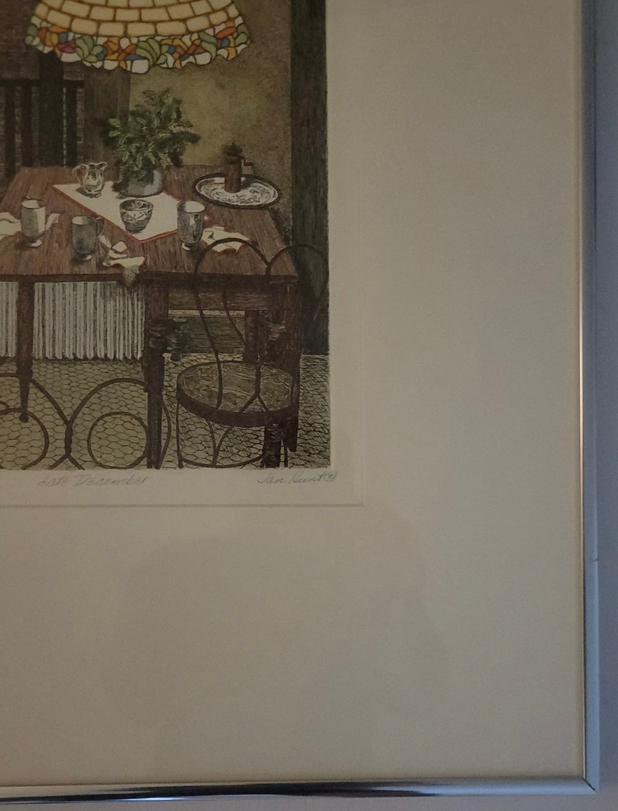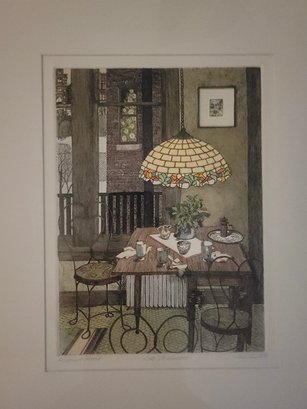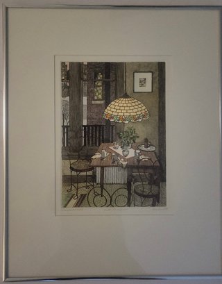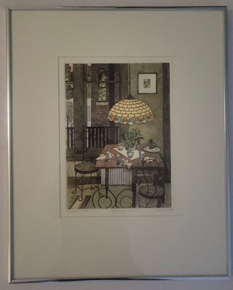 The interior scene depicts a cozy dining area with a distinctive stained-glass, Tiffany-style hanging lamp over a set table, along with metal chairs and a view through a window. Jan Hunt is known for creating luminous hand-colored etchings that evoke a range of emotions and memories through detailed interior scenes.