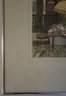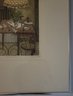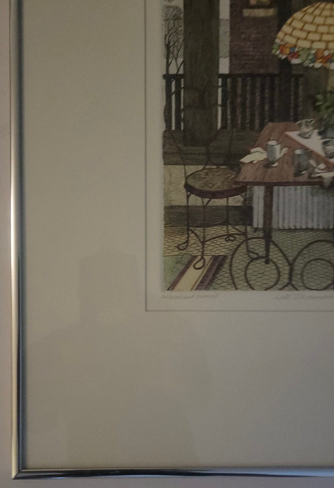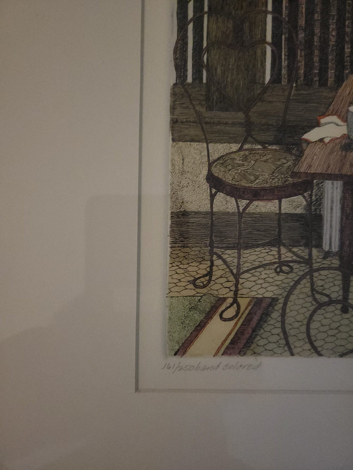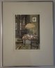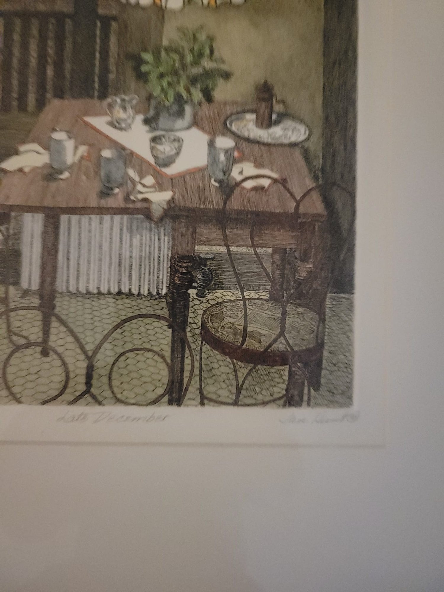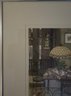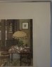 The interior scene depicts a cozy dining area with a distinctive stained-glass, Tiffany-style hanging lamp over a set table, along with metal chairs and a view through a window. Jan Hunt is known for creating luminous hand-colored etchings that evoke a range of emotions and memories through detailed interior scenes.