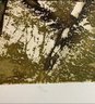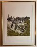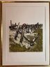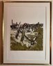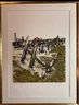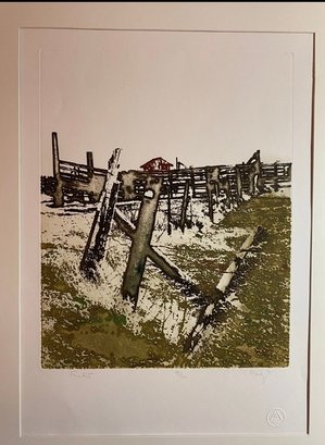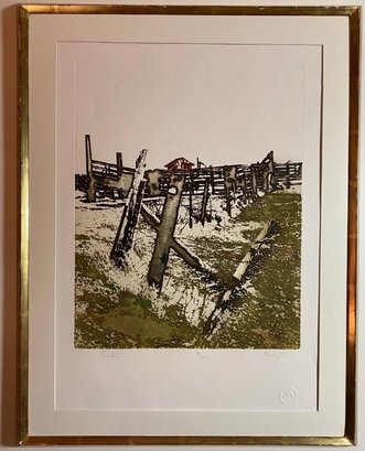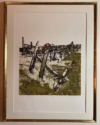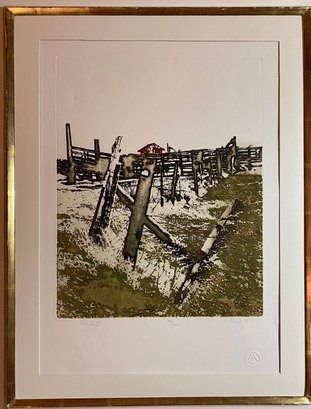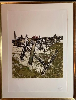 The image shows a pencil-signed monochromatic etching by the artist Maidy Morhous, titled "Fence Posts". The etching is framed in a gold-colored frame with a single mat.