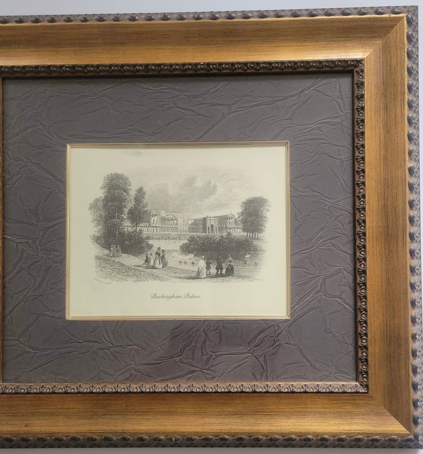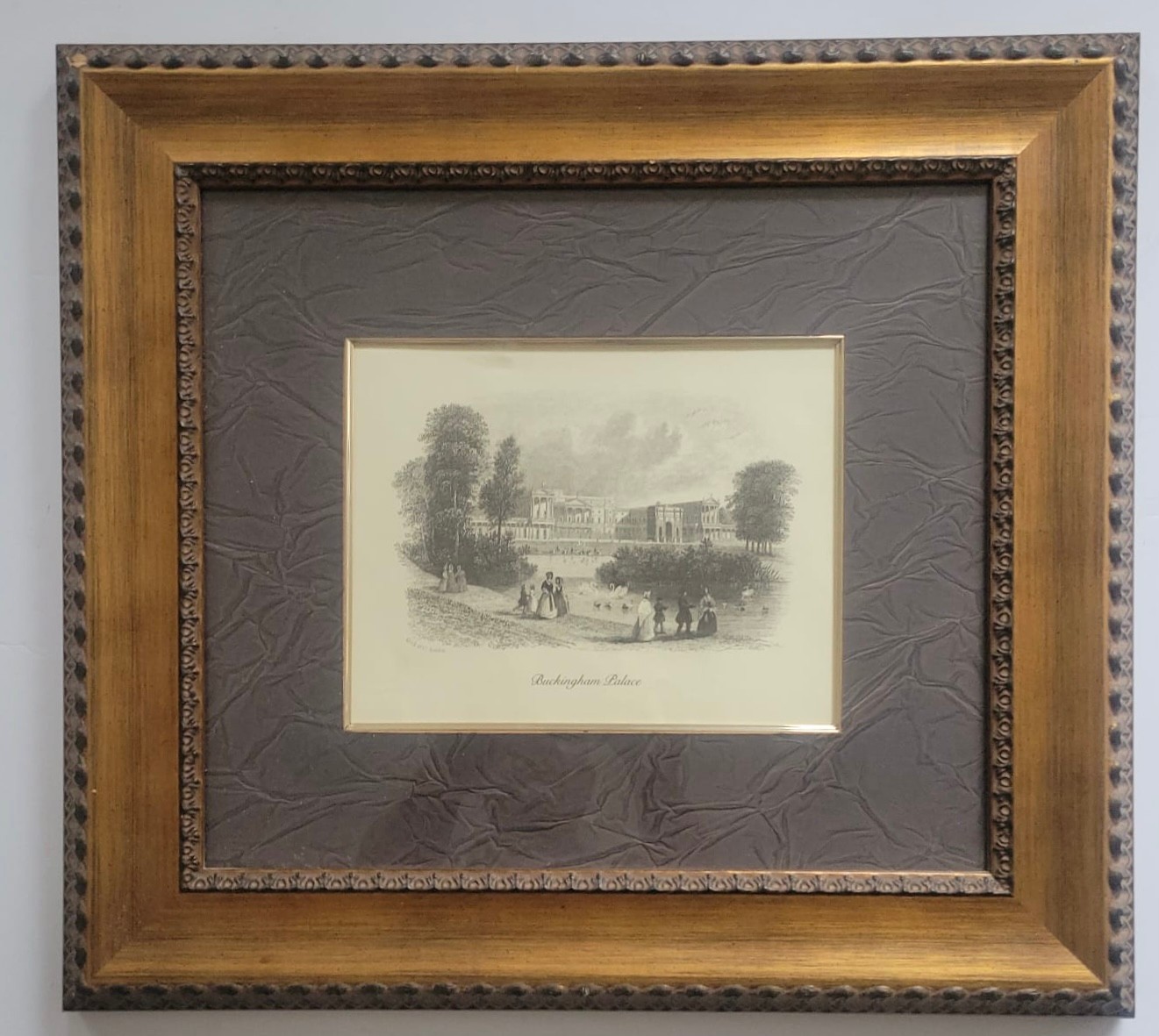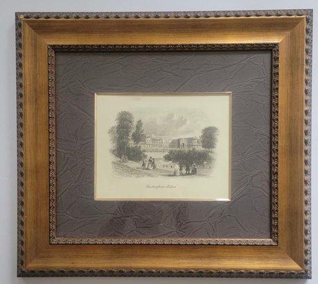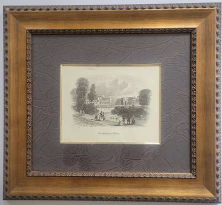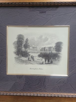 Framed engraving depicting Buckingham Palace, likely originating from the 19th or early 20th century